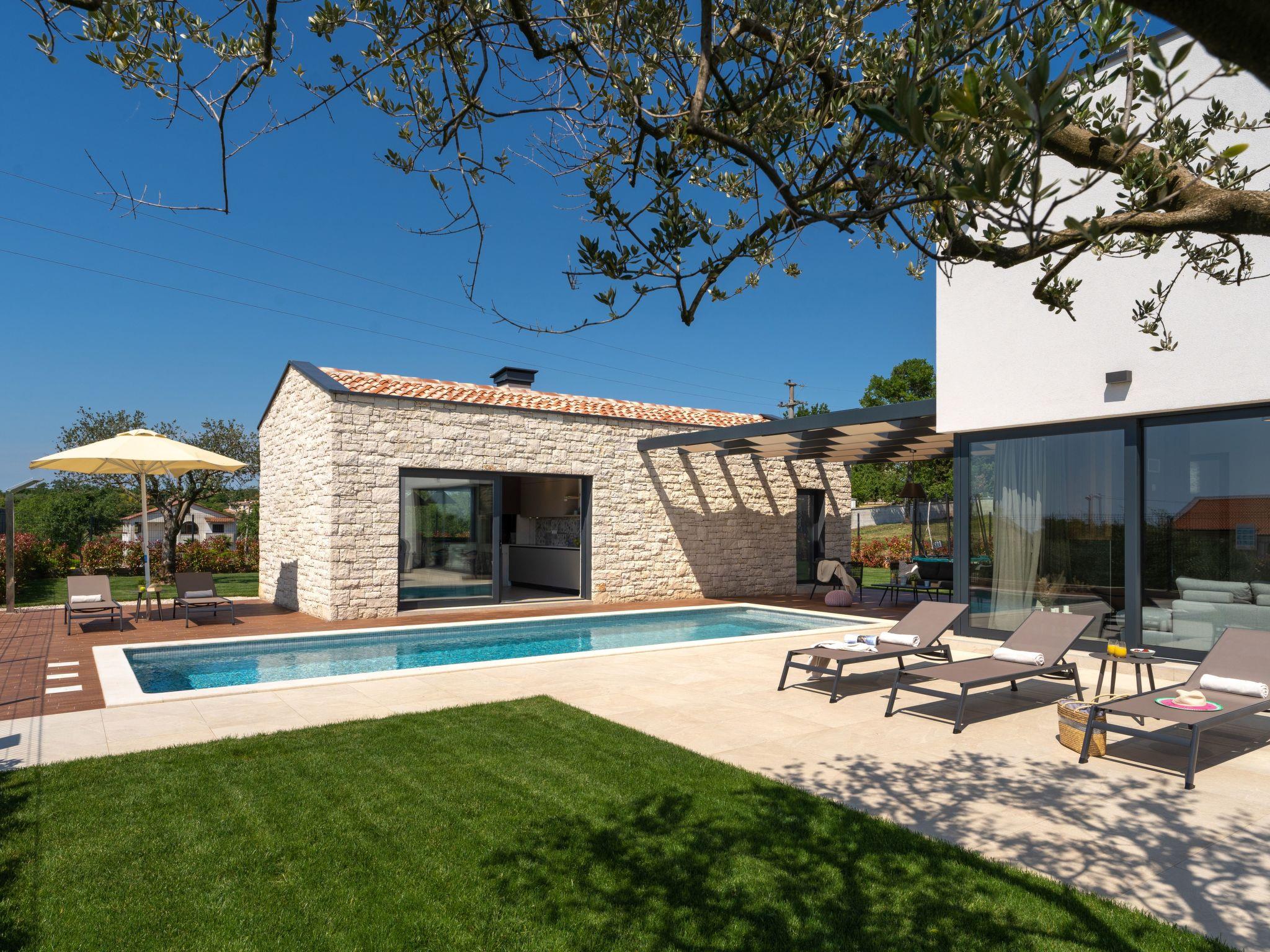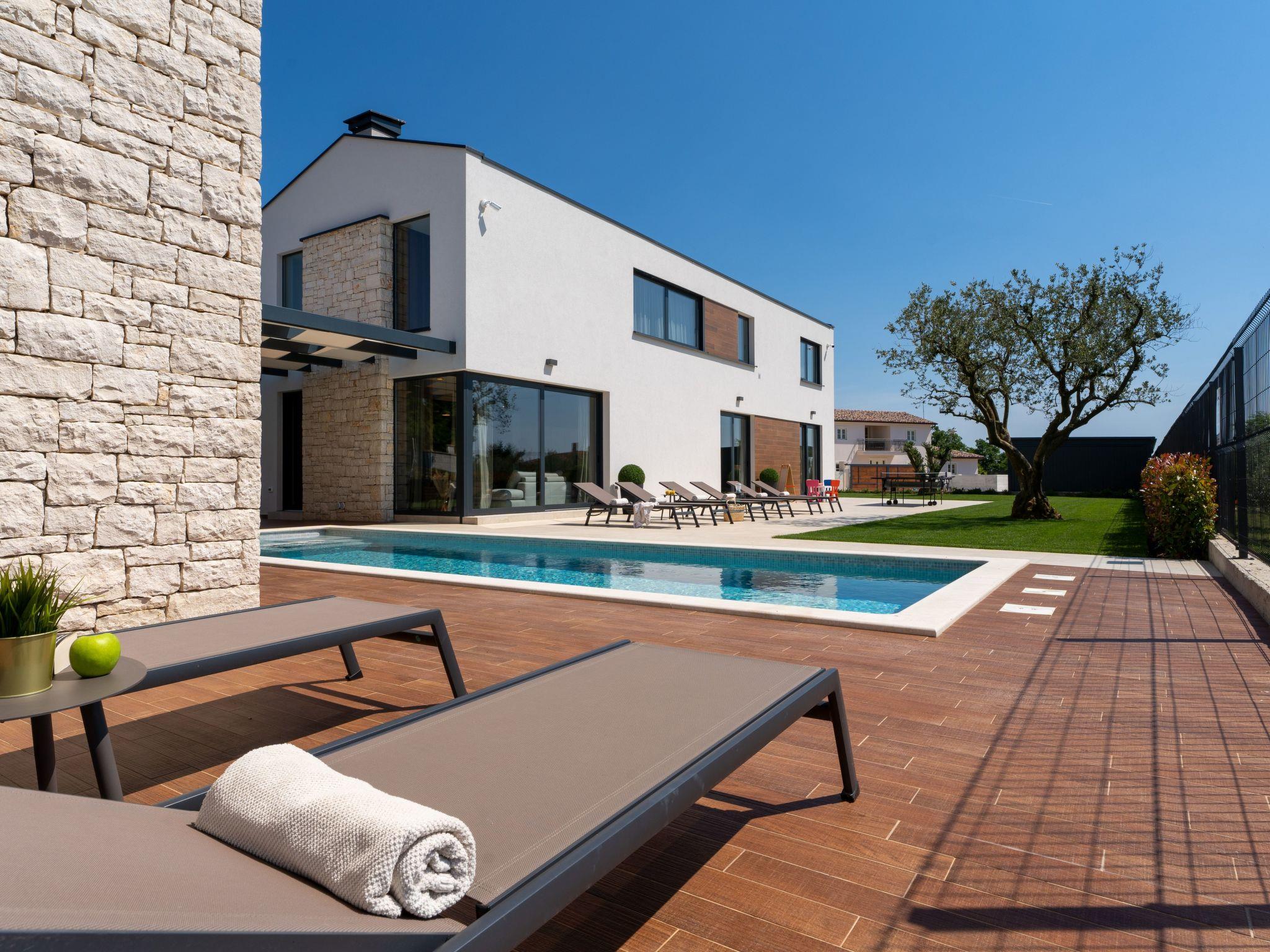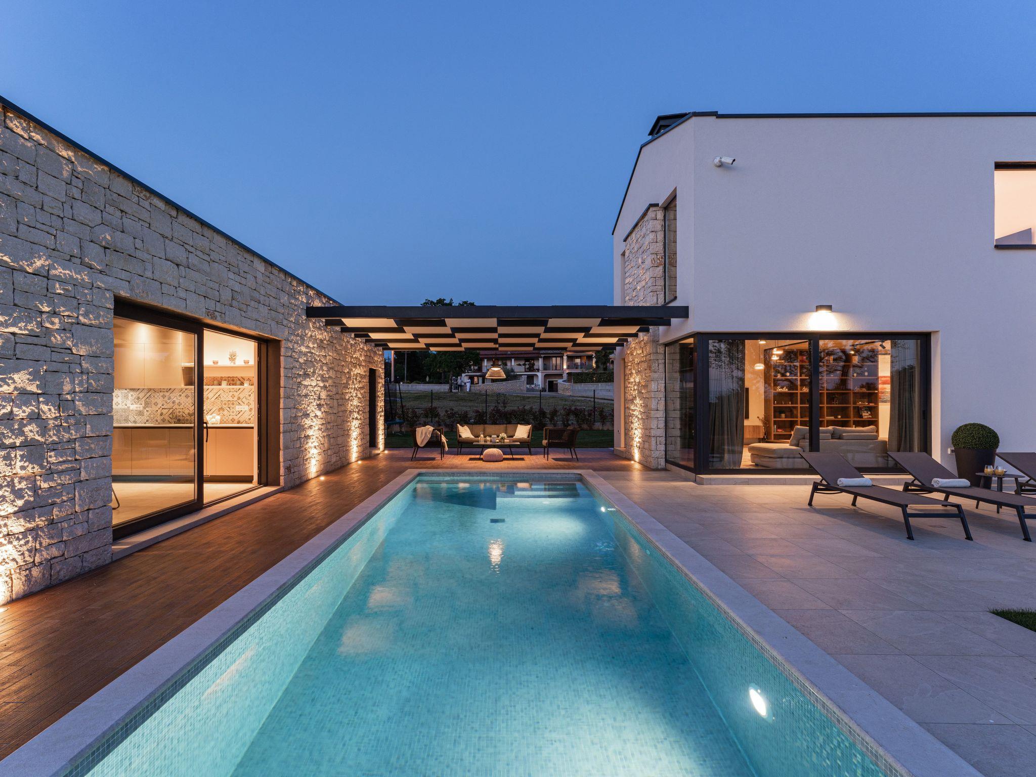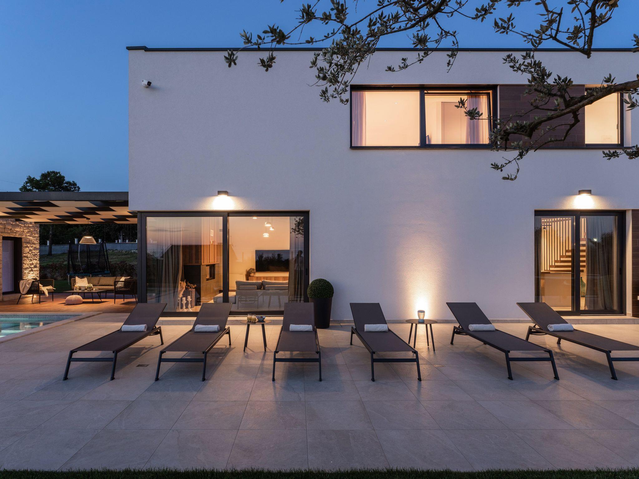 Villa Ansi Exclusive is a luxurious modern holiday home in small village Anzici near charming hill town Višnjan in central Istria. Numerous sights in Porec, Novigrad, Motovun, Pazin are nearby. The house is situated on a fenced 1580 square metre plot and offers guests the following outdoor facilities: 30 square metre pool, sun loungers, well-kept lawn, summer kitchen with barbecue fireplace, covered spacious terrace by the pool and several parking spaces. In the large outdoor area you will also find play facilities for the little ones, a table tennis table and 6 bicycles. The wonderful wellness area with Finnish sauna and indoor whirlpool are also there for relaxation and for those who prefer to spend their holidays in the not too hot months before or after the season, the pool can be heated on request.