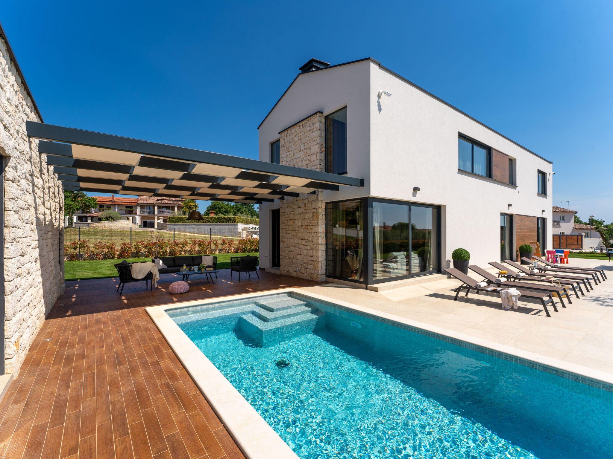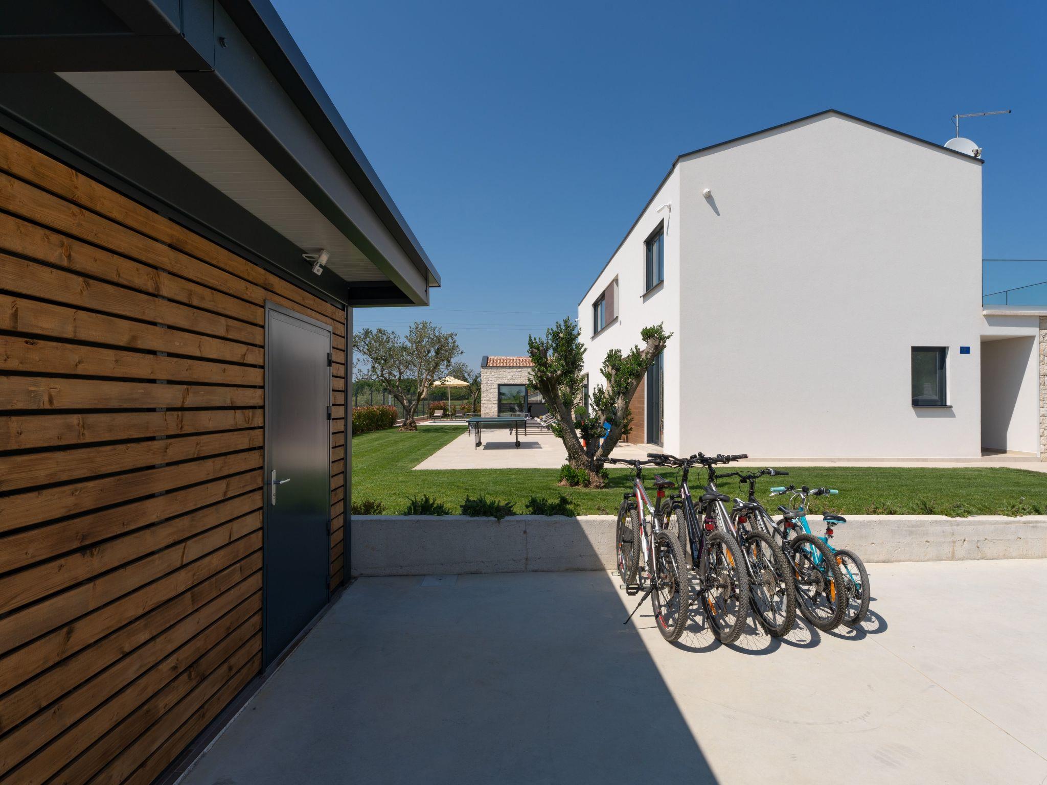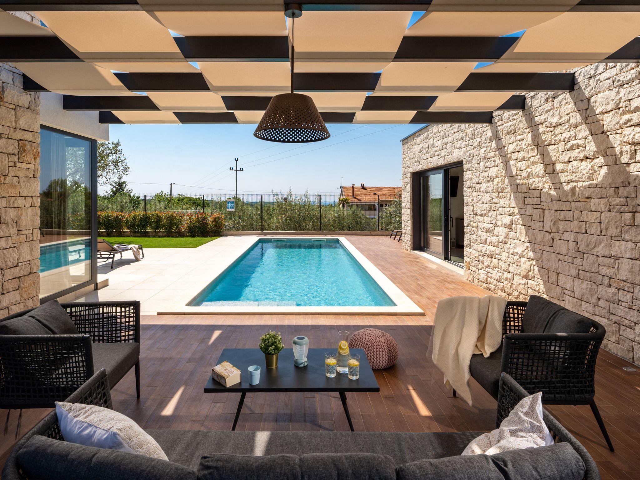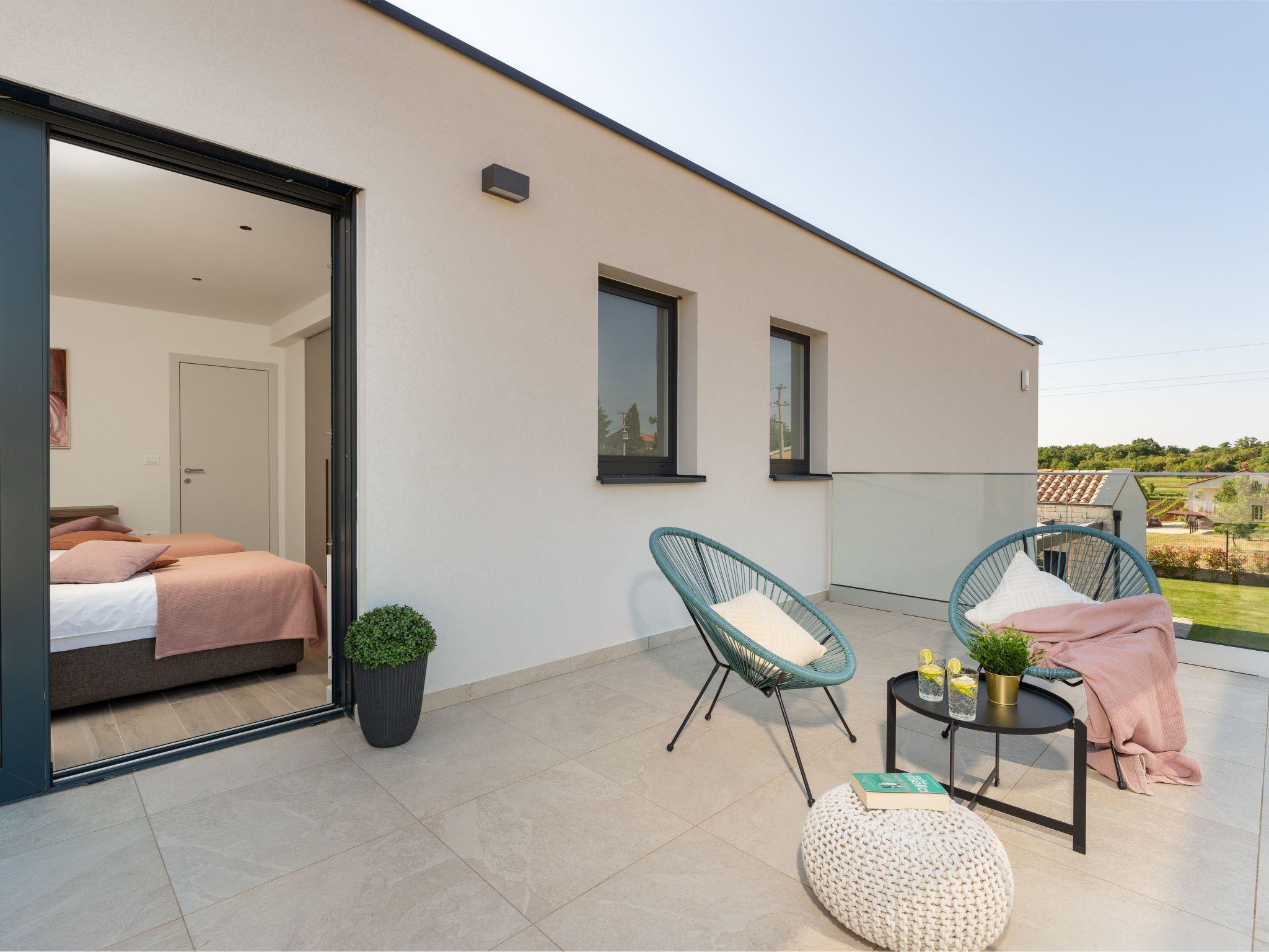 Villa Ansi Exclusive is a luxurious modern holiday home in small village Anzici near charming hill town Višnjan in central Istria. Numerous sights in Porec, Novigrad, Motovun, Pazin are nearby. The house is situated on a fenced 1580 square metre plot and offers guests the following outdoor facilities: 30 square metre pool, sun loungers, well-kept lawn, summer kitchen with barbecue fireplace, covered spacious terrace by the pool and several parking spaces. In the large outdoor area you will also find play facilities for the little ones, a table tennis table and 6 bicycles. The wonderful wellness area with Finnish sauna and indoor whirlpool are also there for relaxation and for those who prefer to spend their holidays in the not too hot months before or after the season, the pool can be heated on request.