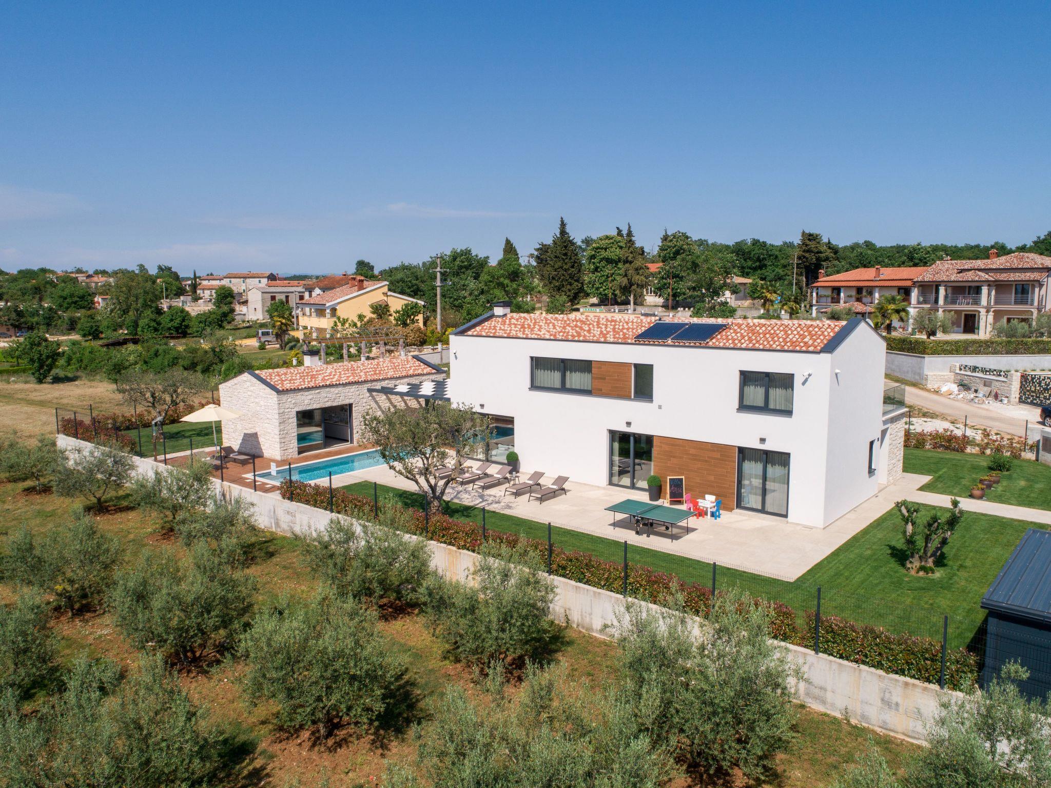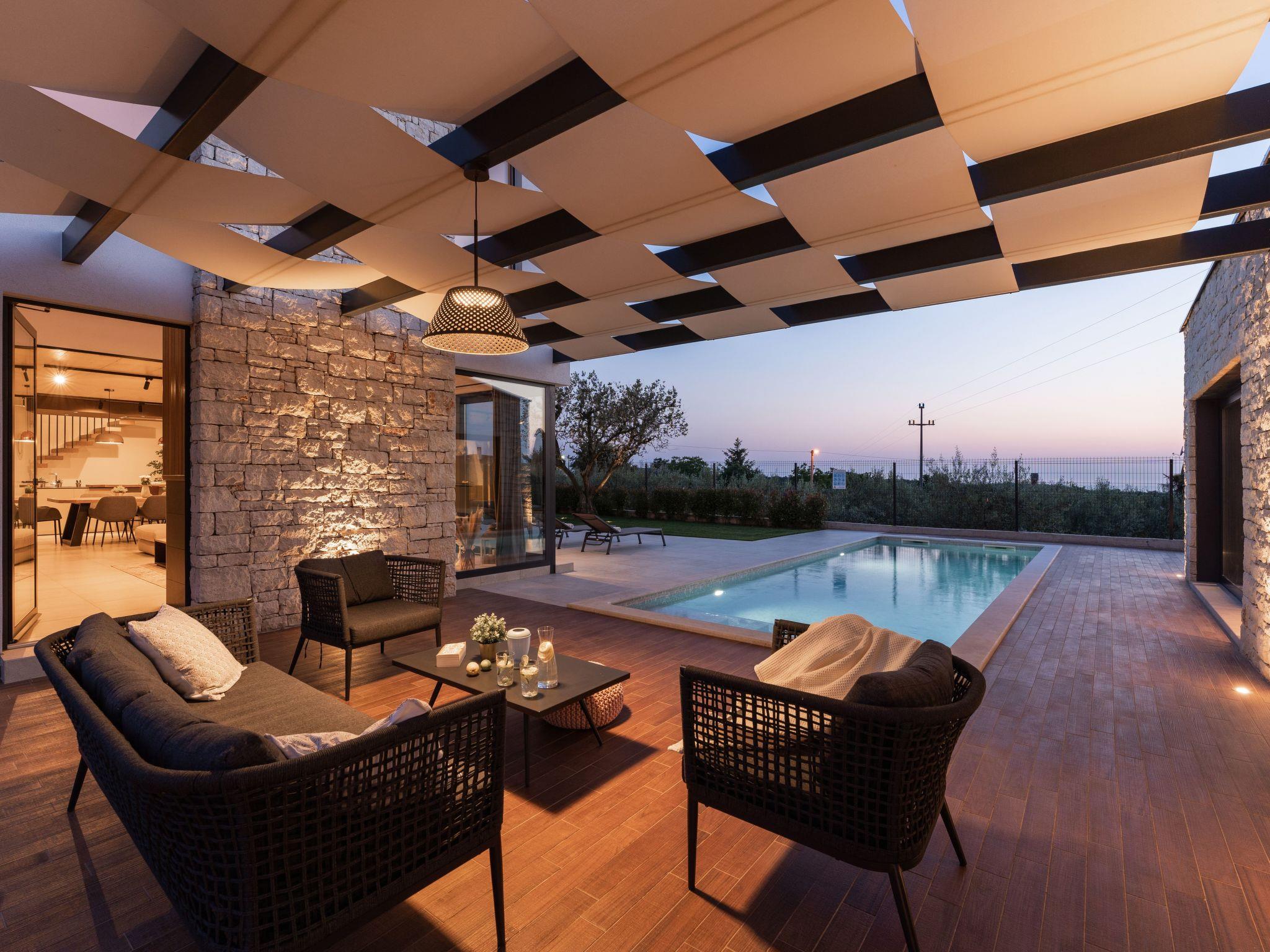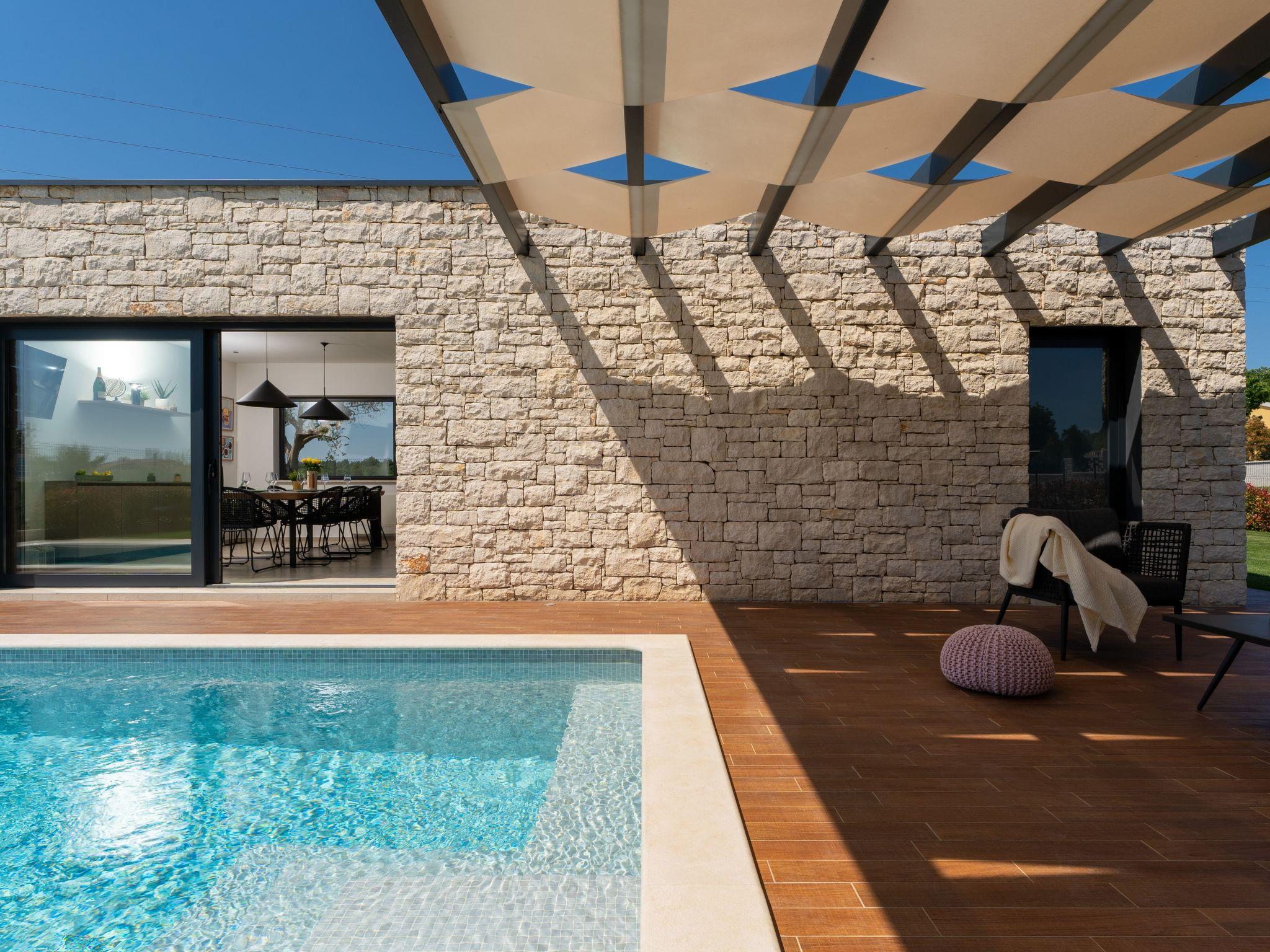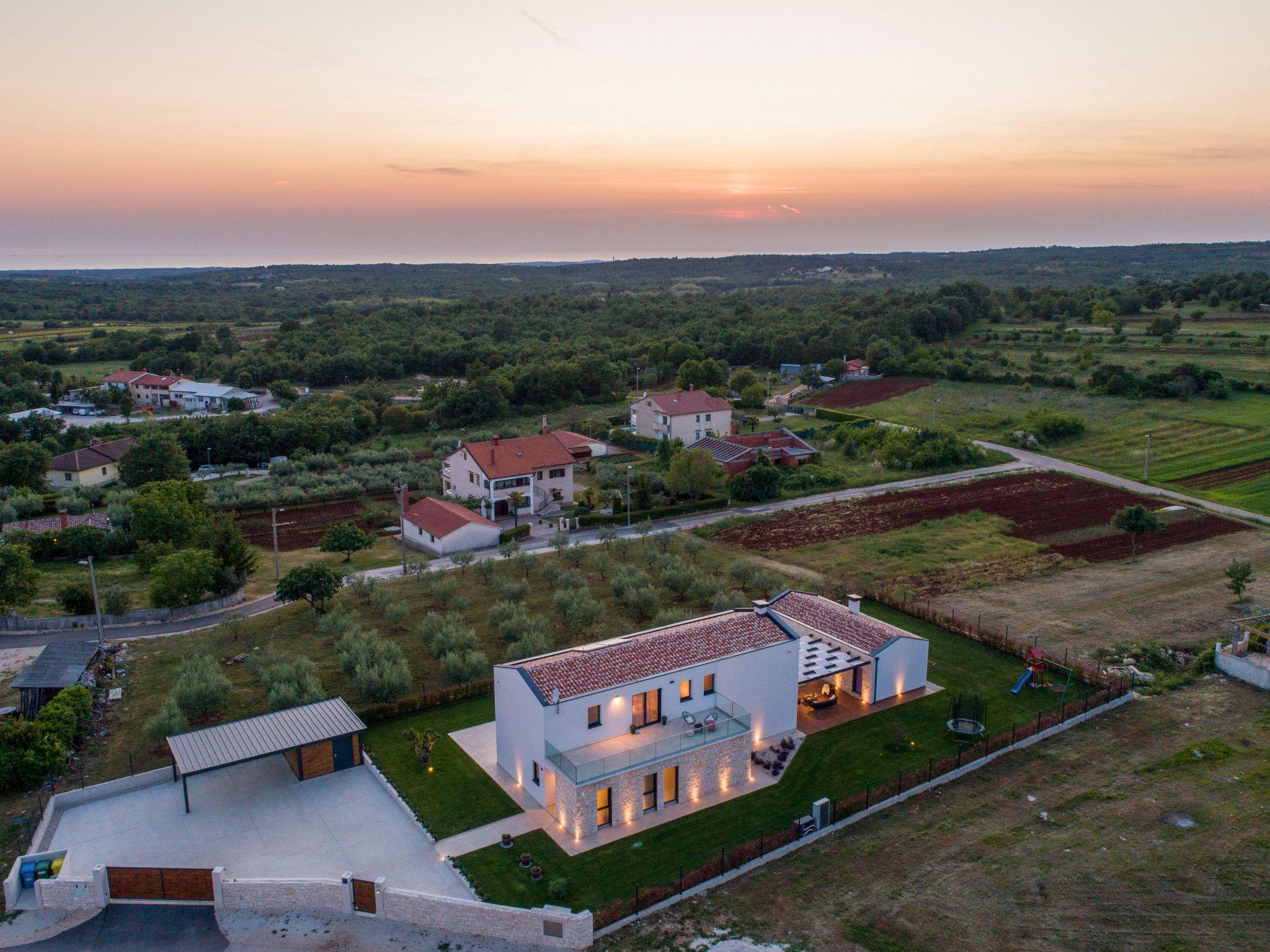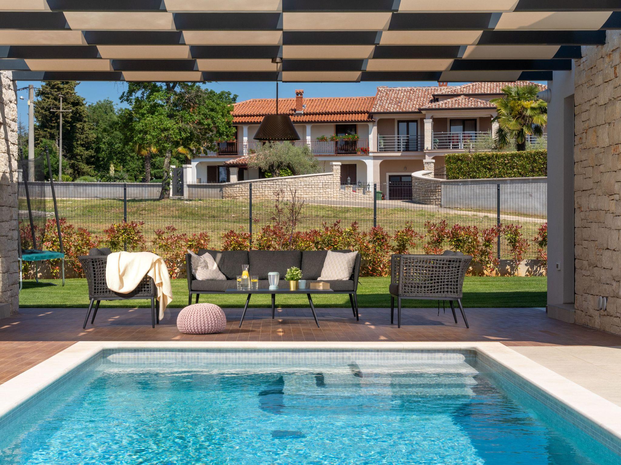 Villa Ansi Exclusive is a luxurious modern holiday home in small village Anzici near charming hill town Višnjan in central Istria. Numerous sights in Porec, Novigrad, Motovun, Pazin are nearby. The house is situated on a fenced 1580 square metre plot and offers guests the following outdoor facilities: 30 square metre pool, sun loungers, well-kept lawn, summer kitchen with barbecue fireplace, covered spacious terrace by the pool and several parking spaces. In the large outdoor area you will also find play facilities for the little ones, a table tennis table and 6 bicycles. The wonderful wellness area with Finnish sauna and indoor whirlpool are also there for relaxation and for those who prefer to spend their holidays in the not too hot months before or after the season, the pool can be heated on request.