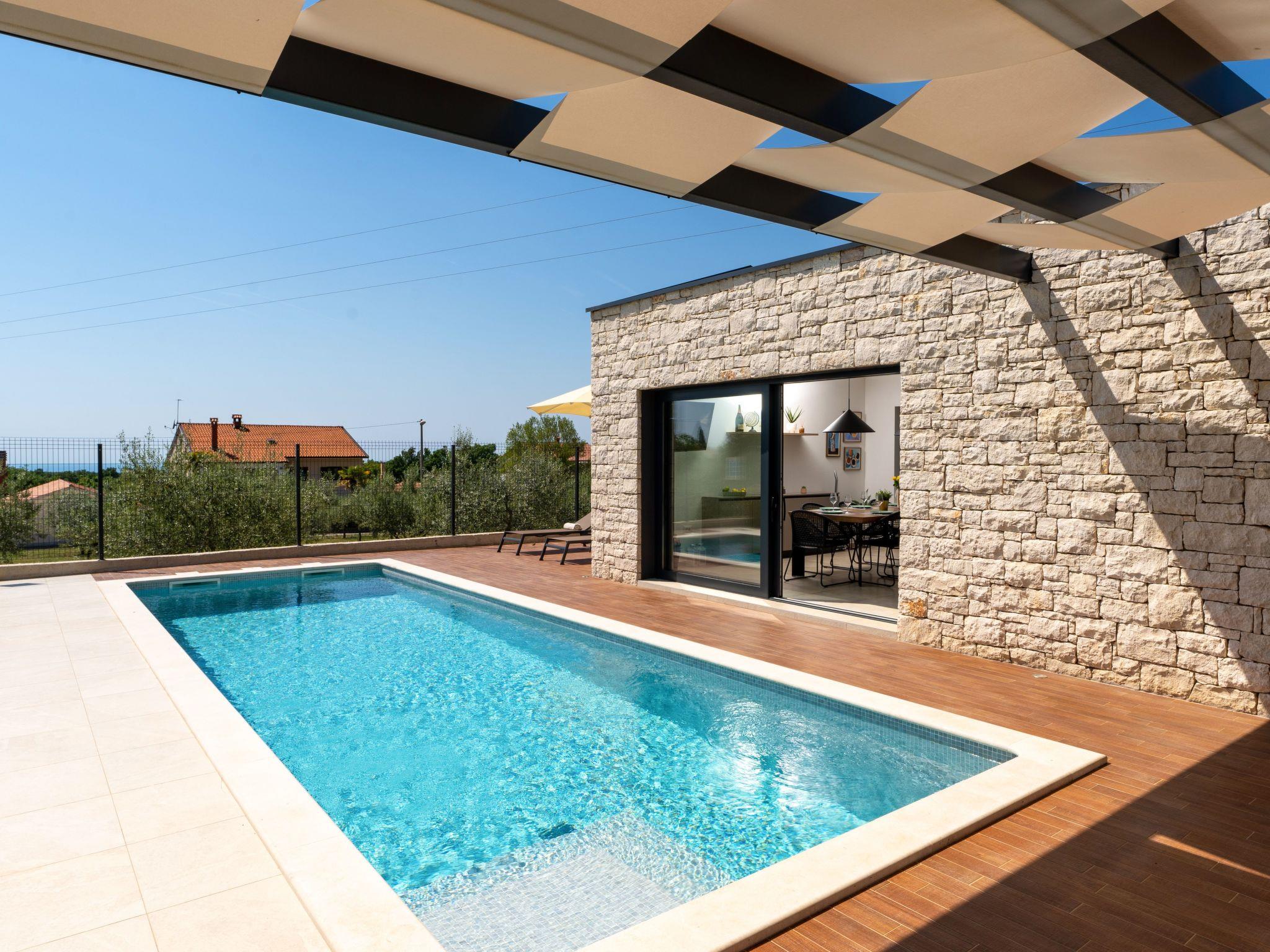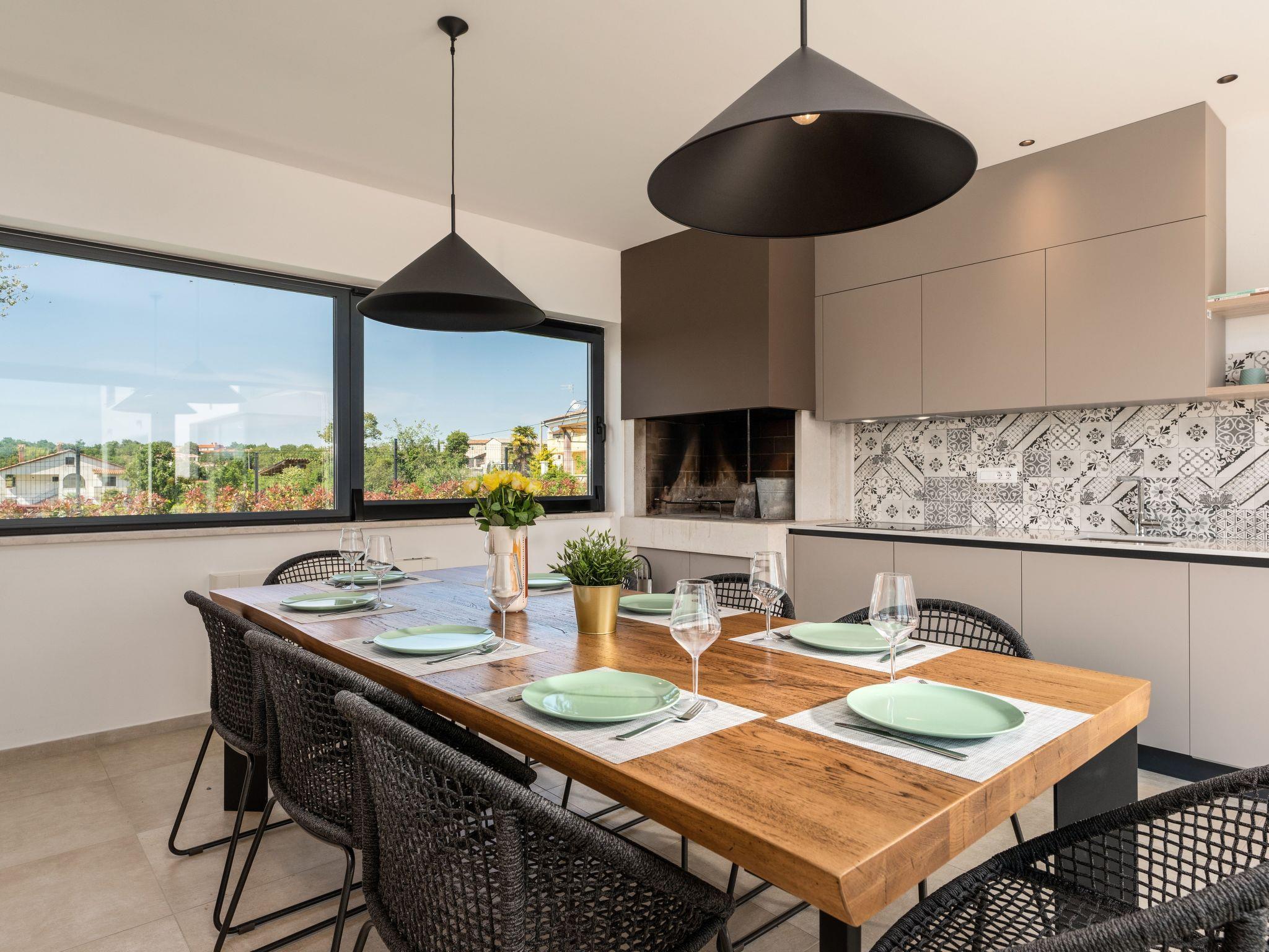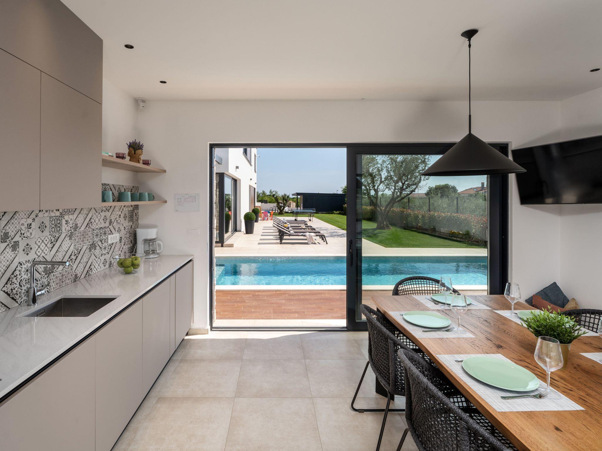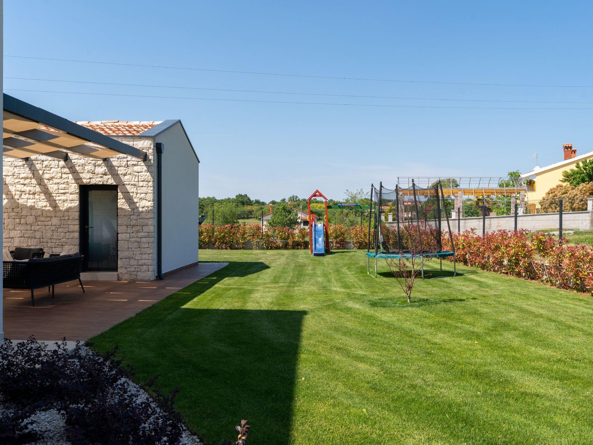 Villa Ansi Exclusive is a luxurious modern holiday home in small village Anzici near charming hill town Višnjan in central Istria. Numerous sights in Porec, Novigrad, Motovun, Pazin are nearby. The house is situated on a fenced 1580 square metre plot and offers guests the following outdoor facilities: 30 square metre pool, sun loungers, well-kept lawn, summer kitchen with barbecue fireplace, covered spacious terrace by the pool and several parking spaces. In the large outdoor area you will also find play facilities for the little ones, a table tennis table and 6 bicycles. The wonderful wellness area with Finnish sauna and indoor whirlpool are also there for relaxation and for those who prefer to spend their holidays in the not too hot months before or after the season, the pool can be heated on request.