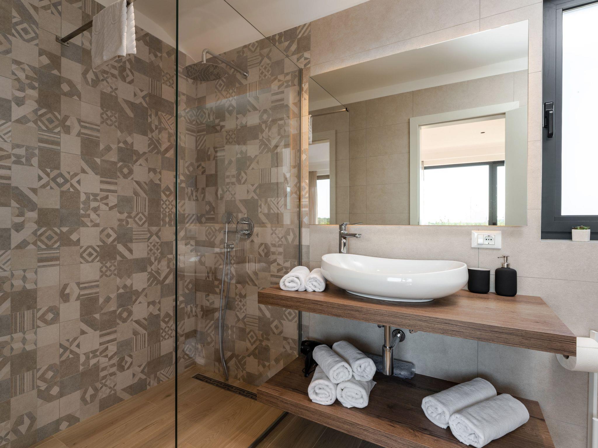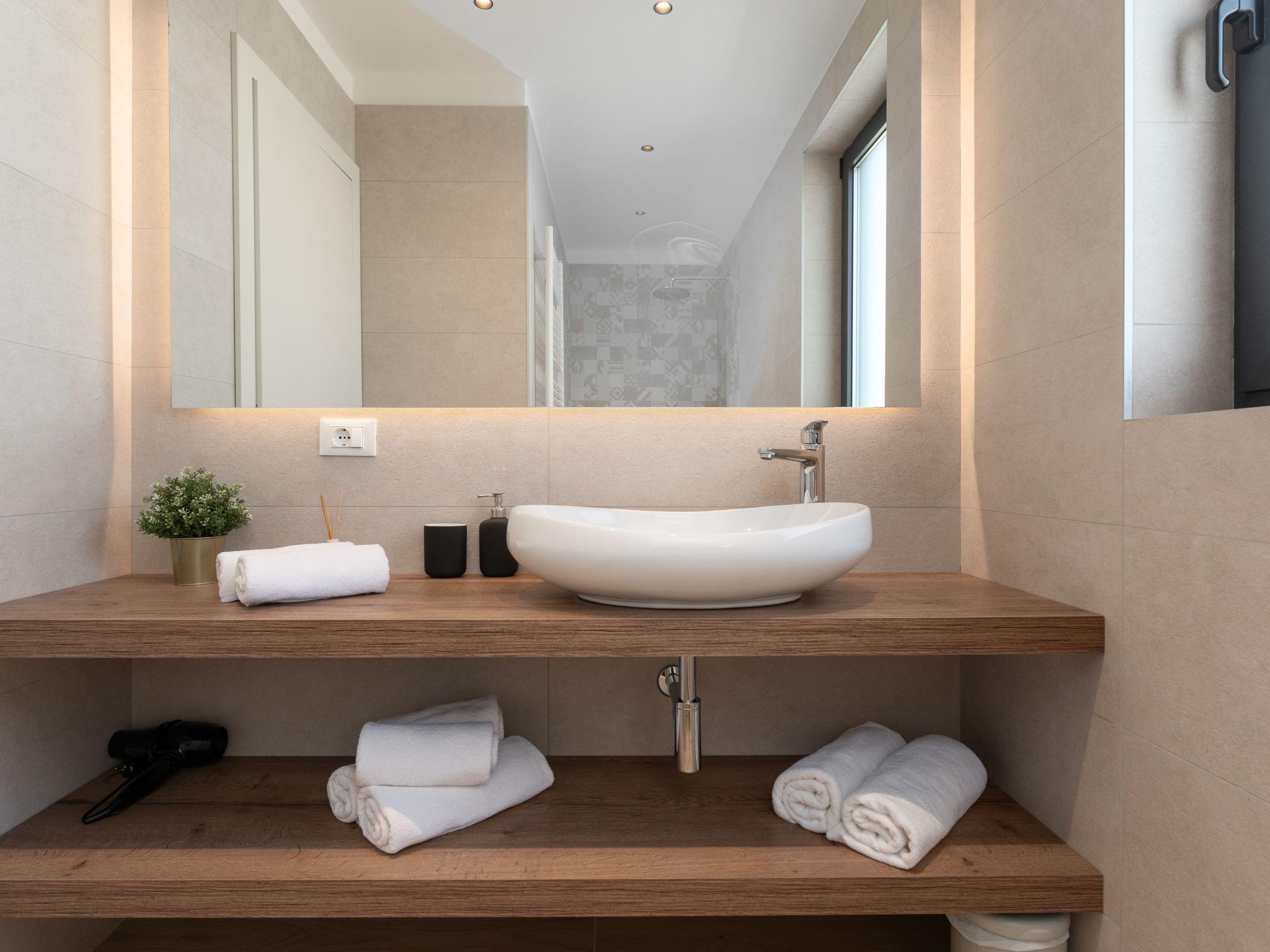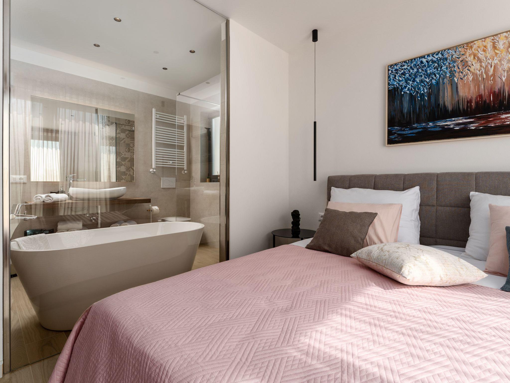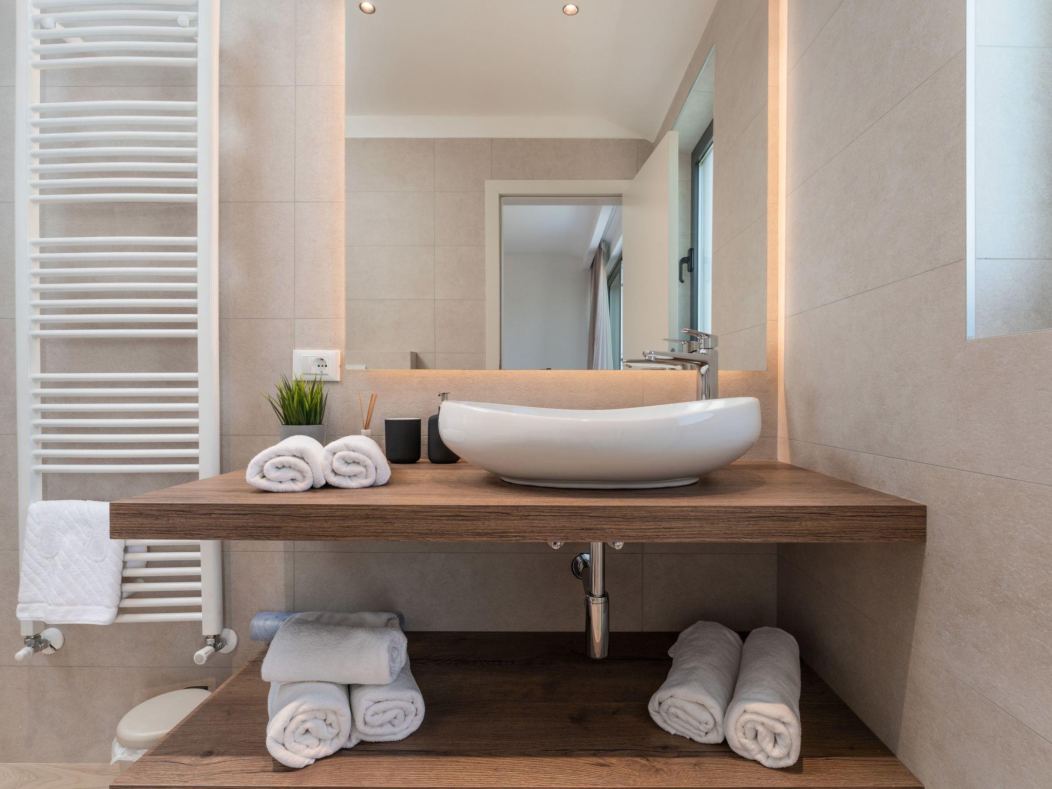 The holiday home has 160 square metres of living space spread over two floors and can accommodate up to 10 people. On the ground floor there is a fully equipped kitchen with dining area, cosy living room with plenty of natural light through the large glass walls, TV and fireplace, a bathroom and one of the 4 bedrooms, which has its own bathroom with bath/shower. On the first floor there are three further bedrooms, two with double beds and en-suite bathrooms, and one with two beds, en-suite bathroom and balcony with garden furniture and wonderful views. If you want to treat yourself to a very special holiday in luxury, then Villa Ansi Exclusive is the right choice.