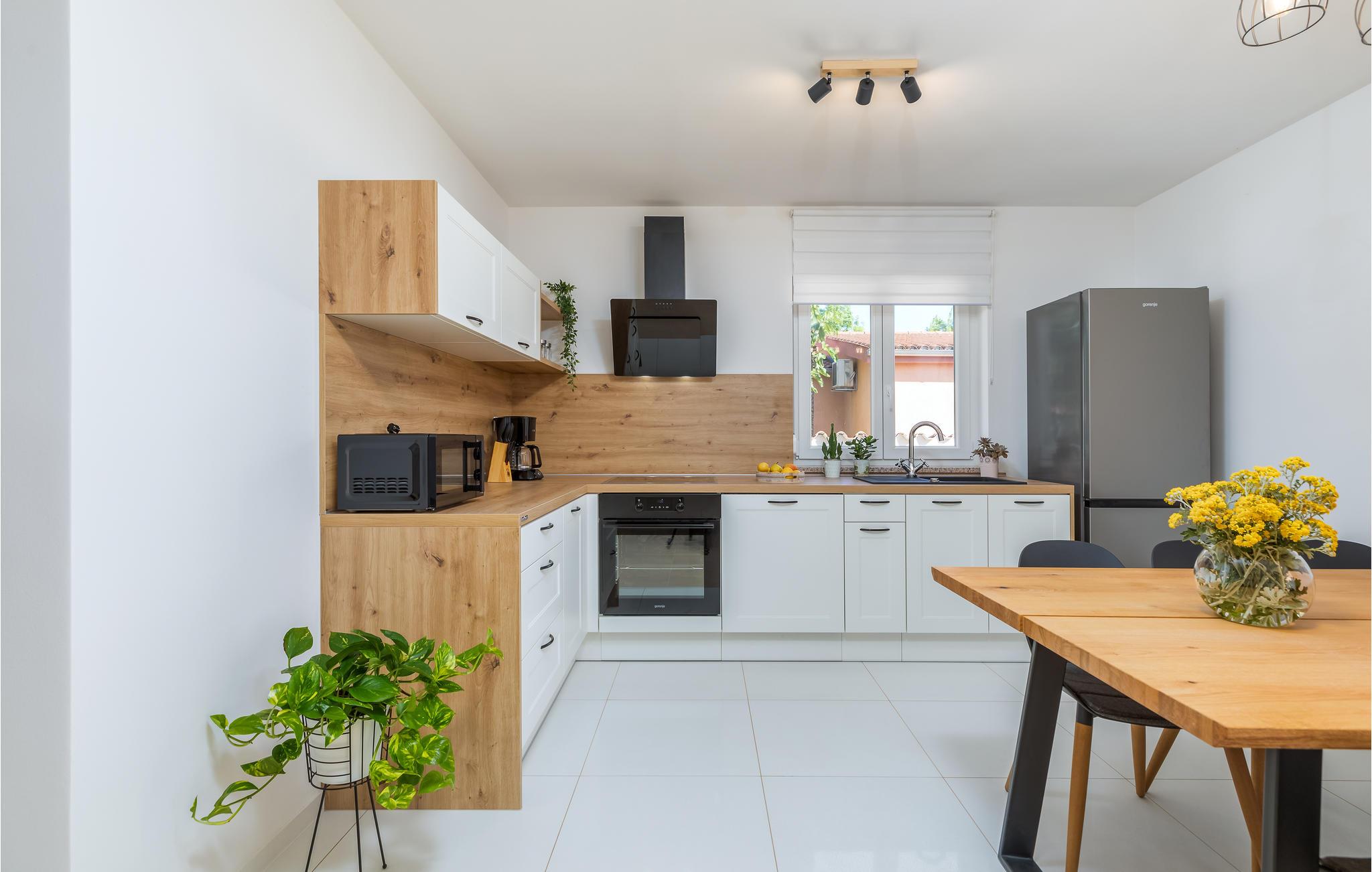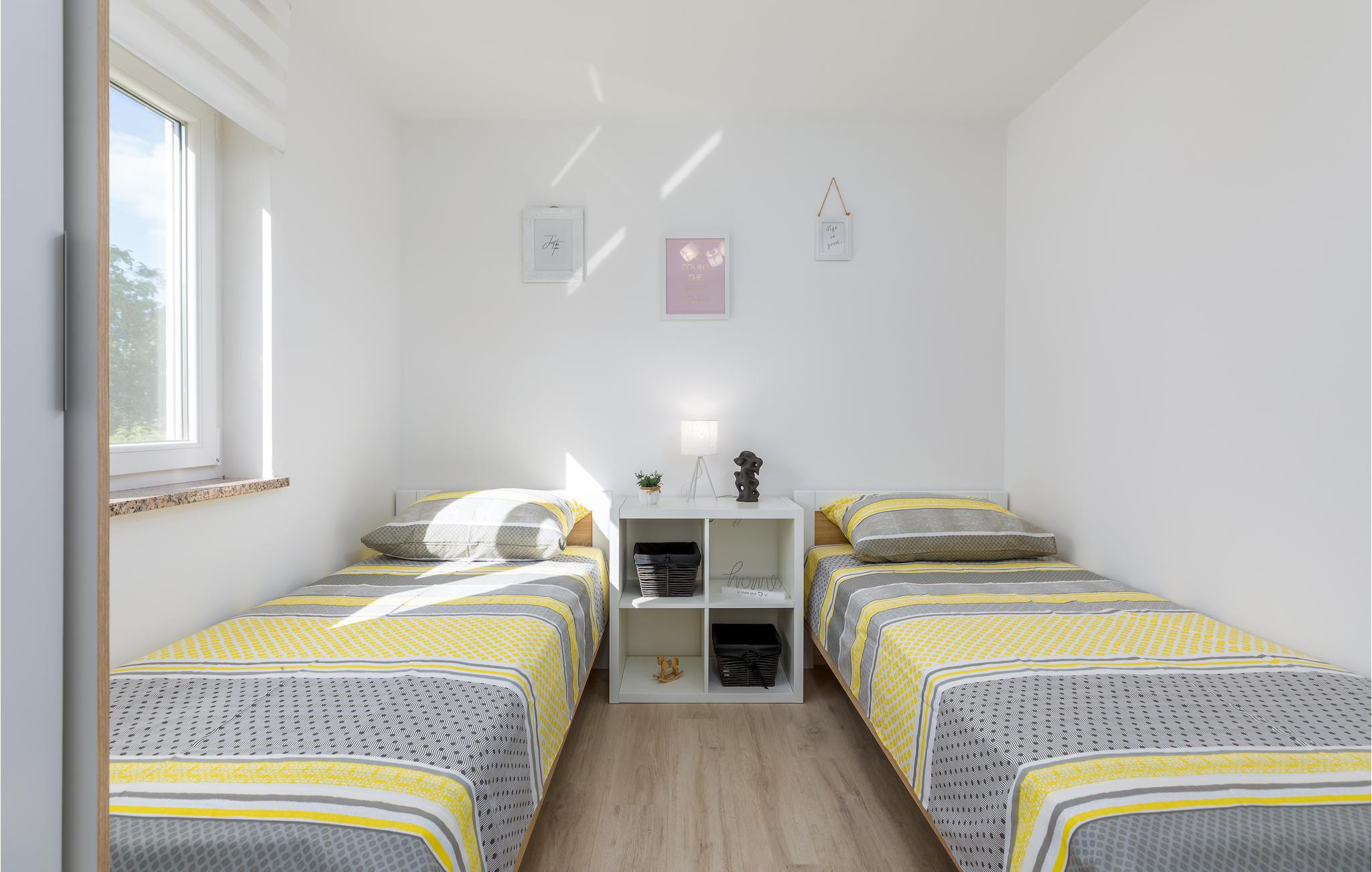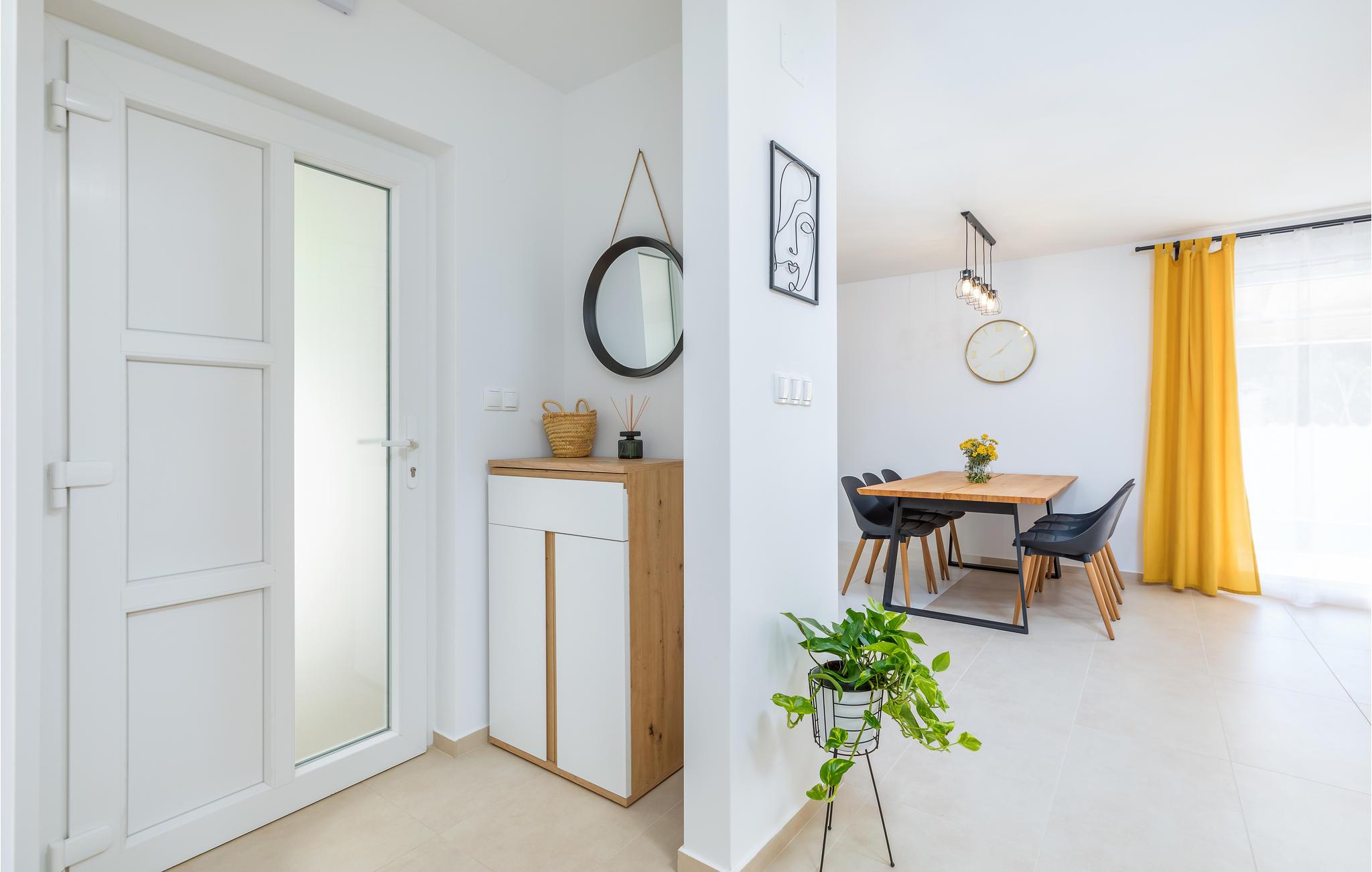 Här möts du av ett otroligt ljust semesterhus med en särskilt vänlig atmosfär, som kommer att förbättra din semester med ett hörn utöver avkoppling och lugn. Inredningen är modern och samordnad så att de gula färgaccenterna smälter harmoniskt in i resten av inventariet. Du kan också njuta av det stora utomhusområdet, som du når från vardagsrummet. Här väntar solstolar, en privat utomhuspool och en grill på att du när som helst ska kunna fräscha upp dig, njuta av sommarkvällar tillsammans och tillbringa tid med en tupplur eller en spännande roman.