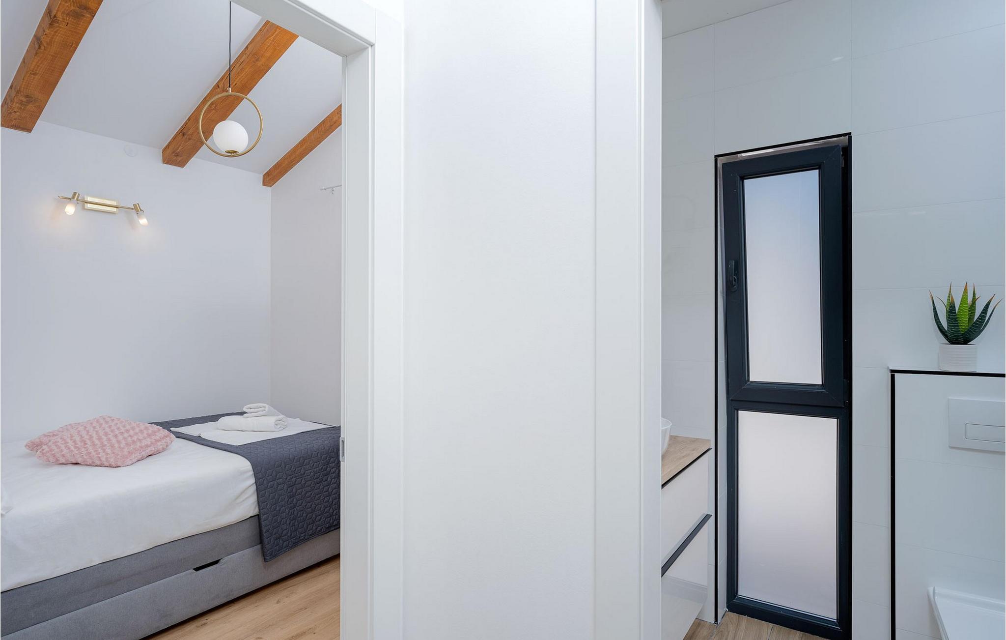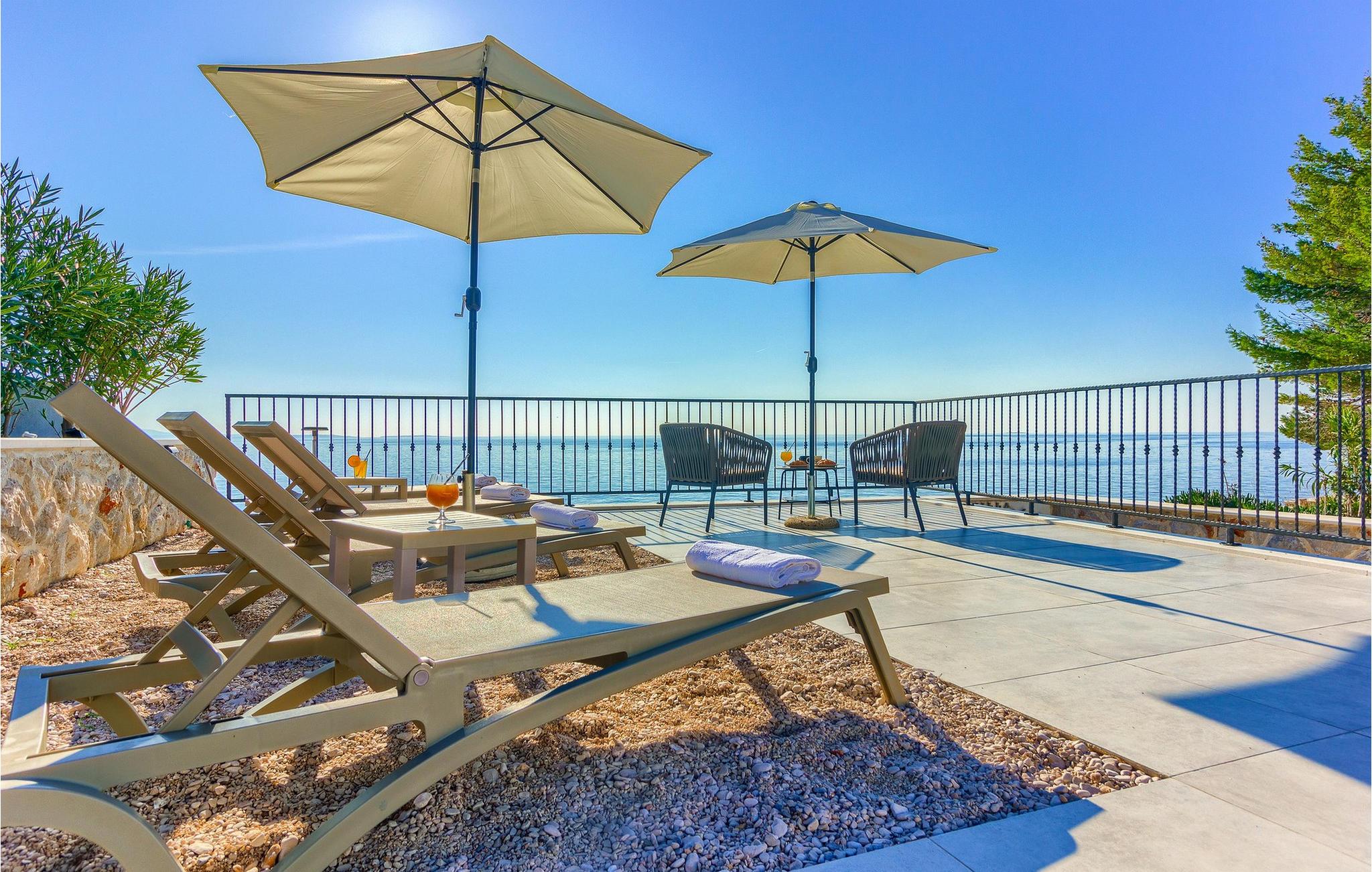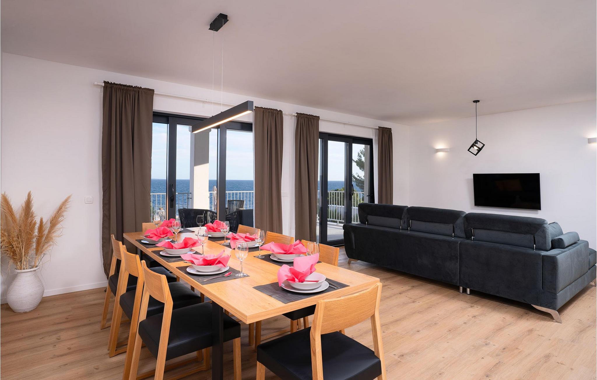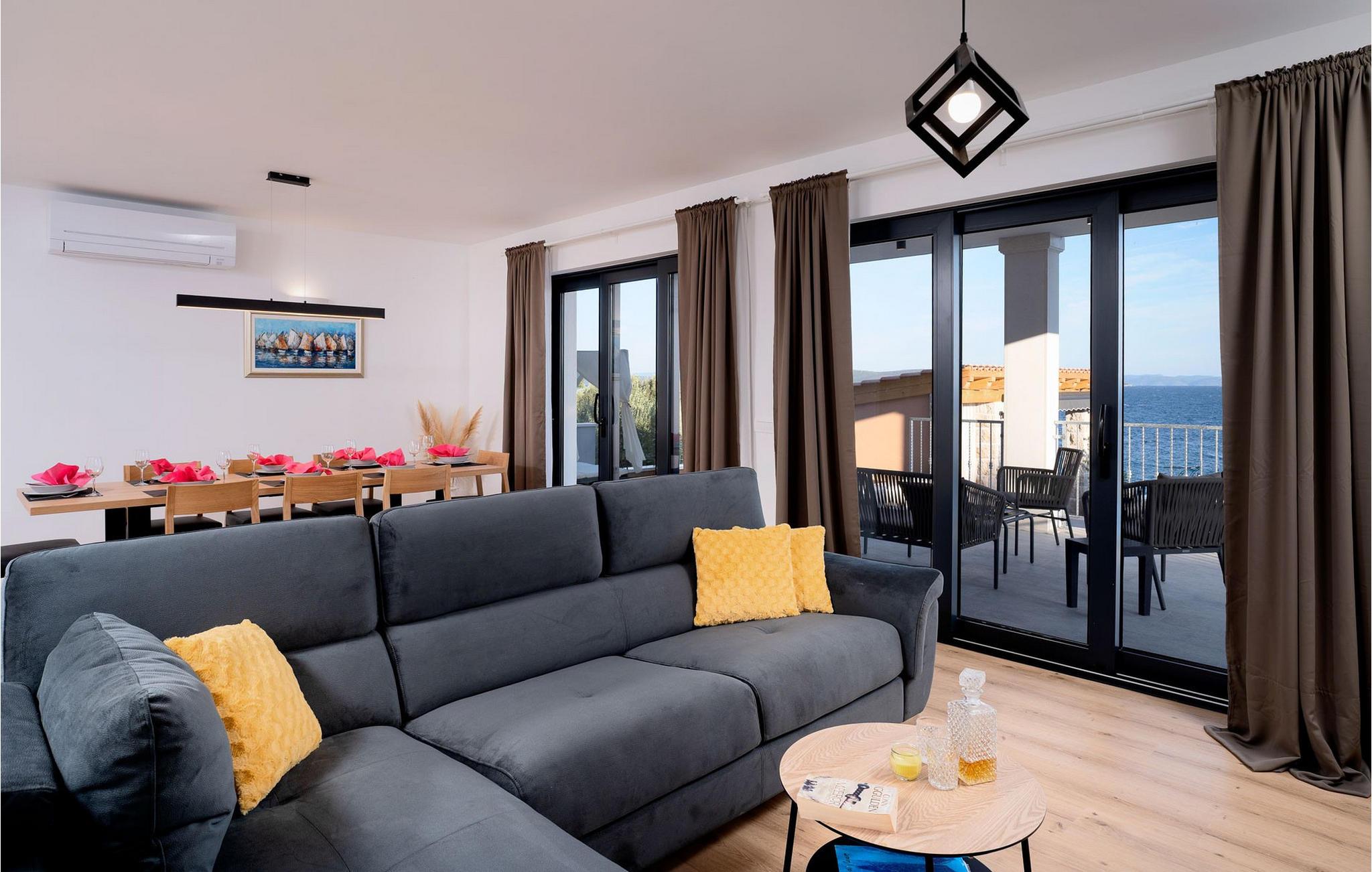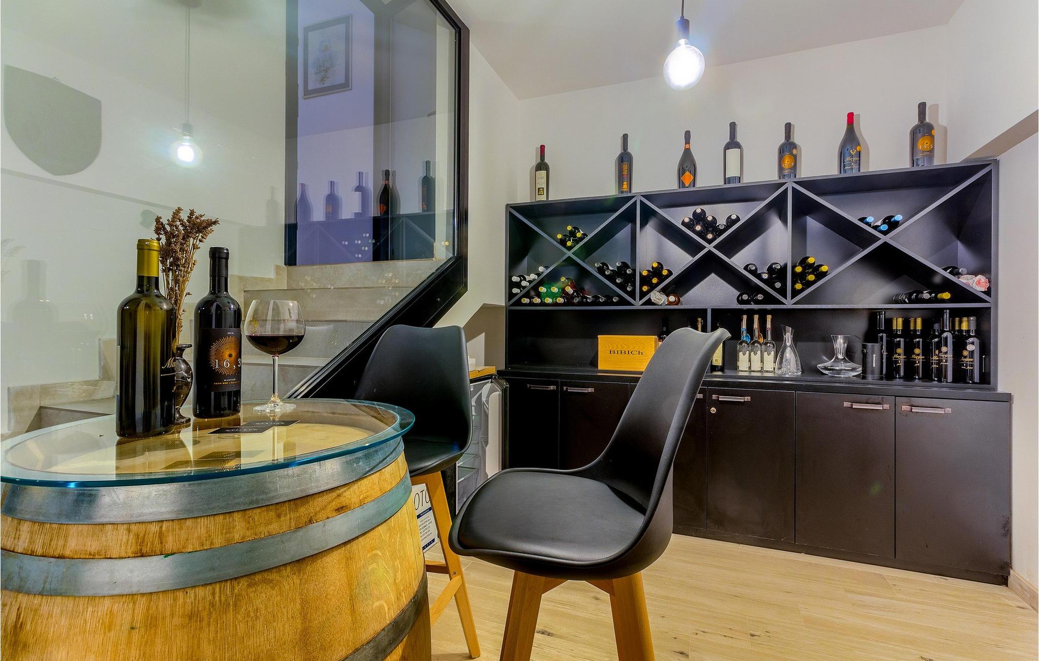 Villa Aurora di Sea ligger på ön Hvar, i den lilla staden Ivan Dolac. Denna villa ligger bara 5 meter från havet och erbjuder allt du alltid har drömt om: en lugn och tyst semester, en lyxig vistelse, rymliga sovrum och en pool. Ivan Dolac ligger 10 km från byn Jelsa och 38 km från staden Hvar och är förbunden med resten av ön genom en 1,5 km lång tunnel. Unna dig en underbar semester med familj eller vänner på den vackra ön Hvar! Villa Aurora di Sea byggdes 2021 i modern arkitektonisk stil och erbjuder gäster 245 m2 bostadsyta, medan fastighetens totala yta är 596 m2. Som nämnts ovan ligger villan bara 5 meter från Adriatiska havet, där du kan dyka, simma och sola på stranden. Villan är helt luftkonditionerad och erbjuder boende för högst 7, optimalt 5 personer. Den består av en bottenvåning och en övervåning. På bottenvåningen finns ett modernt kök med bar och två barstolar, en matsal med ett bord för 7 personer och ett vardagsrum med en hörnsoffa (som fungerar som en extrasäng för två personer.) ), ett soffbord och en TV. Det finns också ett fitnessrum med flera grundläggande maskiner som kommer att glädja fans av en aktiv semester, och bastun gör att du kan koppla av helt. Älskare av en utsökt droppe vin kommer också att bli glada över vinbaren, där du kan smaka på olika typer av vin. Det finns också ett badrum med toalett på bottenvåningen. På övervåningen finns tre sovrum med dubbelsängar, varav två har tillgång till en gemensam terrass. Det finns också två badrum med dusch, det ena är ensuite och det andra är ett vanligt badrum. Vid behov kan du använda en matare och en barnsäng. De flesta av rummen i villan har havsutsikt och utomhusterrassen kommer att glädja dig mest. På utomhusterrassen finns en uppvärmd pool på 40 m2, 1,4 m djup, och en separat barnpool. Bredvid poolen finns solstolar för solbad, och det finns också en kol- eller vedgrill, ett litet sommarkök och ett matbord under tak. Detta är en unik anläggning som är idealisk för barnfamiljer och ger dig en välbehövlig oas av lugn och ro på en lugn och liten plats. Det finns 4 privata parkeringsplatser på villans innergård och villan är helt inhägnad. Om du anländer med egen båt finns det också en båtplats för en båt (Korpo Molto) upp till 12 meter. Tack vare det högsta antalet soltimmar i Kroatien och de branta vingårdarna på södra sidan av ön Hvar får man i detta område druvor för produktion av viner av högsta kvalitet. Ivan Dolac grundades på 1400-talet och spår av typisk dalmatisk arkitektur syns i varje hörn. Förutom goda viner är Ivan Dolac också stolt över sin rena miljö full av aromatiska örter och annan medelhavsflora. *Du kan också använda två elcyklar mot en extra avgift. De kan också ordna en massage efter överenskommelse. *Gästerna välkomnas med ett välkomstpaket med lokala traditionella produkter från ön Hvar. Husdjur är tillåtna i detta boende enligt ägarens bedömning eller mot en avgift.