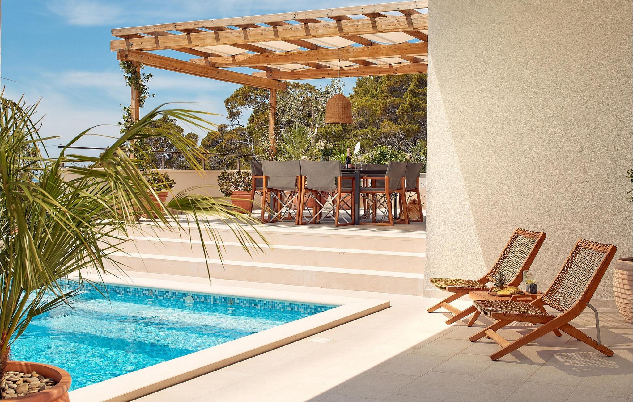 Långa timmar av solsken under den djupblå himlen väntar också på dig i det eleganta utomhusområdet. Fräscha upp dig i poolen direkt på morgonen, stäng ögonen igen på de bekväma solstolarna och låt den fridfulla atmosfären påverka dig. Servera dig själv en utsökt frukost i den diskret skuggade uteserveringen, förbered läckra grillmåltider i sommarköket och lyssna på cikadornas kvittrande över ett glas vin.