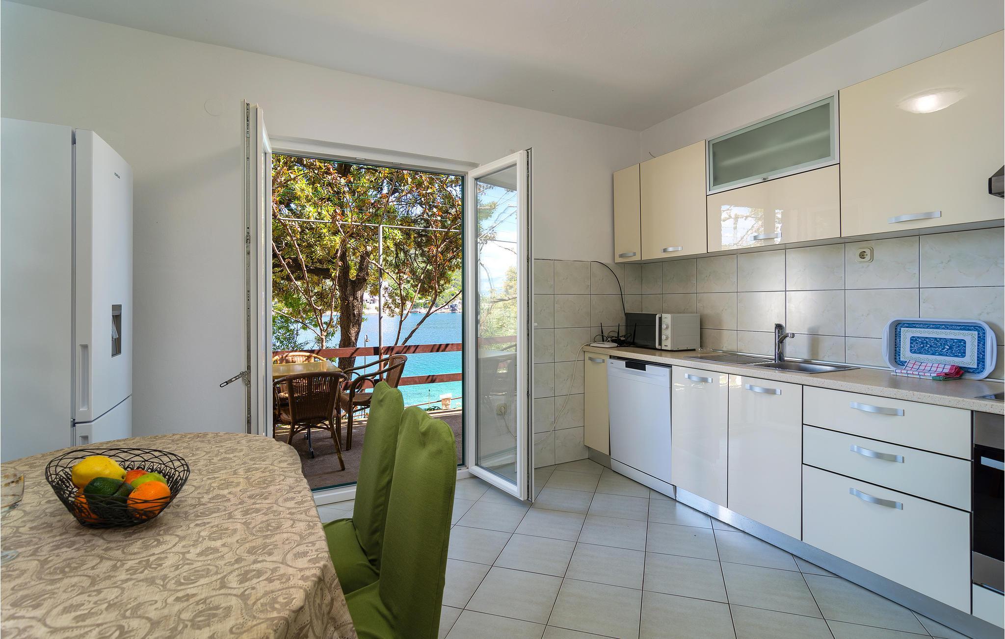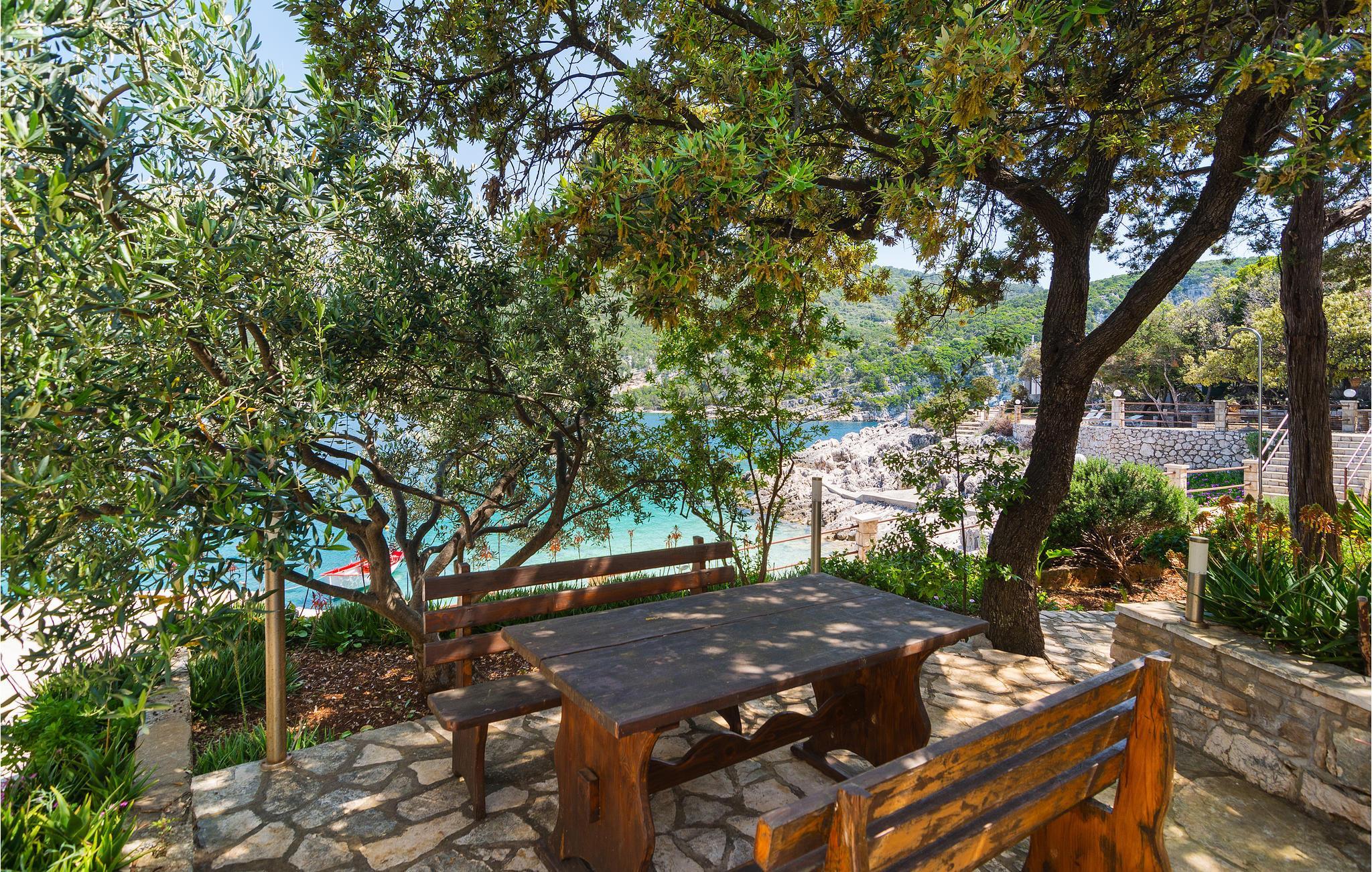 Detta enkelt inredda parhus ligger i en semesteranläggning nära havet. Det består av 2 separata enheter som är sammanlänkade med en brant utvändig trappa. På bottenvåningen finns ett kök-vardagsrum, badrum och sovrum, på övervåningen finns ytterligare två sovrum och ett badrum. Båda våningarna har en stor terrass. Endast några få steg skiljer dig från det kristallklara havet och den välbesökta stenstranden där. Stenstranden ca 200 m bort kan endast nås med båt. I samråd med husägaren kan en transfer med båt till restaurangen i den närmaste bukten ordnas.