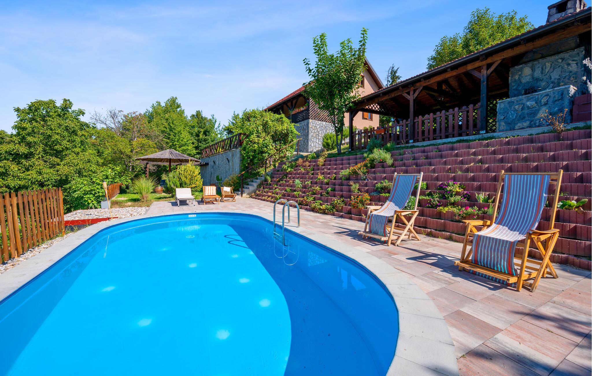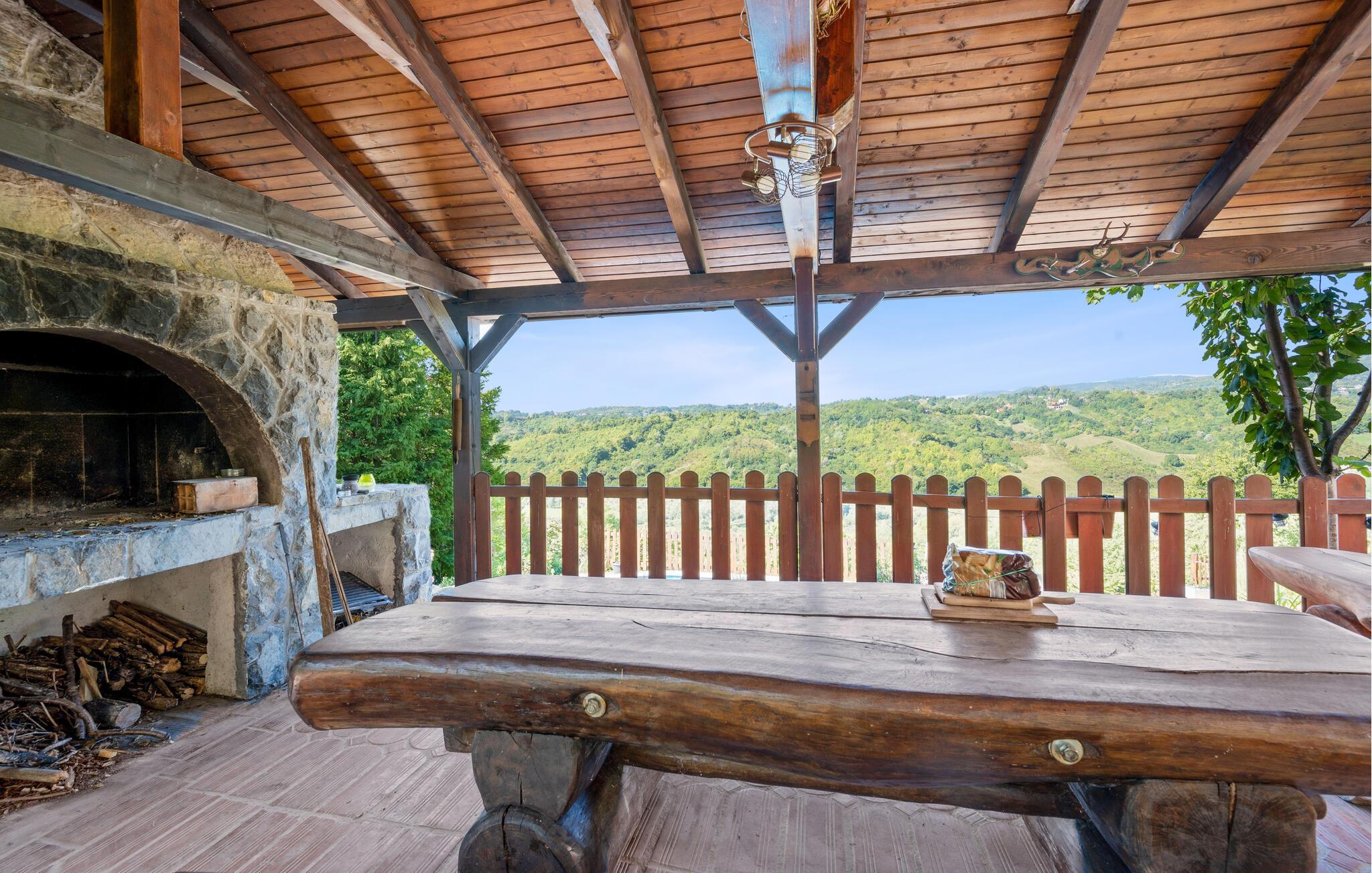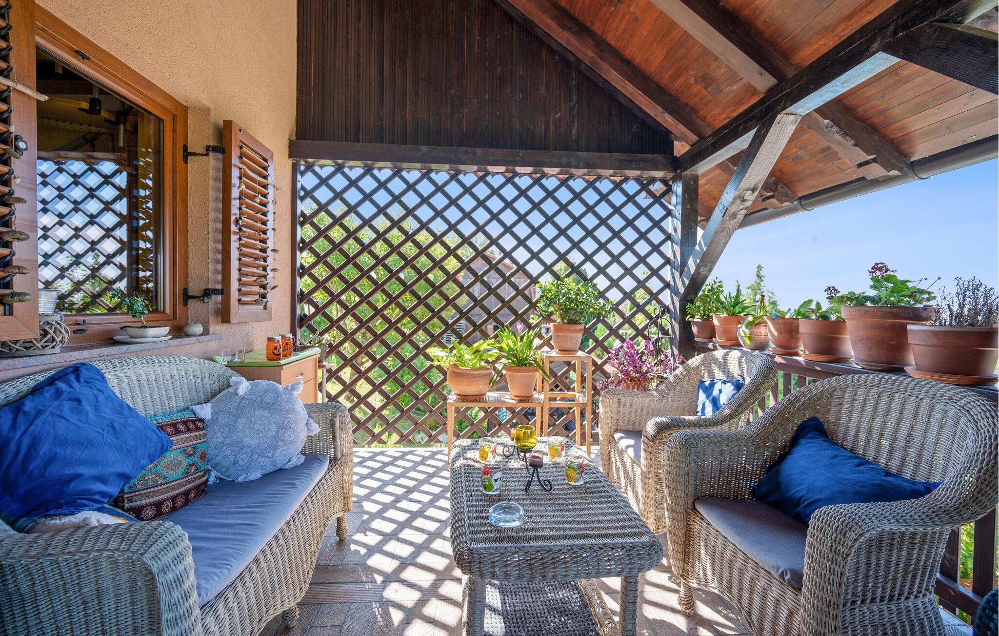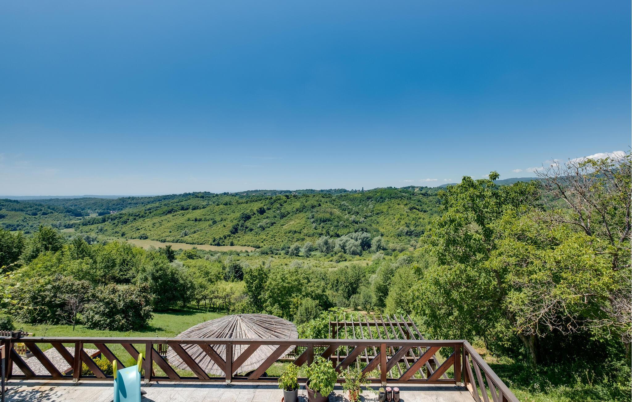 Detta rymliga och traditionella semesterhus i Gorica Svetojansk imponerar med sin vänliga inredning och den varma charmen i ett riktigt lanthus. De vackra färgerna, den mysiga öppna spisen och de högkvalitativa möblerna skapar en inbjudande atmosfär där du omedelbart kommer att känna dig som hemma.
