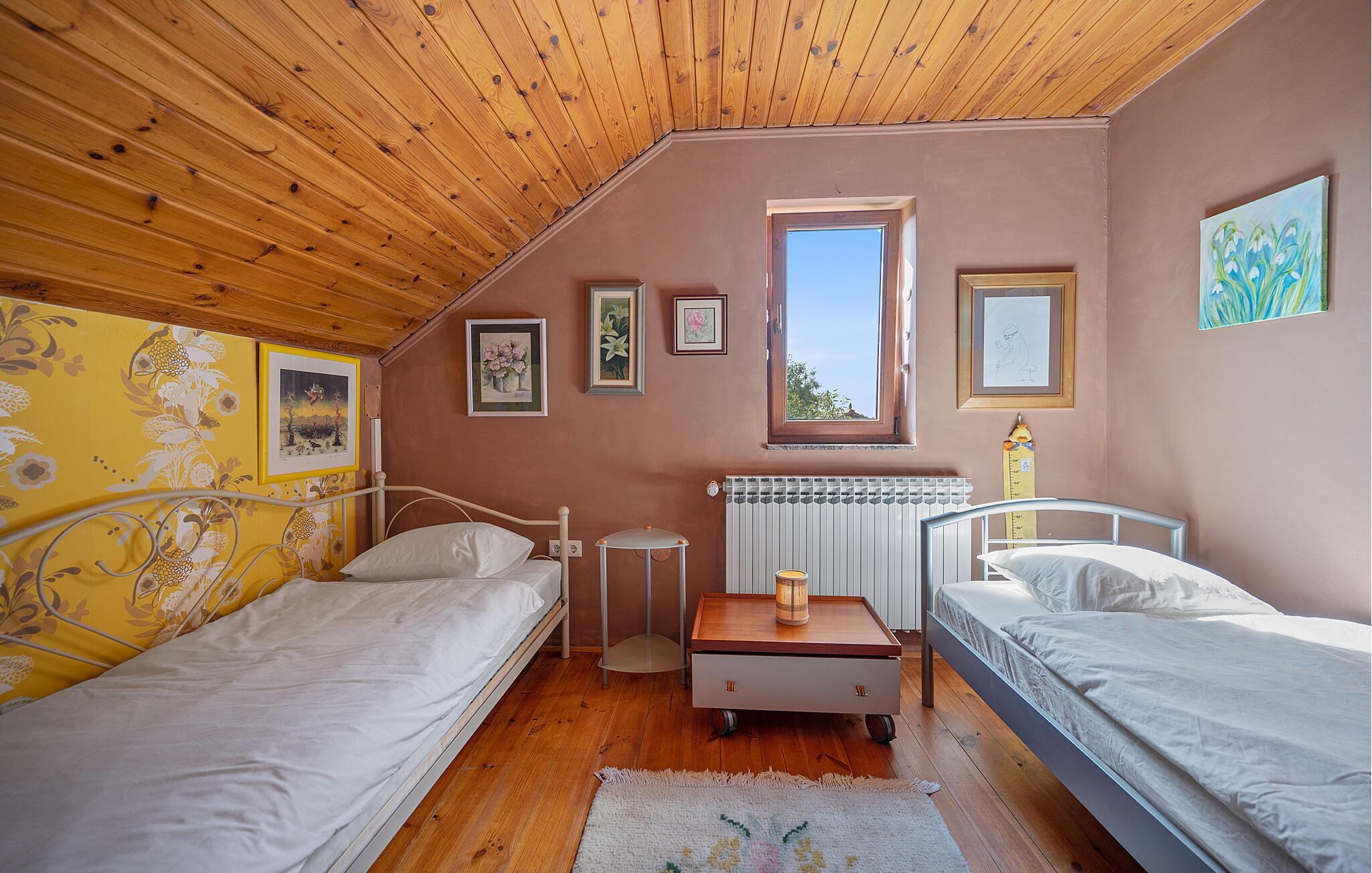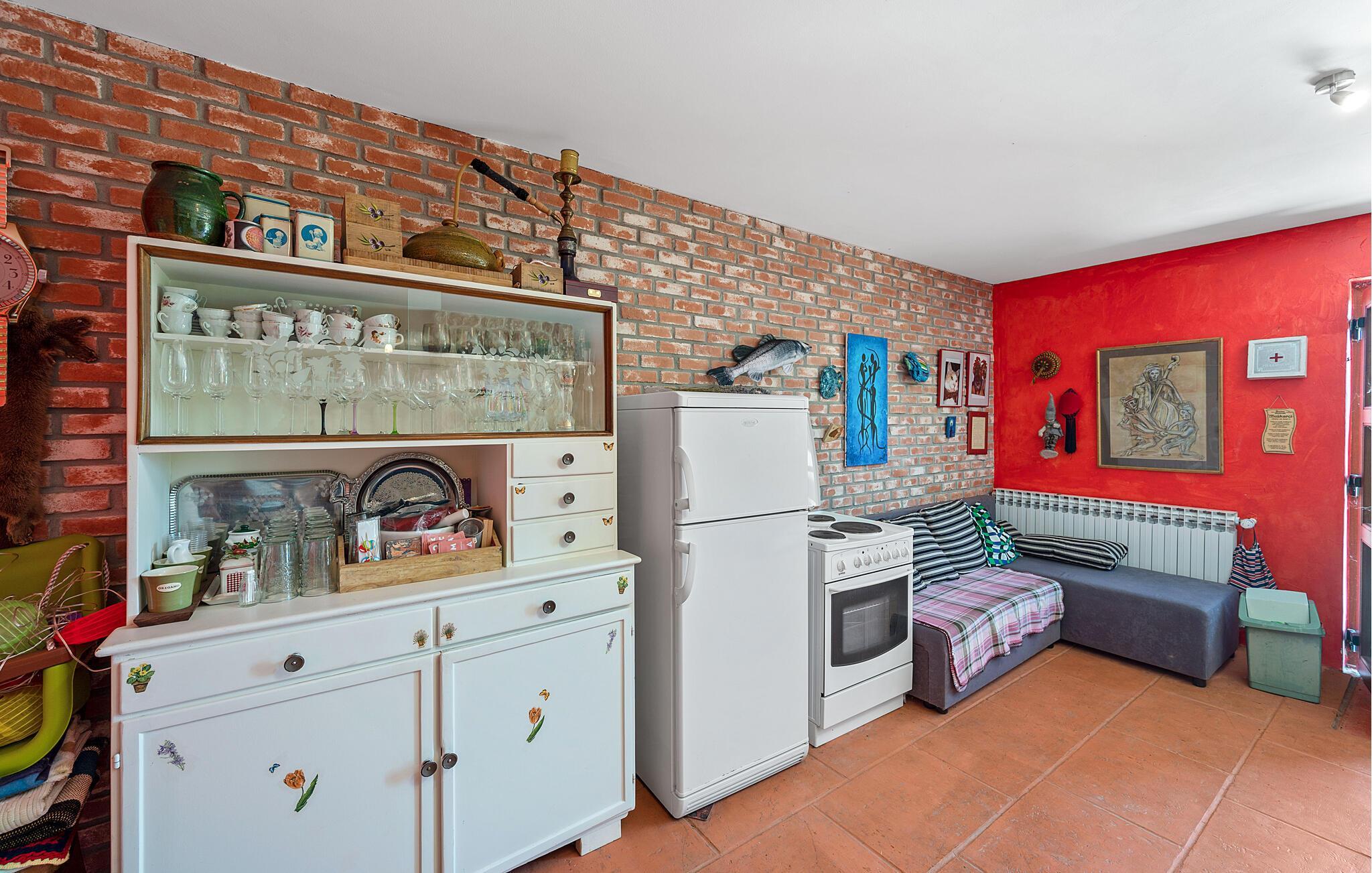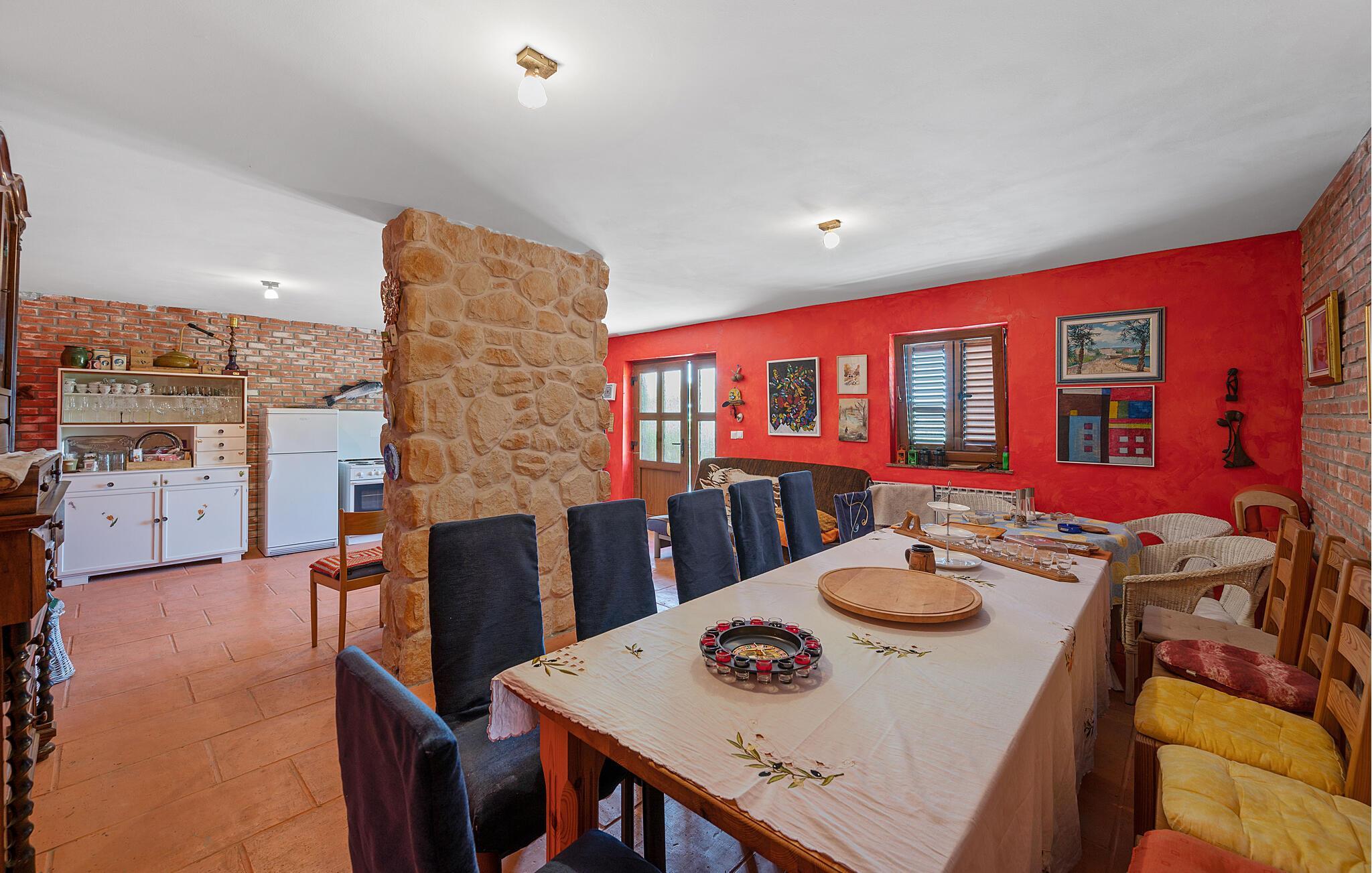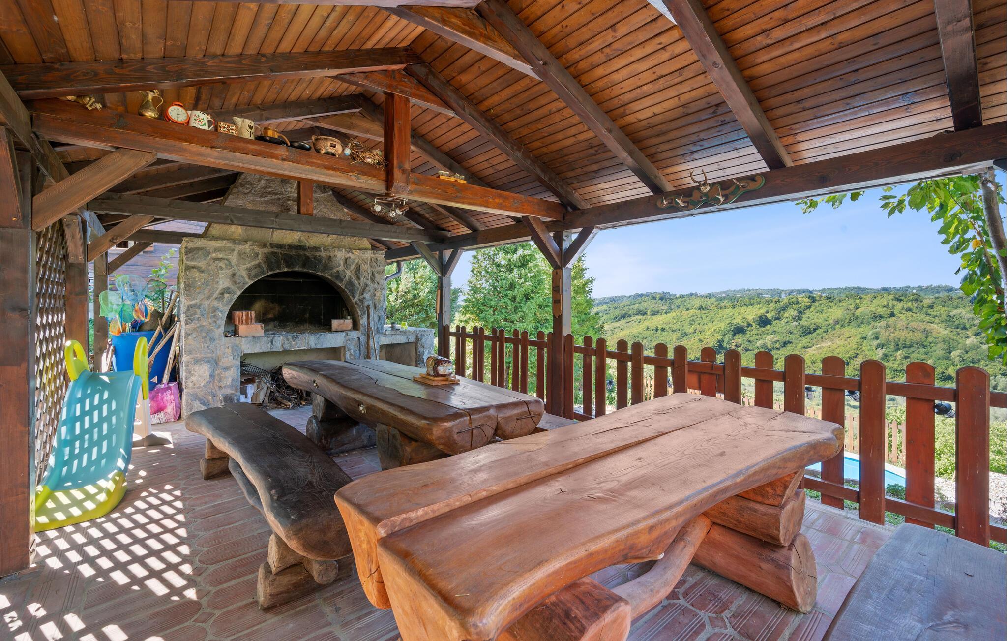 Detta rymliga och traditionella semesterhus i Gorica Svetojansk imponerar med sin vänliga inredning och den varma charmen i ett riktigt lanthus. De vackra färgerna, den mysiga öppna spisen och de högkvalitativa möblerna skapar en inbjudande atmosfär där du omedelbart kommer att känna dig som hemma.
