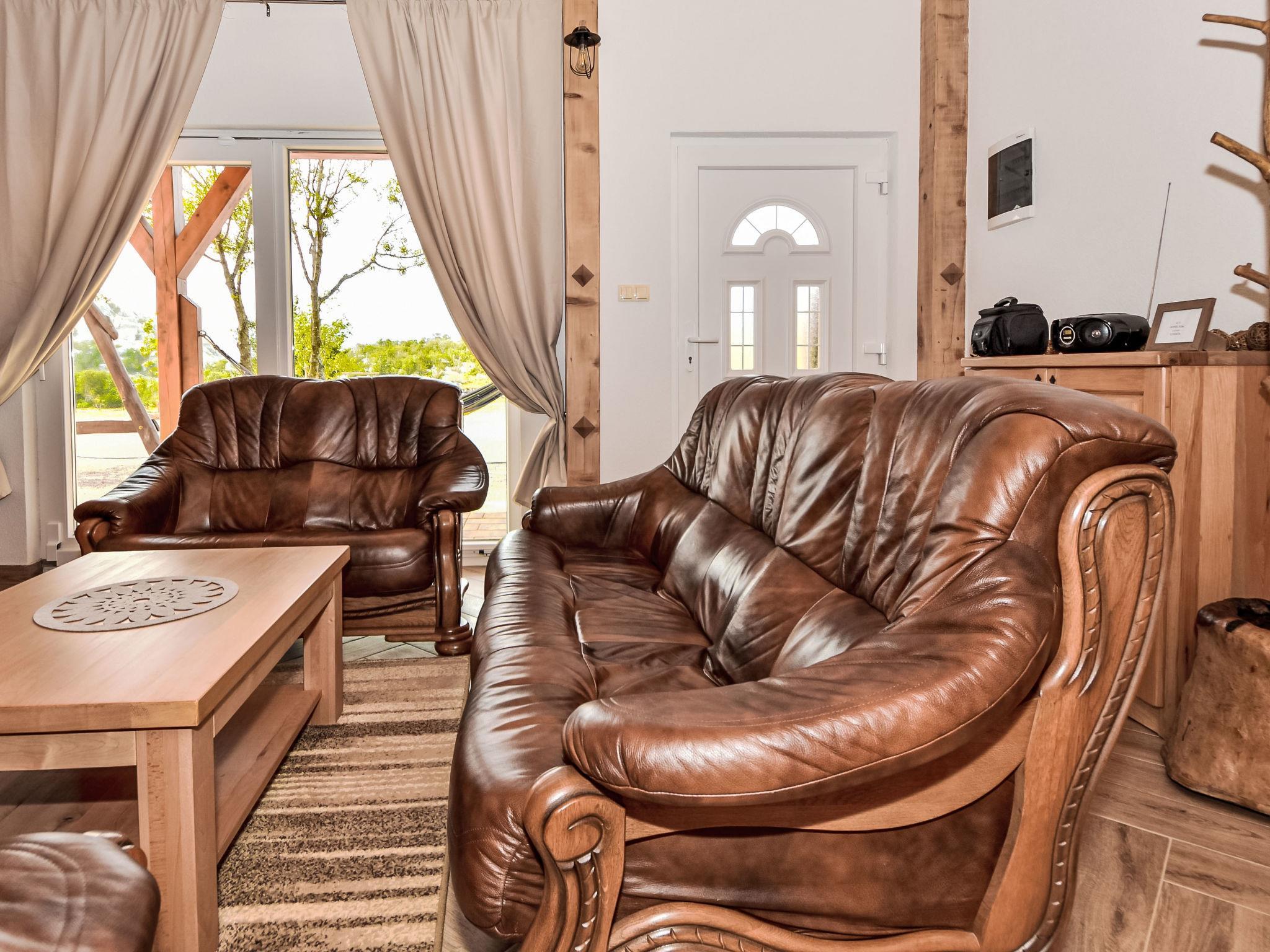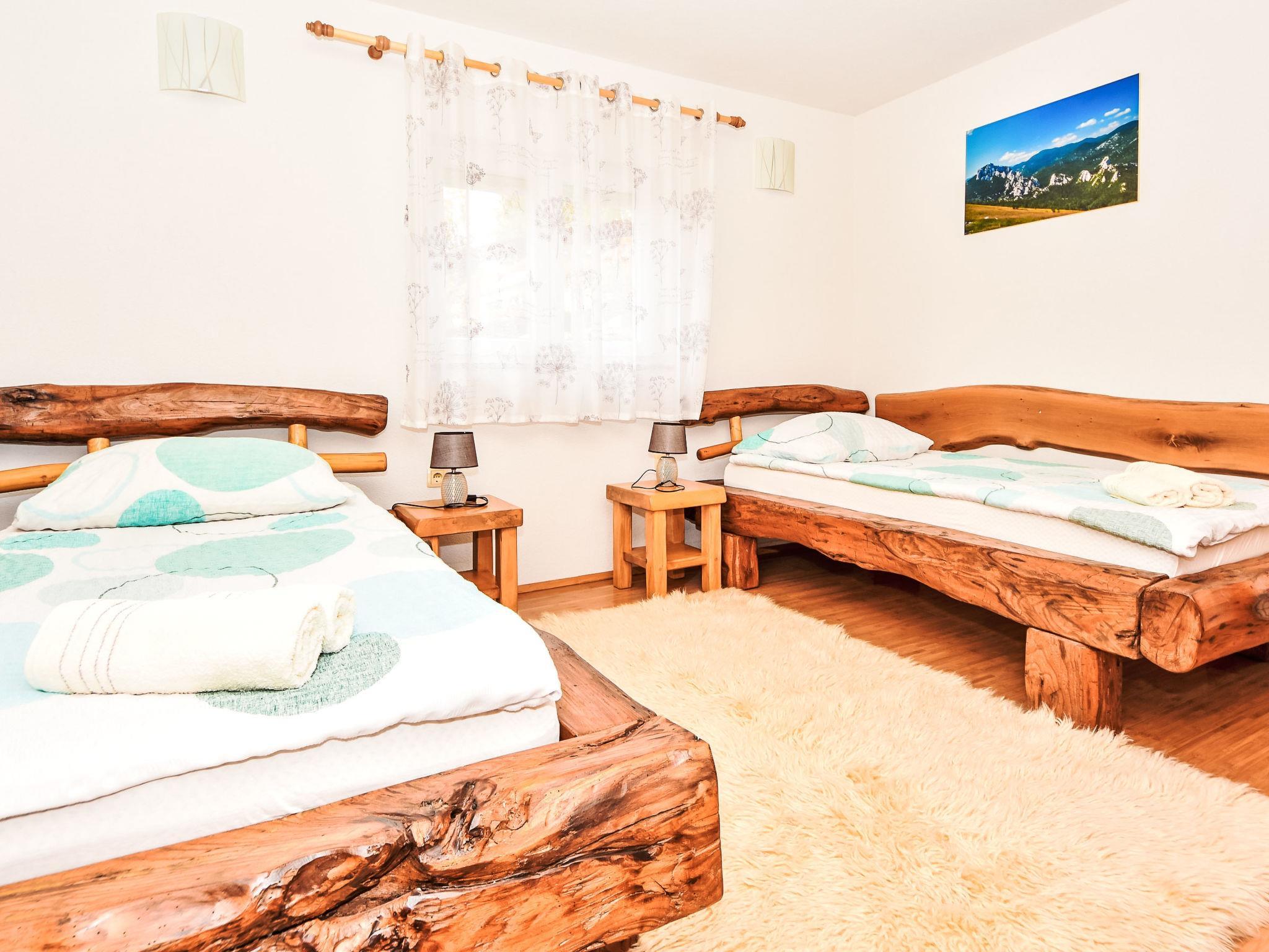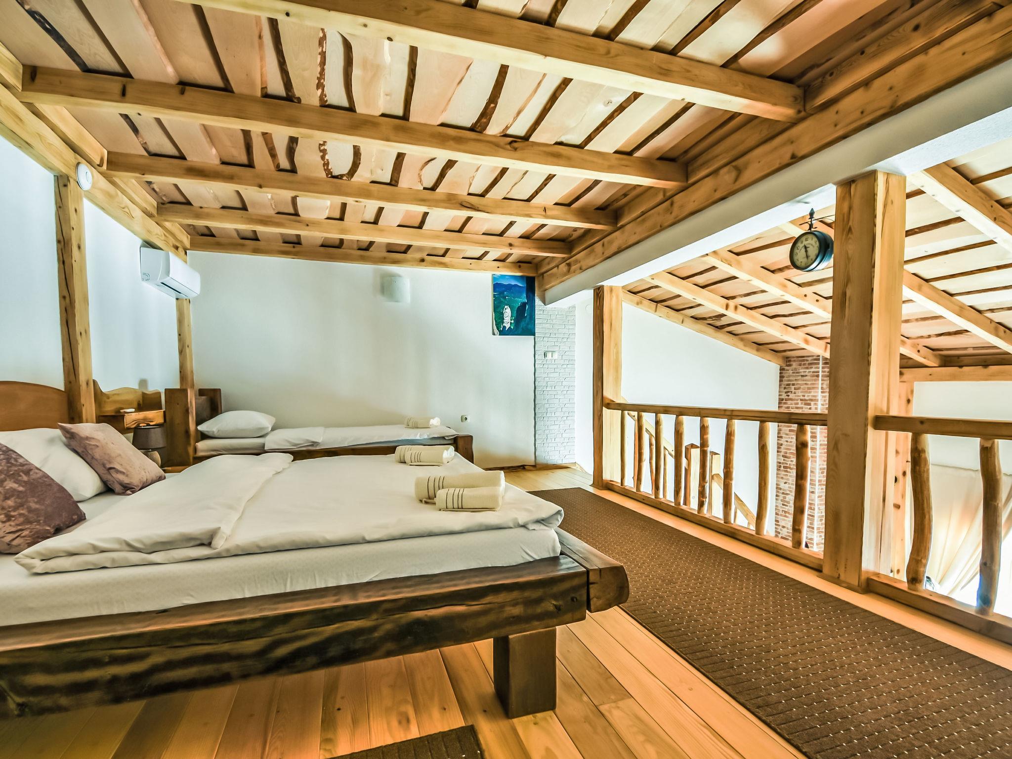 3-room house 120 m2 on 2 levels. 1 room with 1 french bed (180 cm, length 200 cm). Open kitchen (oven, 4 ceramic glass hob hotplates, freezer, electric coffee machine) with air conditioning. Exit to the terrace. Bath/bidet/WC. Wood heating. Upper floor: (spiral staircase) with sloping ceilings, 1 room with 1 french bed (160 cm, length 200 cm). Terrace 30 m2, roofed. Terrace furniture, deck chairs. Facilities: hair dryer. Internet (WiFi, free). One apartment on the ground floor (separate entrance): dining room, open kitchen, 3 bedrooms. The other apartment on the ground floor (separate entrance): living/dining area, open kitchen, 1 bedroom.