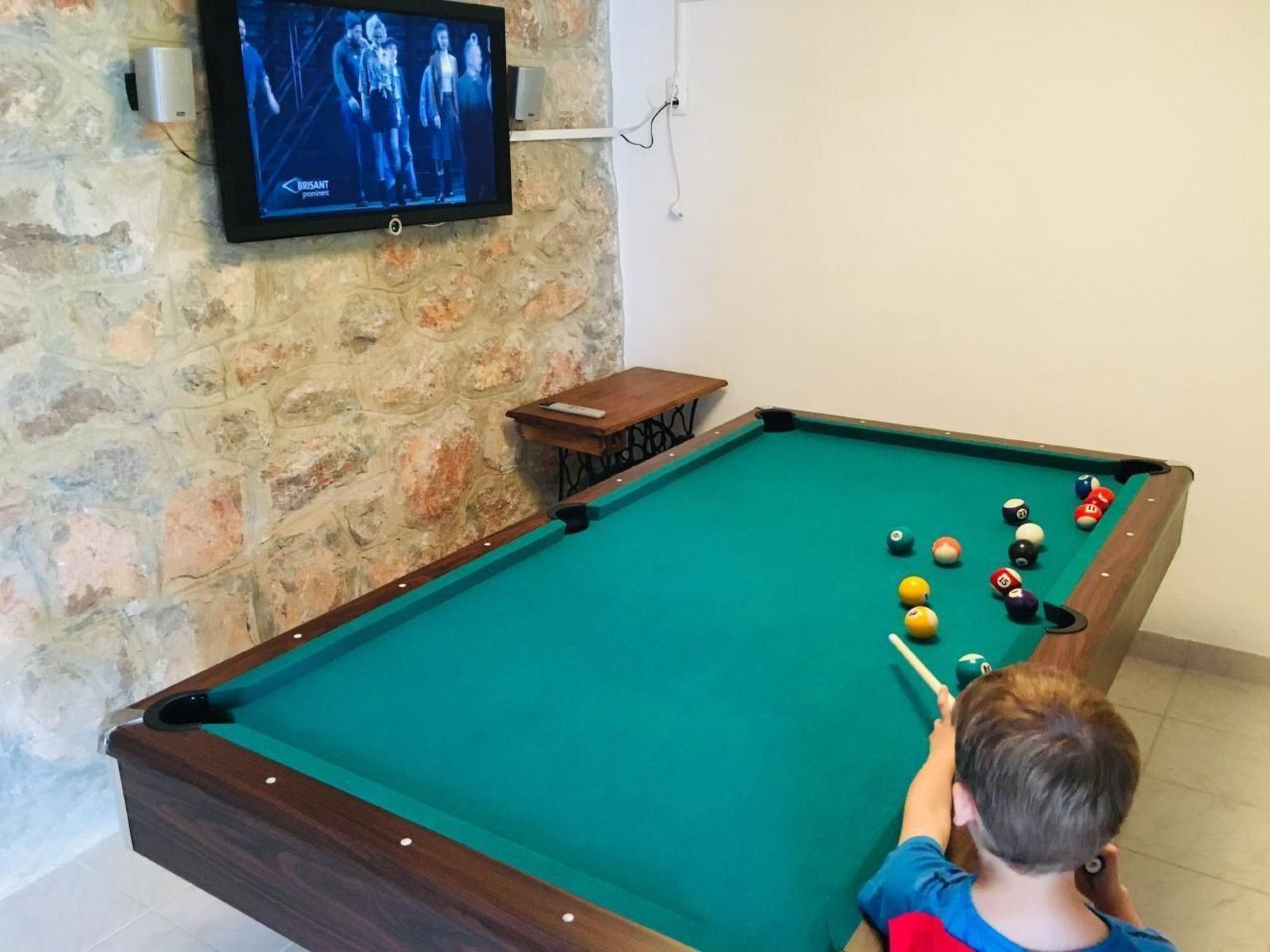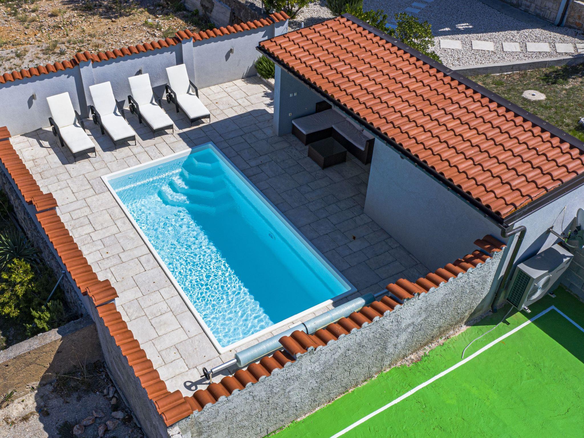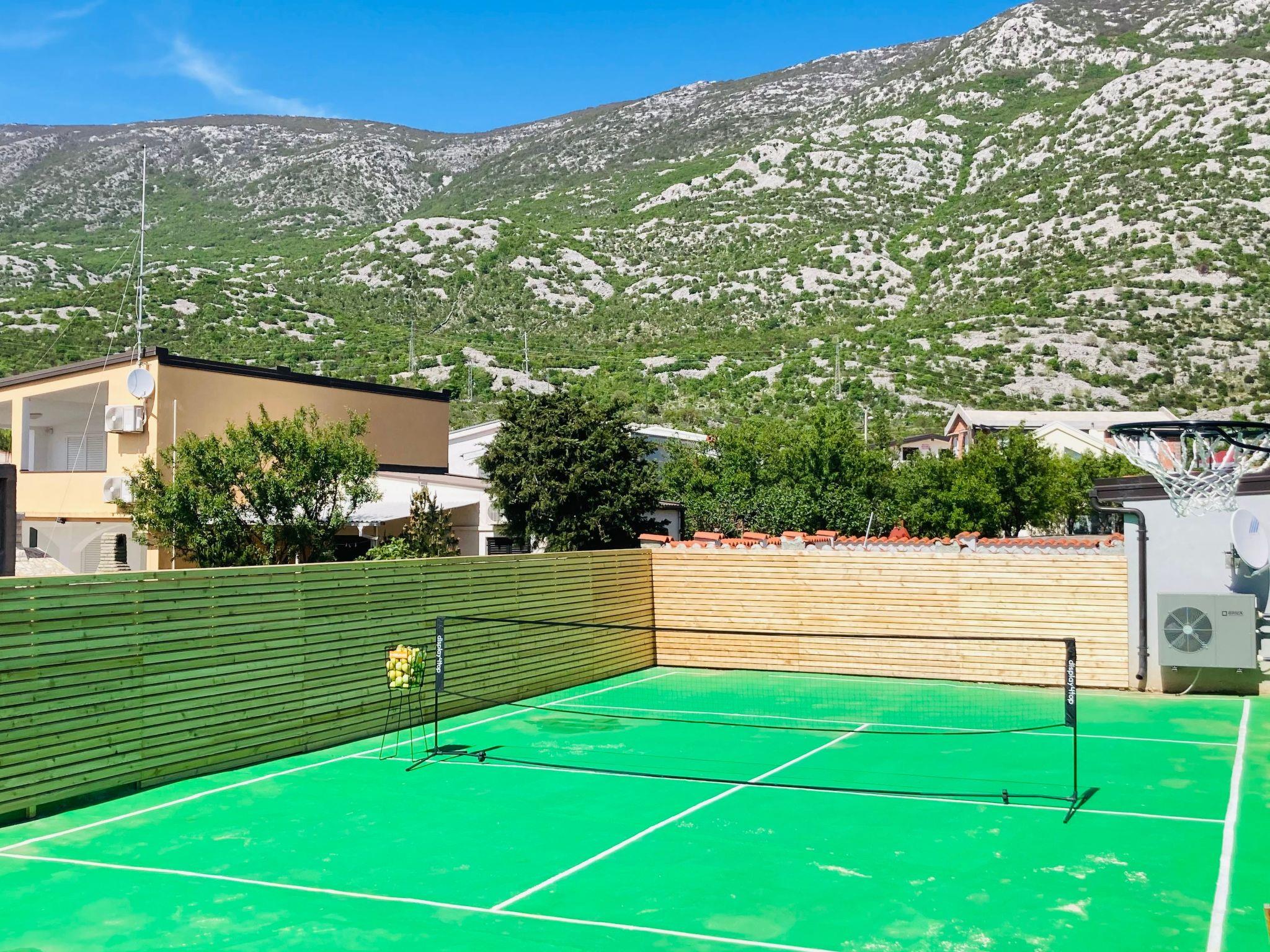 Outside, the heated pool invites you to relax and refresh, surrounded by sun loungers and parasols, ideal for soaking up the sun and cooling off from hot summer days. The private sports court offers a perfect opportunity for basketball, tennis or other activities in an exclusive and private atmosphere. For additional fun, there is an in-house pool table and dartboard.
