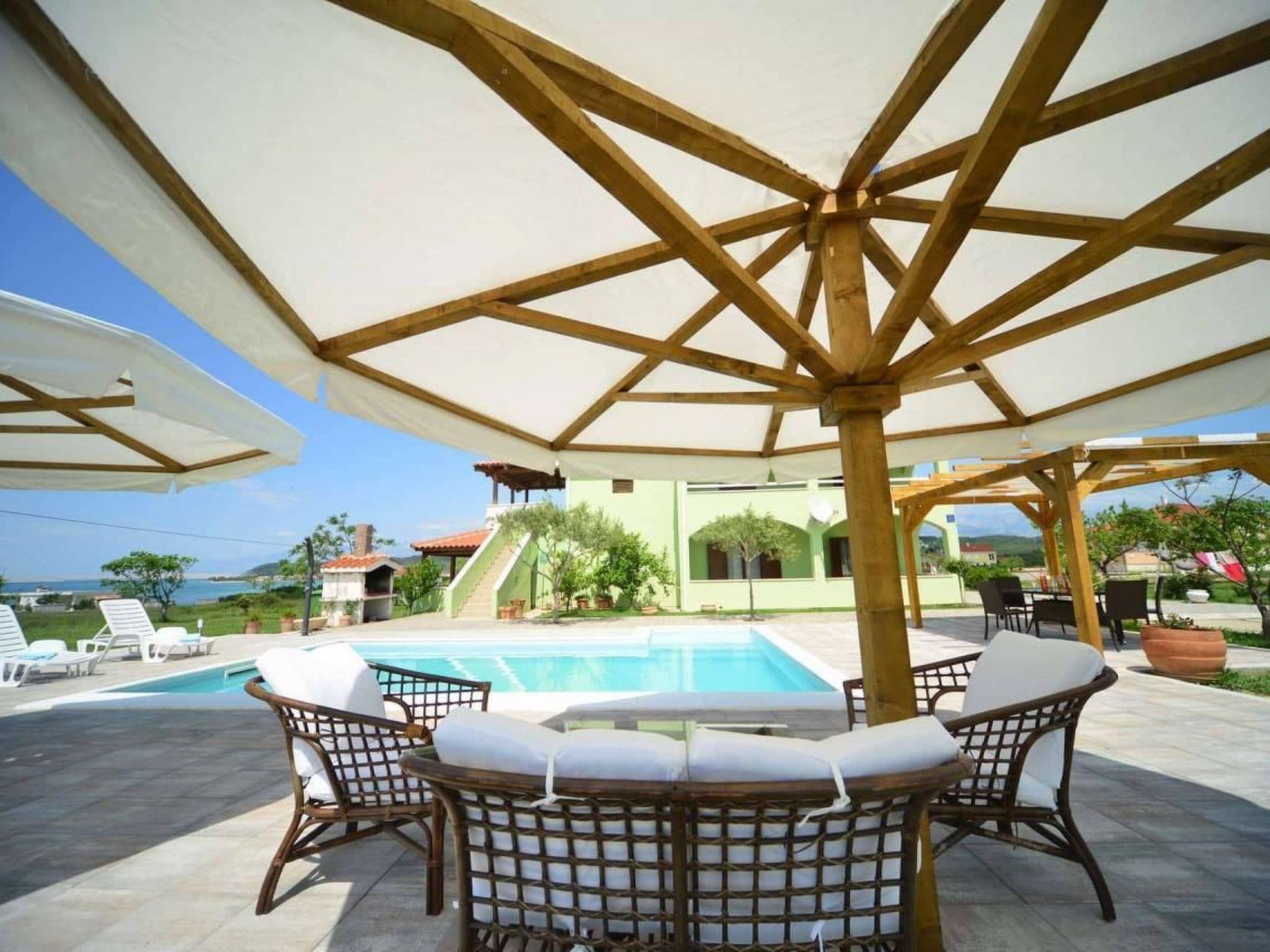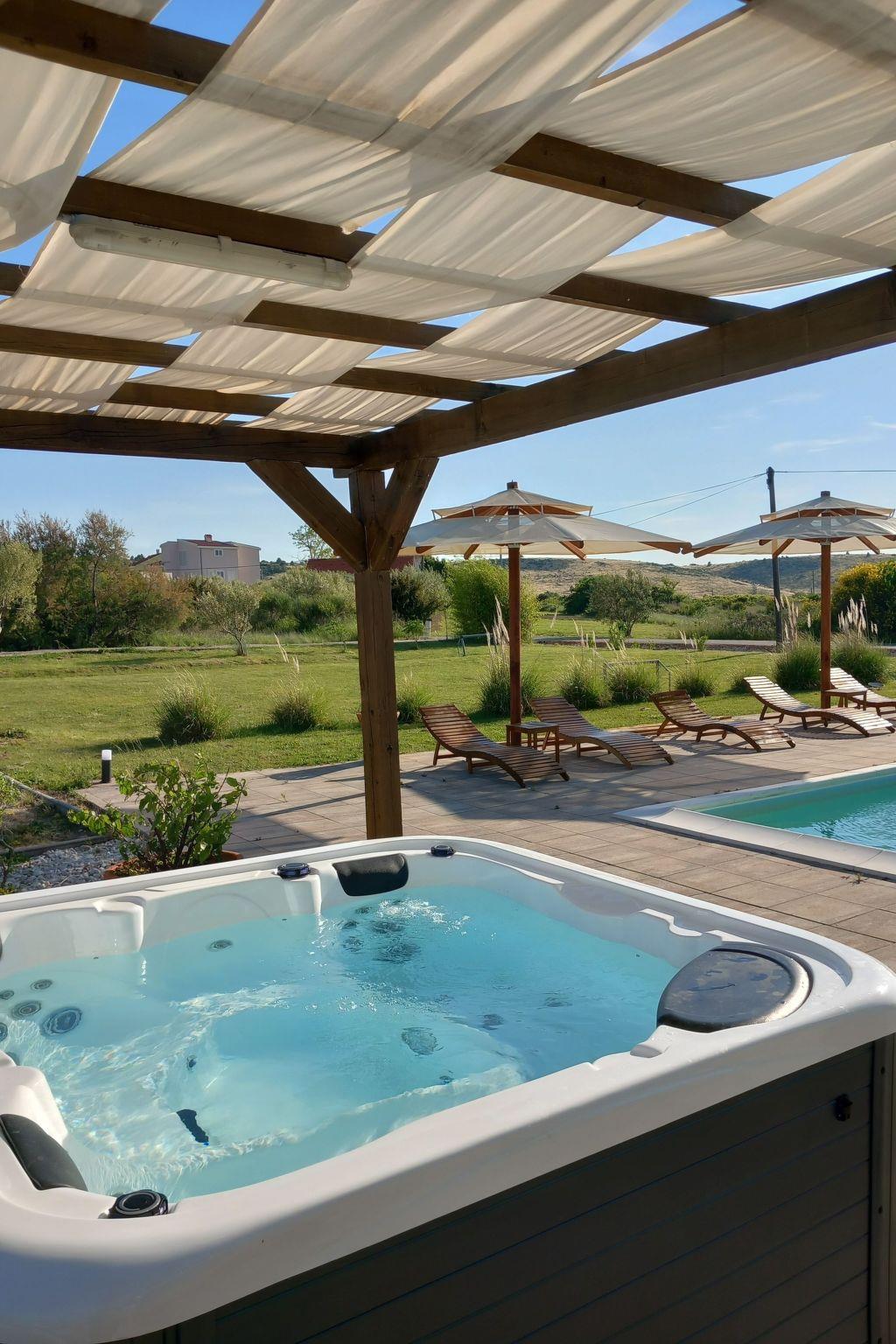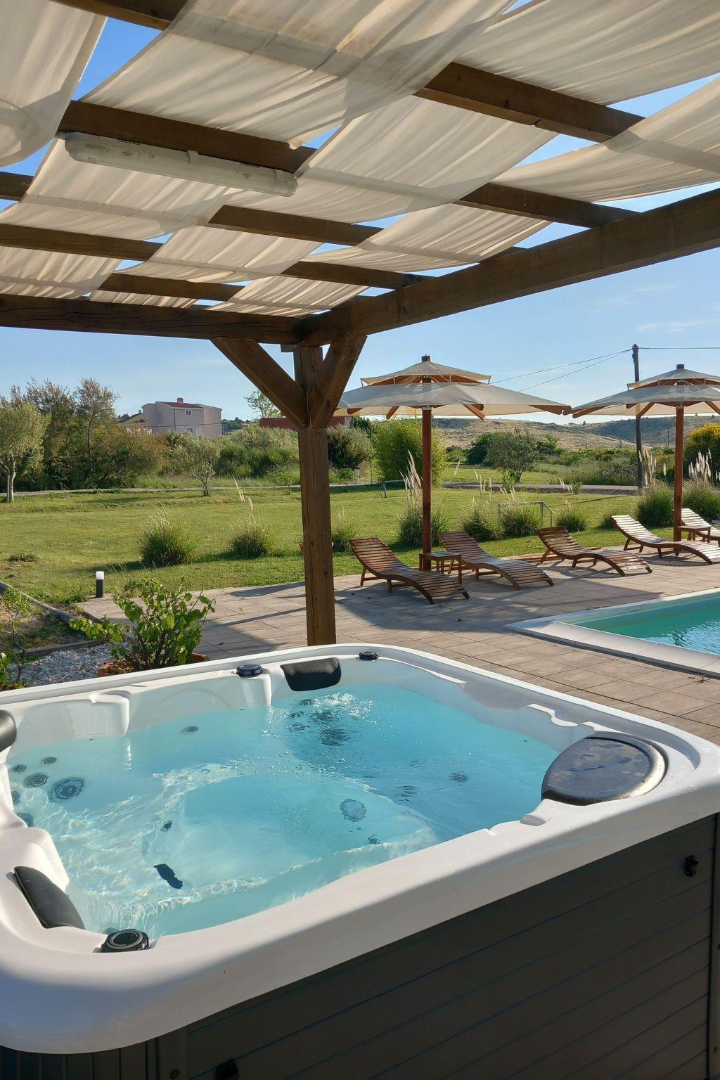 Apartment has three bedrooms; three bedrooms with double bed (160x2) each, and sofa in the living room, 2 bathrooms (both with showers), kitchen fully equipped with kitchen hood, dishwasher, oven, kettle, coffee machine, microwave, fridge with freezer and everything you need. Apartment is situated on the ground floor and it actually takes whole ground floor, it has big terrace (60 sqm) with an amazing sea view. Apartment has its own grill, too. Pool (33 sqm), separated Whirpool (up to 5 persons) and sunbathing place (with loungers and parasols) are shared with one more apartment.