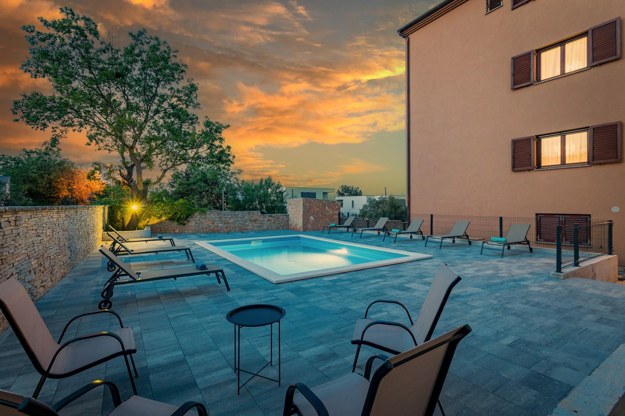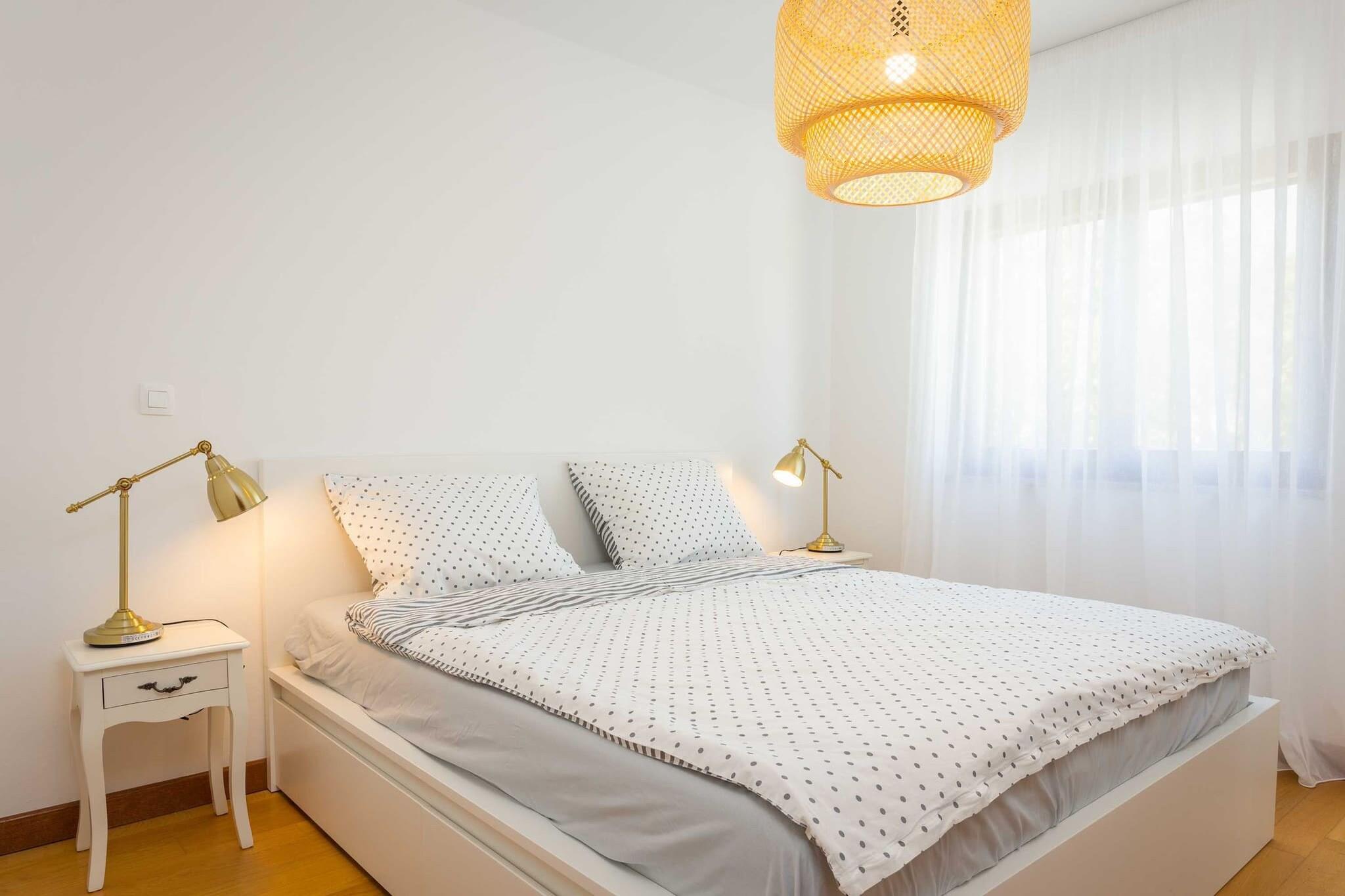 Detta semesterhus, tillsammans med sina moderna bekvämligheter, ger en bekväm och avkopplande vistelse för familjer eller grupper. Den erbjuder två rymliga sovrum med stora dubbelsängar och en bäddsoffa i vardagsrummet, perfekt för upp till 6 gäster. Semesterhuset har en egen balkong med utemöbler, vilket ger ett härligt utrymme att varva ner medan du njuter av utsikten. Fastigheten är husdjursvänlig och tillåter små husdjur mot en extra avgift. Gästerna kan också hyra barnstolar och spjälsängar för en mer familjeorienterad upplevelse. Med luftkonditionering, gratis Wi-Fi och en tvättmaskin garanterar det bekvämlighet under hela din vistelse. Boendet ligger i ett lugnt område, bara 1 km från stranden, vilket gör det till ett idealiskt val för dem som vill njuta av kustaktiviteter. Närmaste restaurang och livsmedelsbutik ligger bara 400 meter bort, vilket ger enkel tillgång till nödvändigheter. Gästerna kan också utforska närliggande städer som Medulin, bara 2 km bort, kända för sina sandstränder och pulserande nattliv. Läget är perfekt för friluftsentusiaster, med aktiviteter som vindsurfing, kajakpaddling och mountainbike i närheten. Pula, med sina rika historiska landmärken, ligger bara en kort bilresa bort, vilket ger fler sightseeingmöjligheter. Fastigheten är fullt utrustad med ett modernt kök, inklusive kylskåp, ugn, mikrovågsugn och diskmaskin, och erbjuder allt som behövs för att laga mat. Badrummet har dusch och hårtork för extra komfort. Andra bekvämligheter inkluderar strykjärn, grillplats och cykelförvaring.