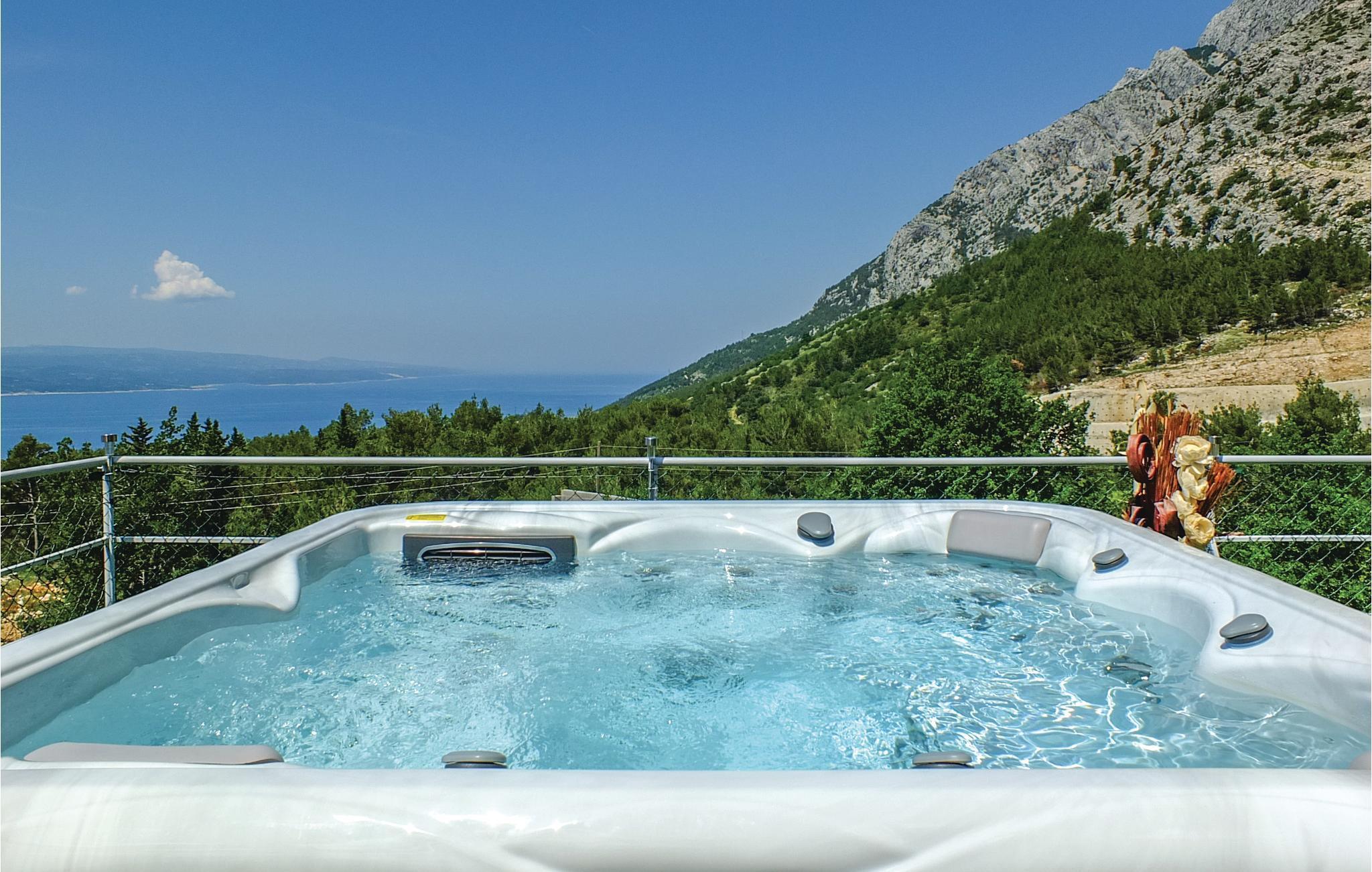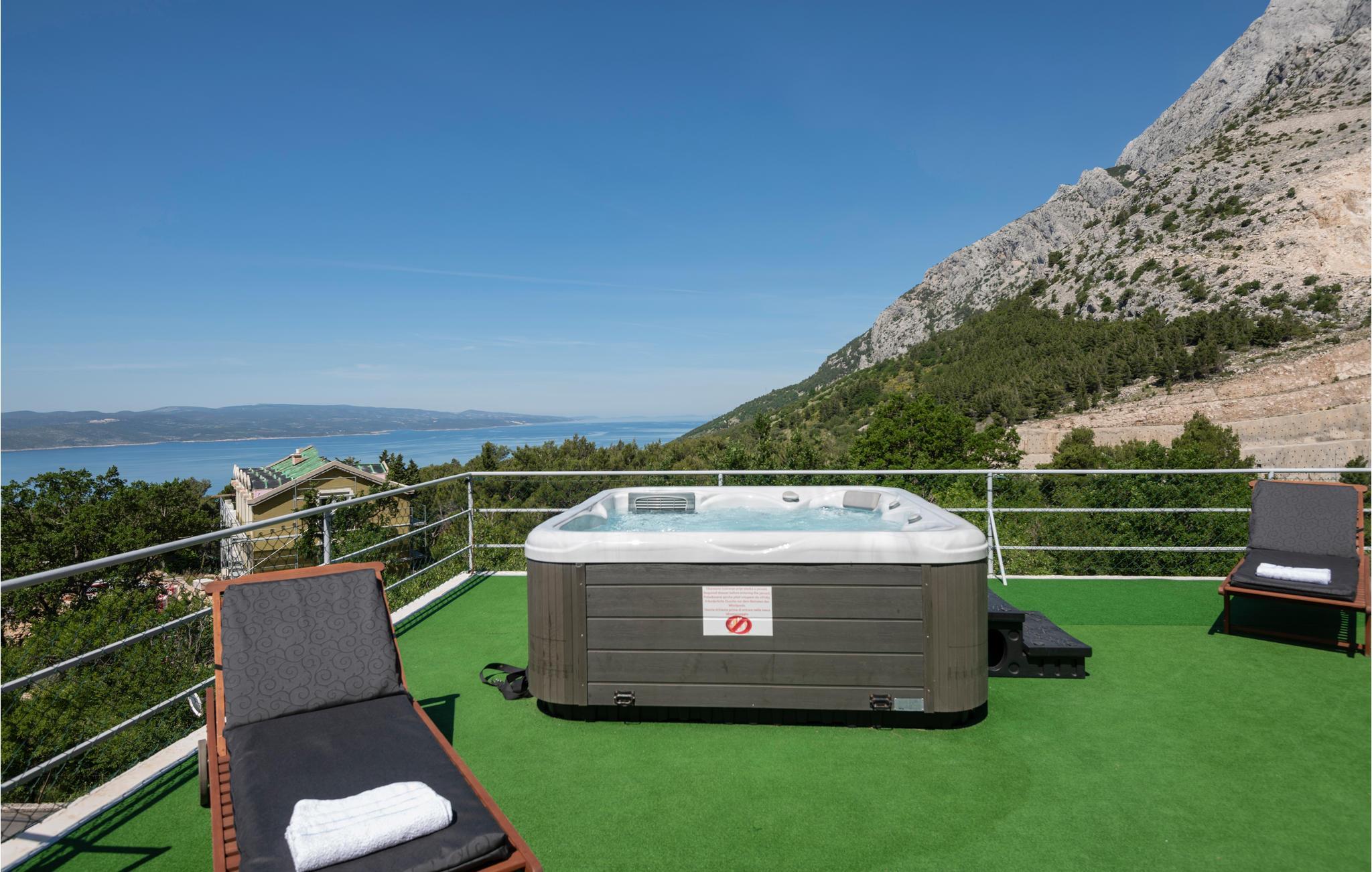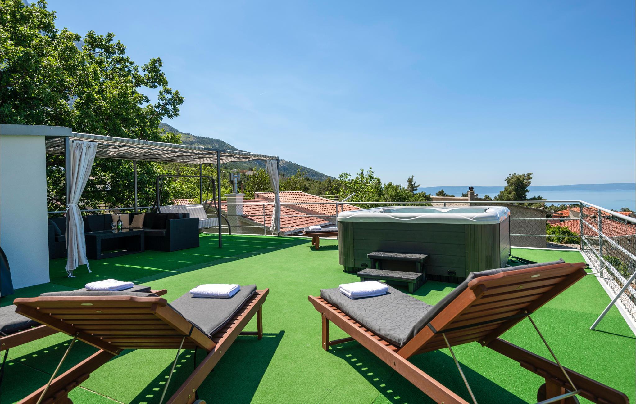Detta vackert inredda och välutrustade semesterhus ligger vid foten av berget Biokovo, i den vackra, historiska byn Bast nära Baka Voda. Det består av en bottenvåning och en första våning, medan det på taket finns en terrass med bubbelpool. Här kan ni koppla av och njuta av utsikten över havet och öarna. På bottenvåningen finns också ett utomhuskök med grill och en annan möblerad terrass. Staden Makarska med sina många bekvämligheter ligger bara 10 kilometer bort, medan den vackra staden Baka Voda ligger bara 4 km från Bast.