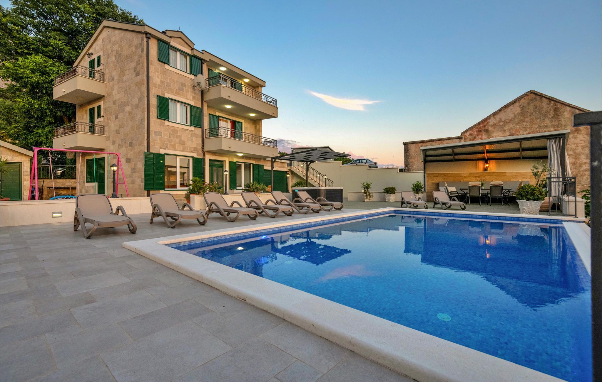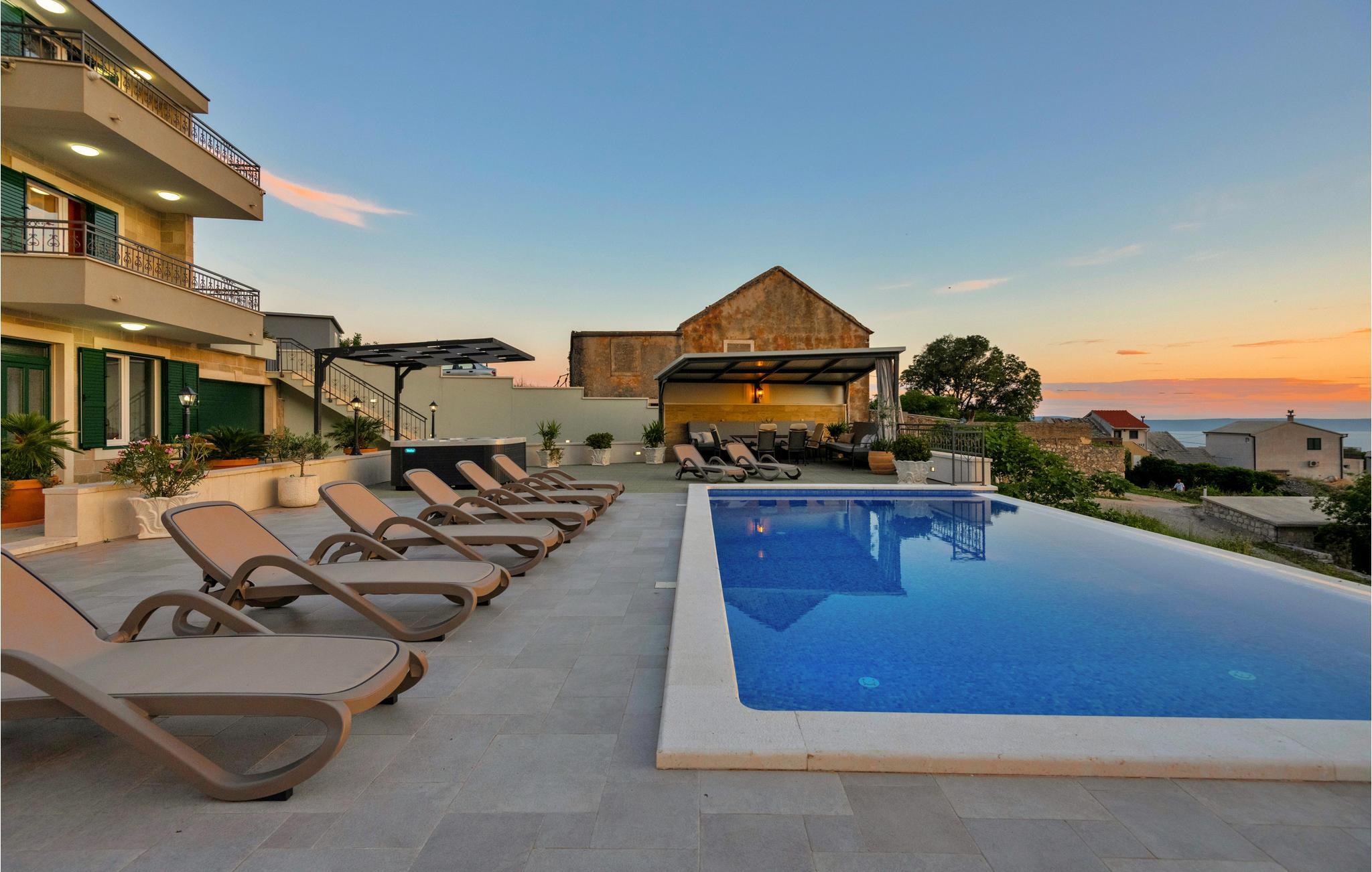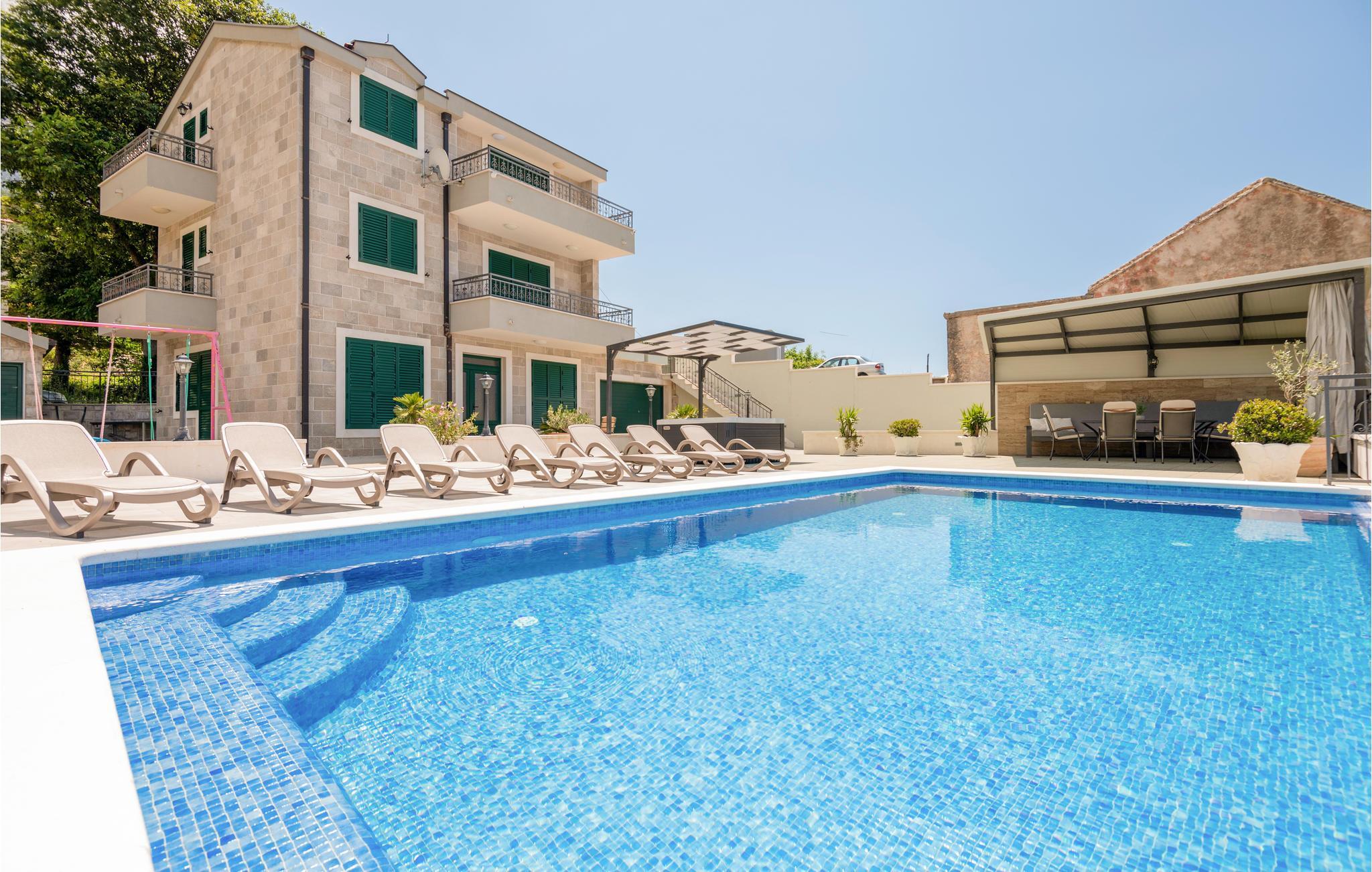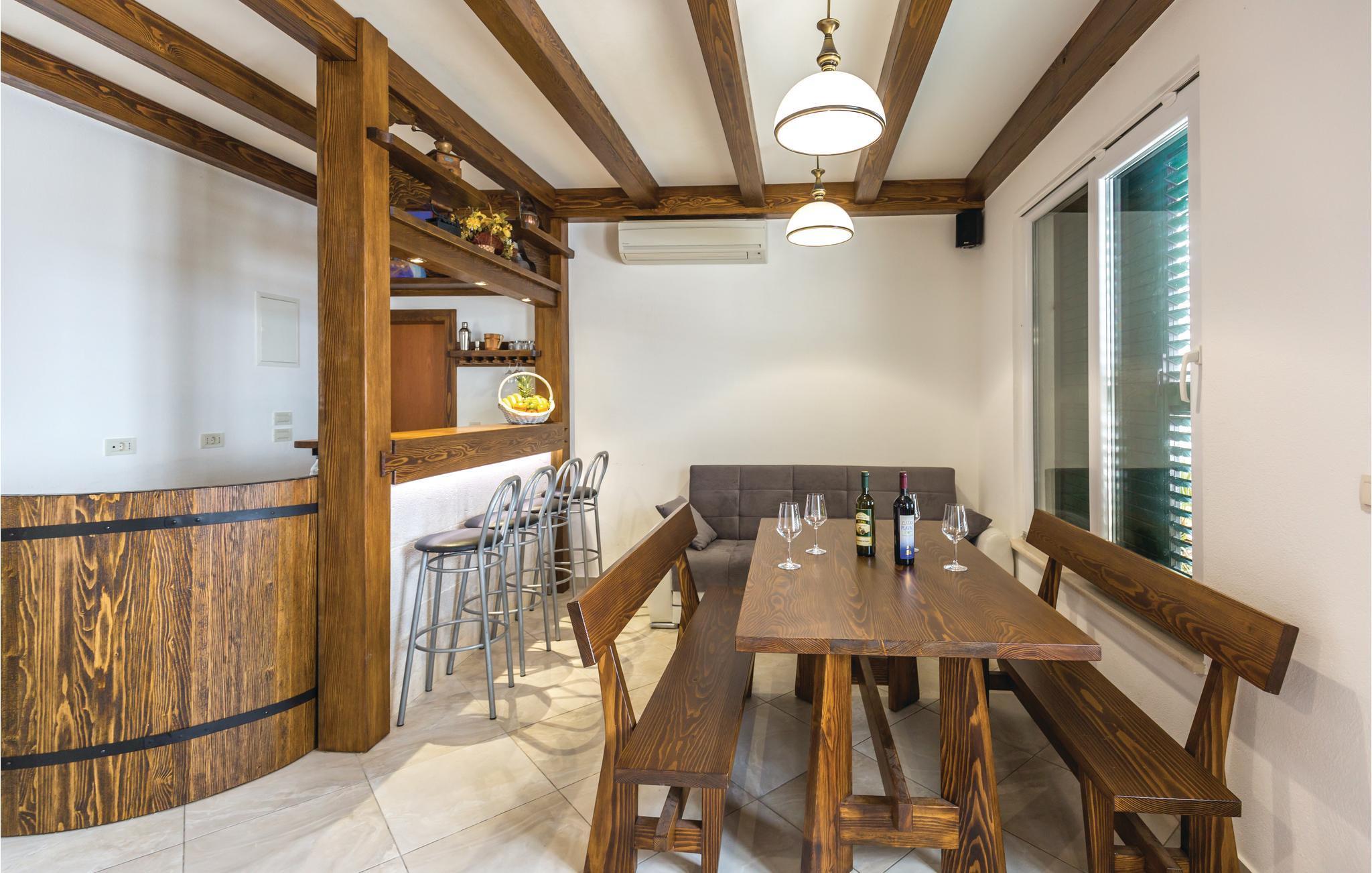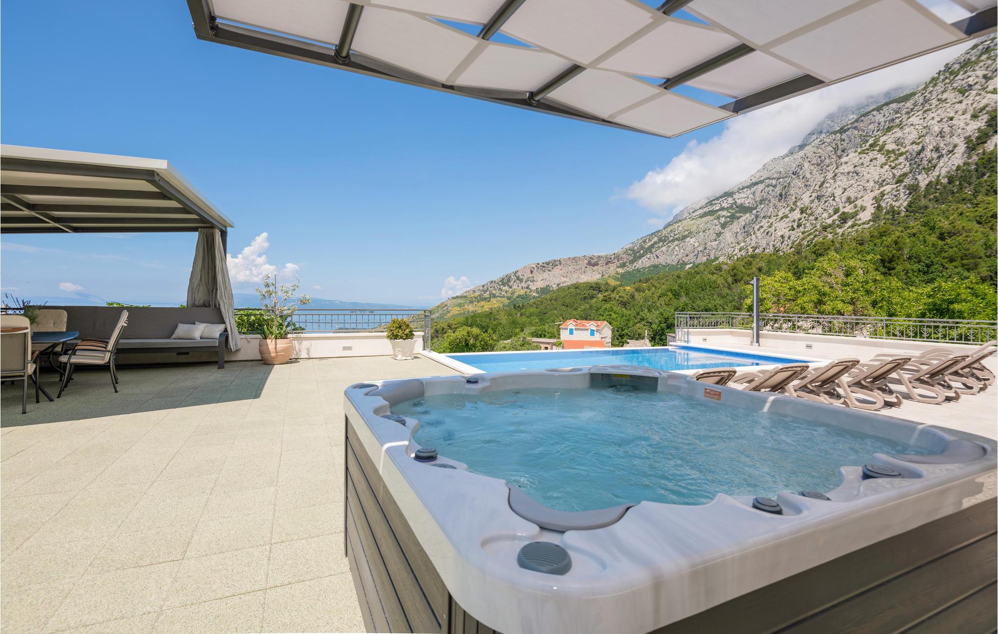 Detta vackra stenhus med pool ligger nedanför Biokovo naturpark och erbjuder en fantastisk utsikt över öarna i centrala Dalmatien och byn Tuepe. De två bostadsenheterna i huset ligger på 1: a och 2: a våningen och är förbundna med inre trappor. Vardagsrummet med kök på bottenvåningen har en separat ingång, framför den ligger poolen, en lekplats och en grillterrass ligger bredvid den. I källaren finns ett aktivitetsrum med biljard och pikado samt ett gym. En bekväm interiör och läget för detta semesterhus är bara två av argumenten för att välja denna semesterfastighet. Makarska ligger bara ca 5 km från denna semesterort, där du förutom de vackra och vidsträckta stränderna också hittar ett brett utbud av restauranger som serverar traditionell medelhavsmat. Upptäck Adriatiska havets skönhet och besök öarna Brac och Hvar. Missa inte staden Omis, där floden Cetina rinner ut i havet, en plats för sportentusiaster som letar efter en adrenalinkick. Regionen Dalmatien kommer att finnas kvar i ditt minne om du besöker en av fiskefestivalerna eller en konsert med dalmatiska folkgrupper under din sommarsemester.