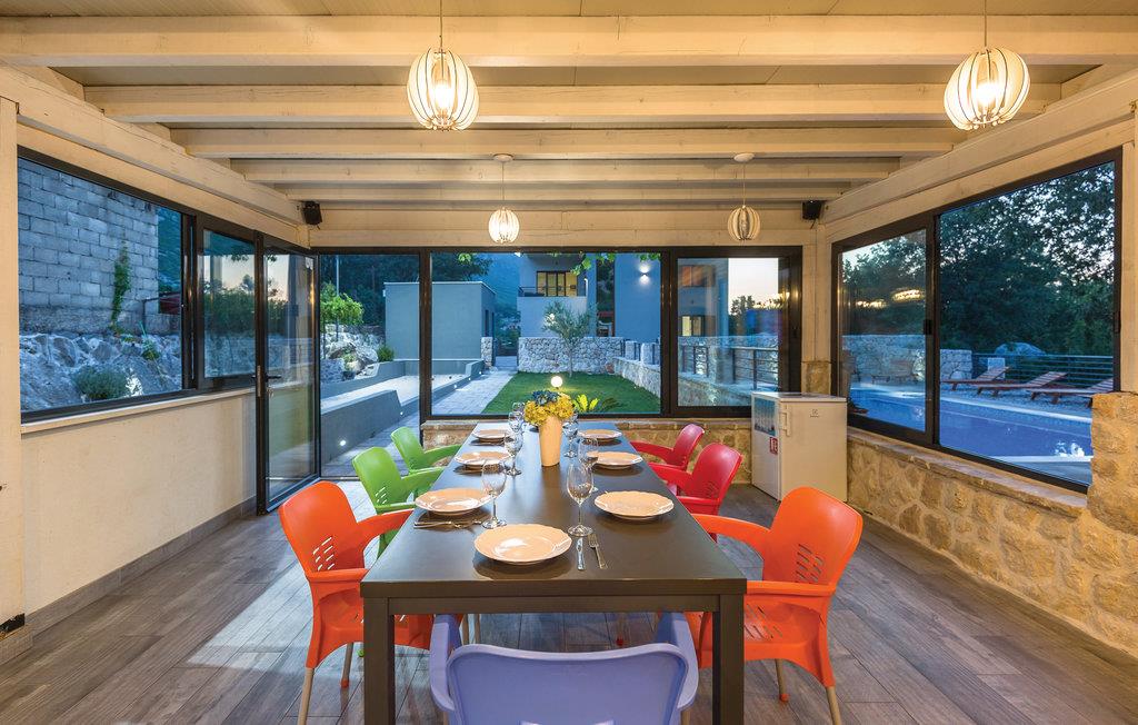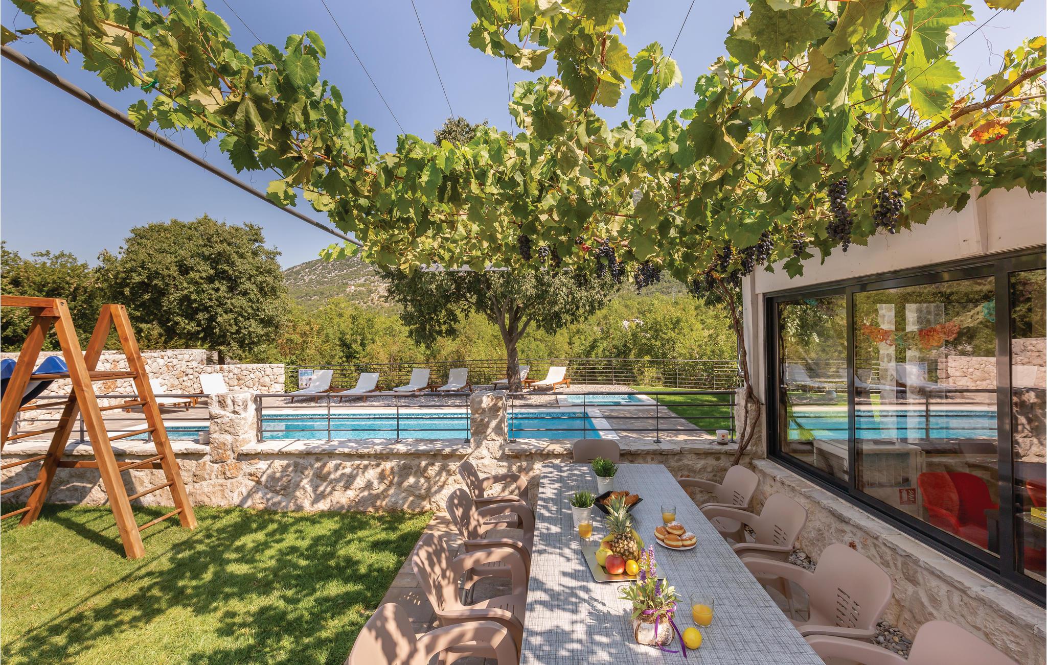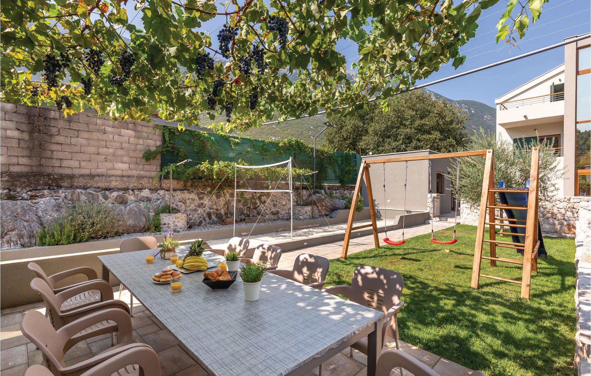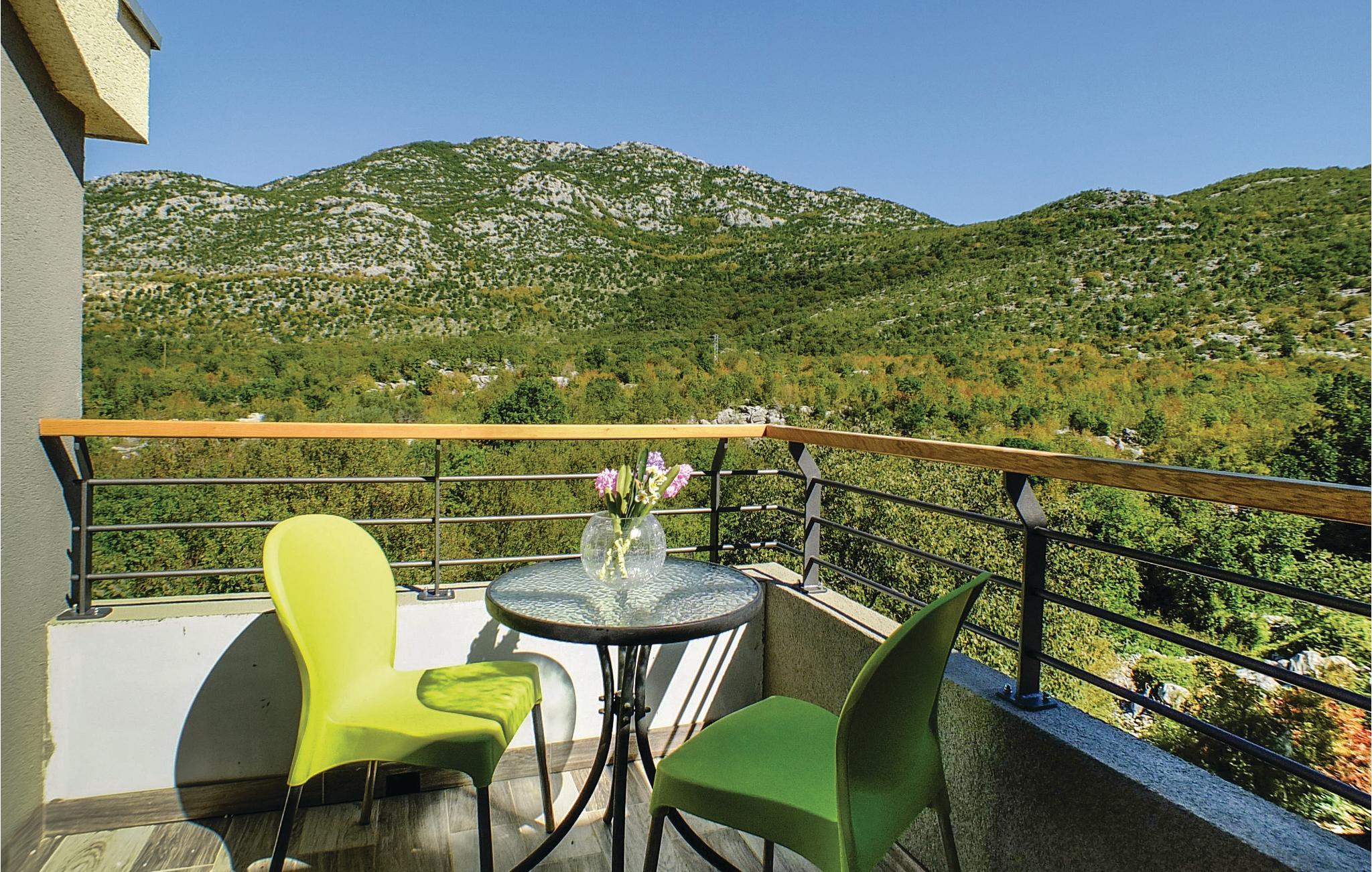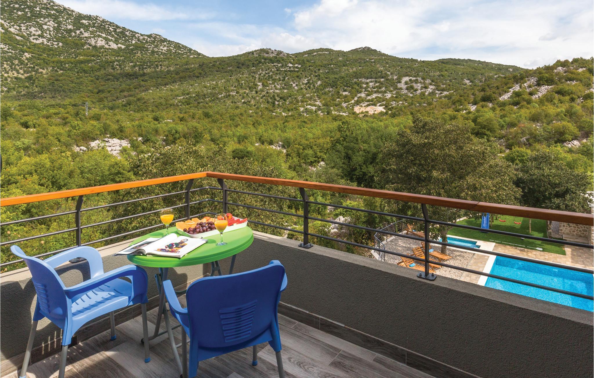 I det inre av Dalmatien, i den norra delen av naturparken Biokovo, hittar du detta vackert inredda och välutrustade semesterhus. Det består av fyra separata boendeenheter. Boendeenheterna på bottenvåningen har en separat ingång, medan boendeenheterna på första och andra våningen är sammankopplade via en intern trappa. På den välskötta fastigheten finns en stor pool där du kan fräscha upp dig medan du förbereder olika läckra rätter på grillen i uteköket. Aktivitetsrummet, lekplatsen och utomhusinnehållet ger trevlig underhållning. De vackra stränderna på Makarska Rivieran ligger cirka 10 minuters bilresa bort.