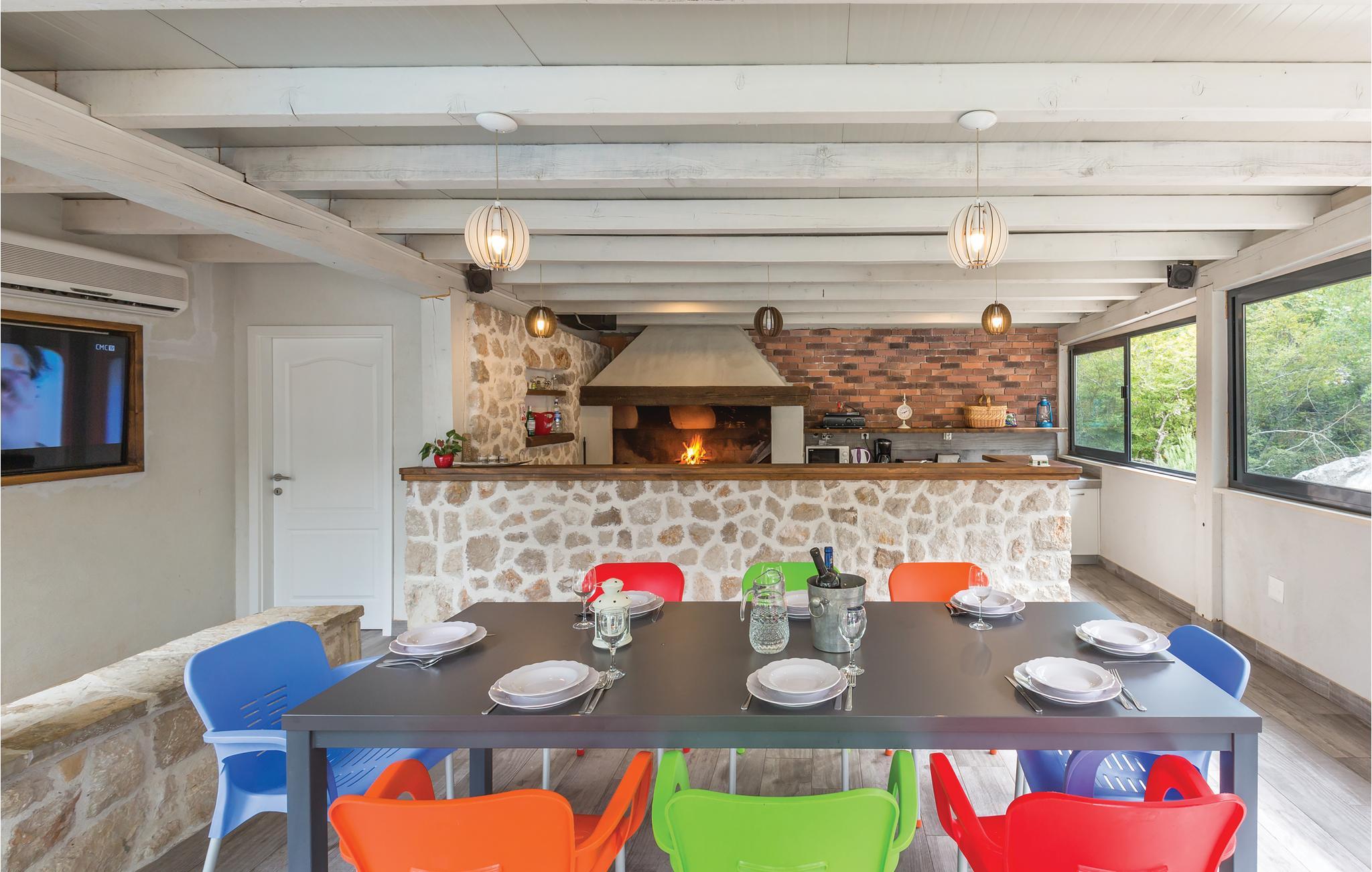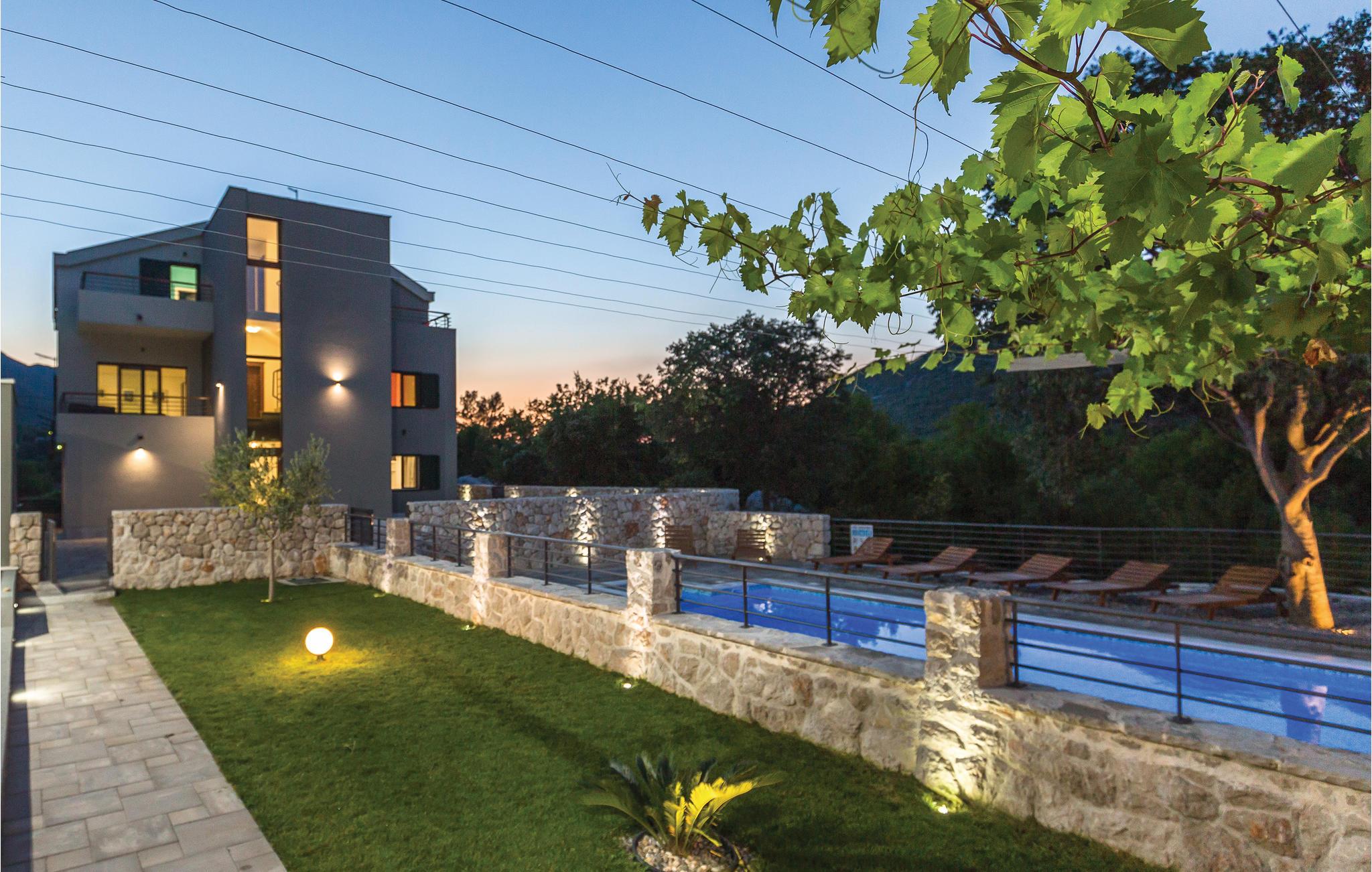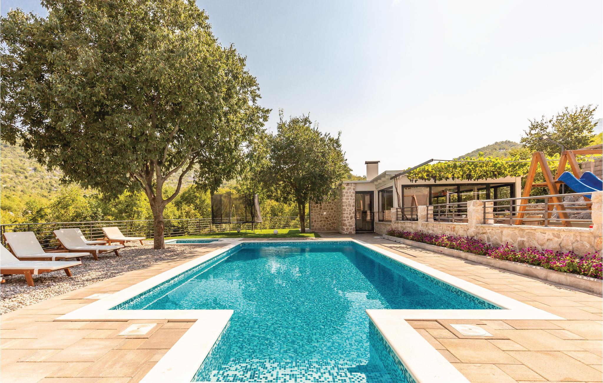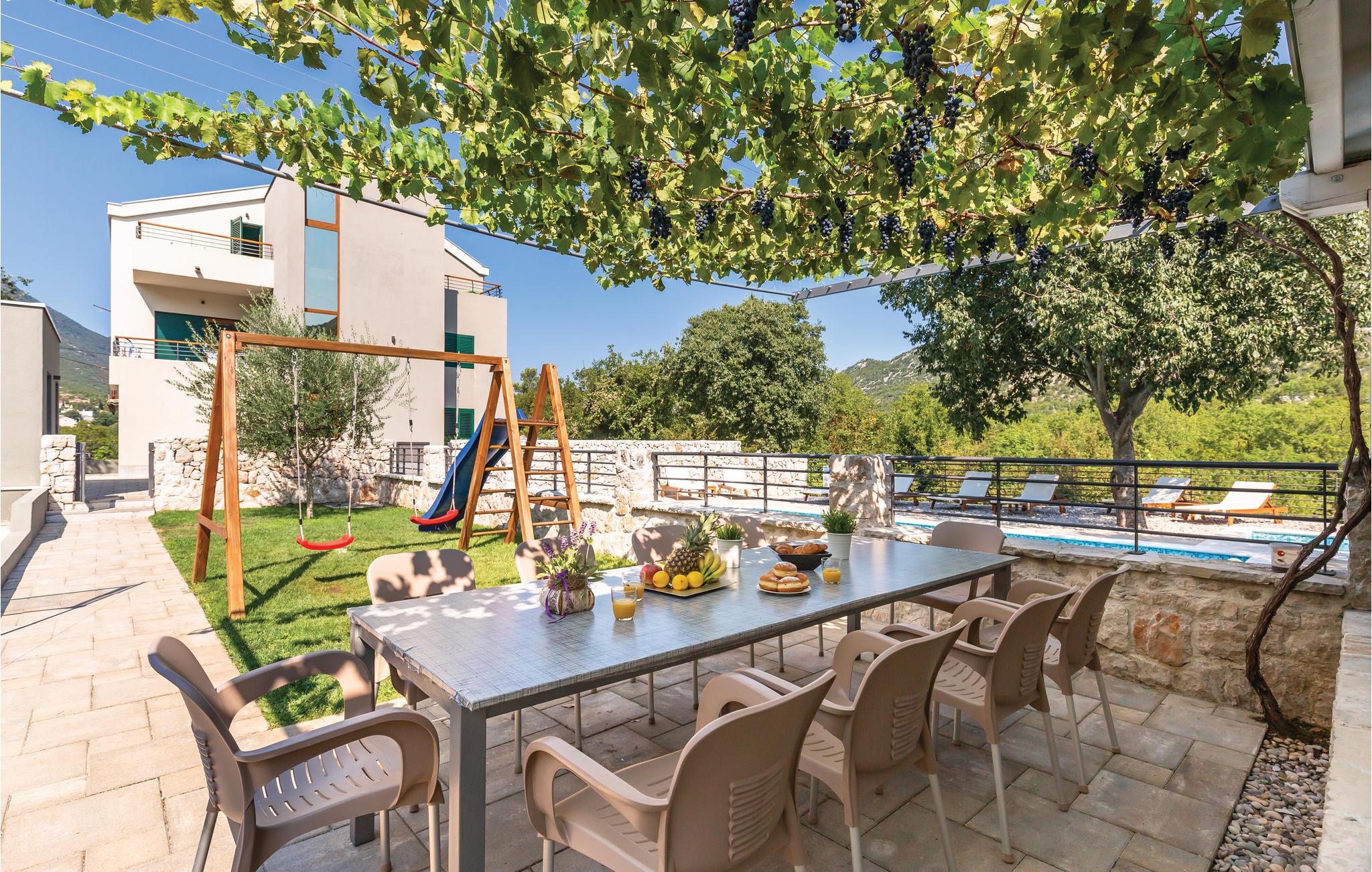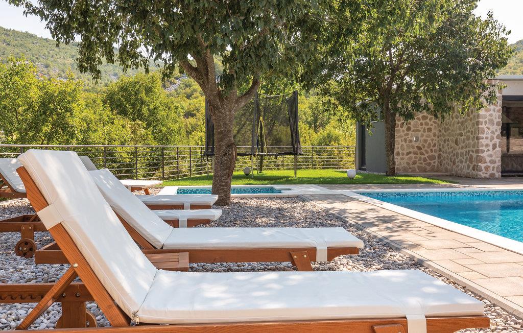I det inre av Dalmatien, i den norra delen av naturparken Biokovo, hittar du detta vackert inredda och välutrustade semesterhus. Det består av fyra separata boendeenheter. Boendeenheterna på bottenvåningen har en separat ingång, medan boendeenheterna på första och andra våningen är sammankopplade via en intern trappa. På den välskötta fastigheten finns en stor pool där du kan fräscha upp dig medan du förbereder olika läckra rätter på grillen i uteköket. Aktivitetsrummet, lekplatsen och utomhusinnehållet ger trevlig underhållning. De vackra stränderna på Makarska Rivieran ligger cirka 10 minuters bilresa bort.
