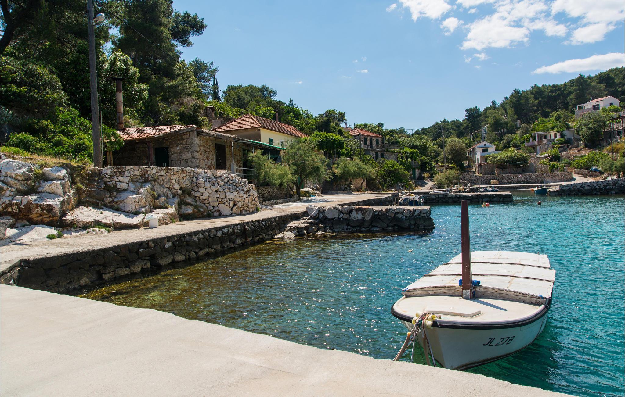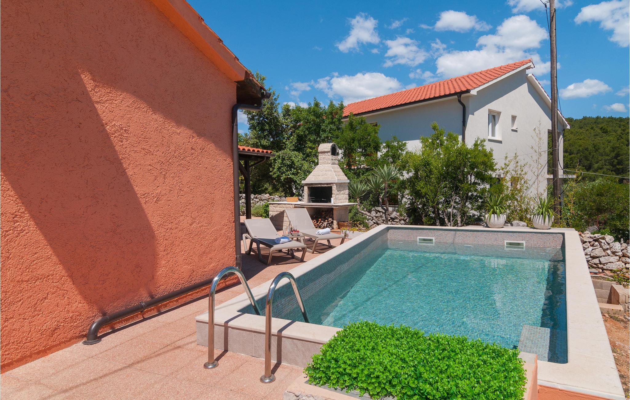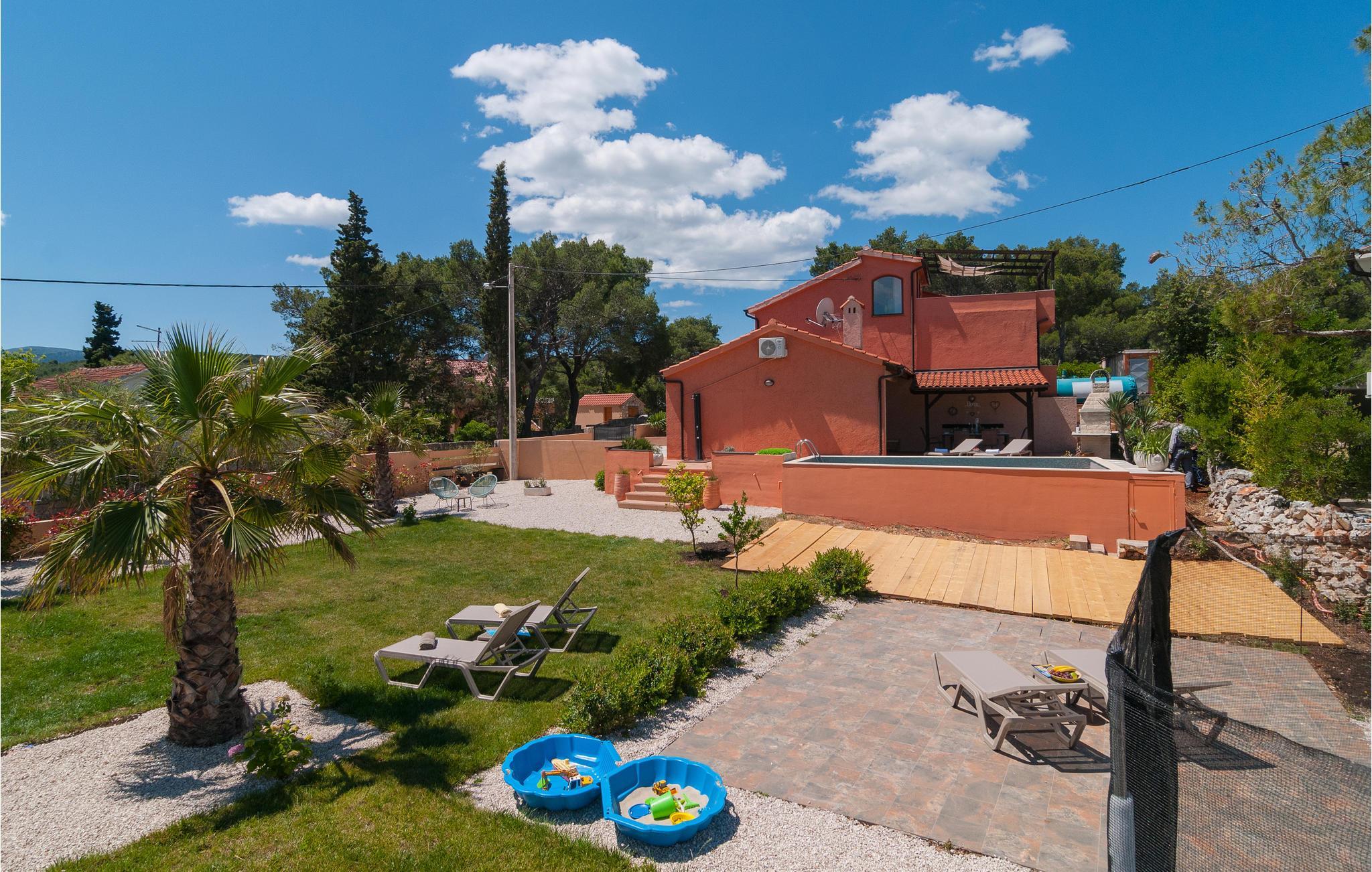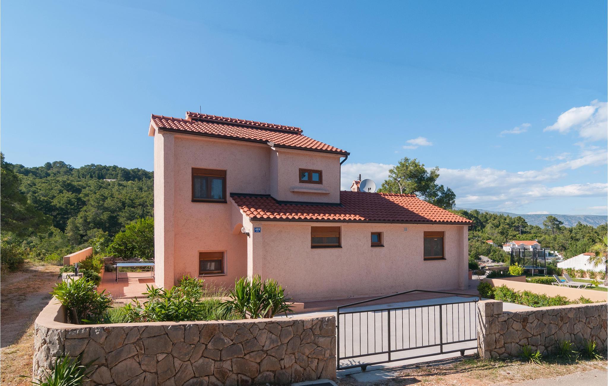 Detta trevliga semesterhus ligger i bukten Mudri Dolac. Det är omgivet av pinjeträd och medelhavsväxter, perfekt för en familjesemester. Det har en terrass och en stengrill där du kan koppla av eller ta en förfriskning i poolen. Fritiden kan spenderas med att spela bordtennis eller idrotta på studsmattan. Det finns fyra sovrum och en bastu på vinden, varifrån du når terrassen. Alla våningar är förbundna med invändiga trappor. Småstensstranden ligger ca 150 m nedåt. Endast 5 km längre bort ligger större städer på ön där du kan njuta av natur och kulturella skönheter och traditionella rätter på restaurangerna. På grund av läget rekommenderas bil.