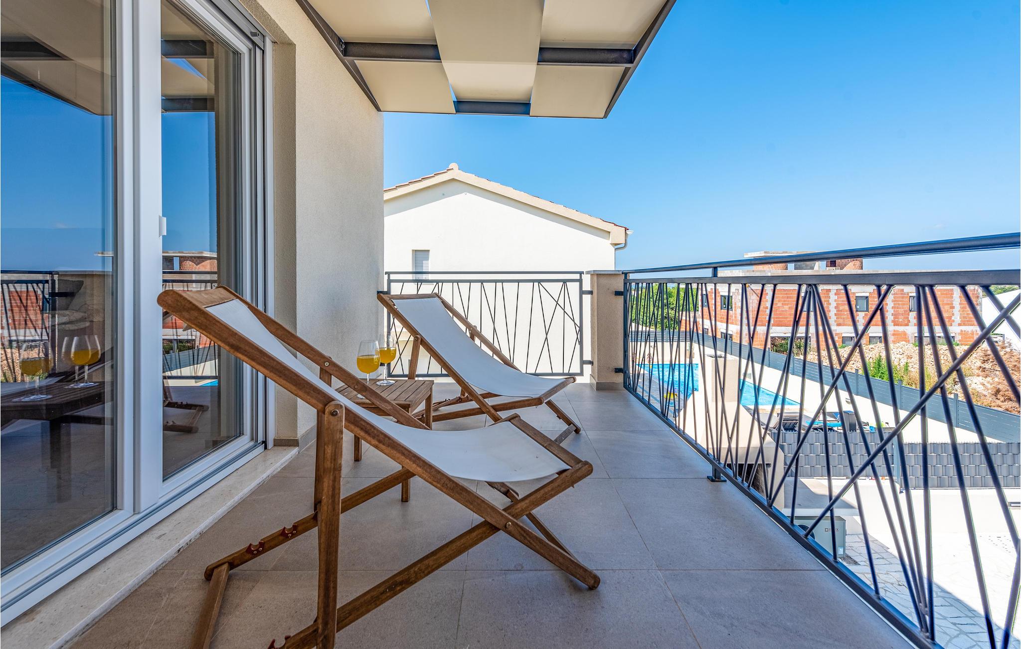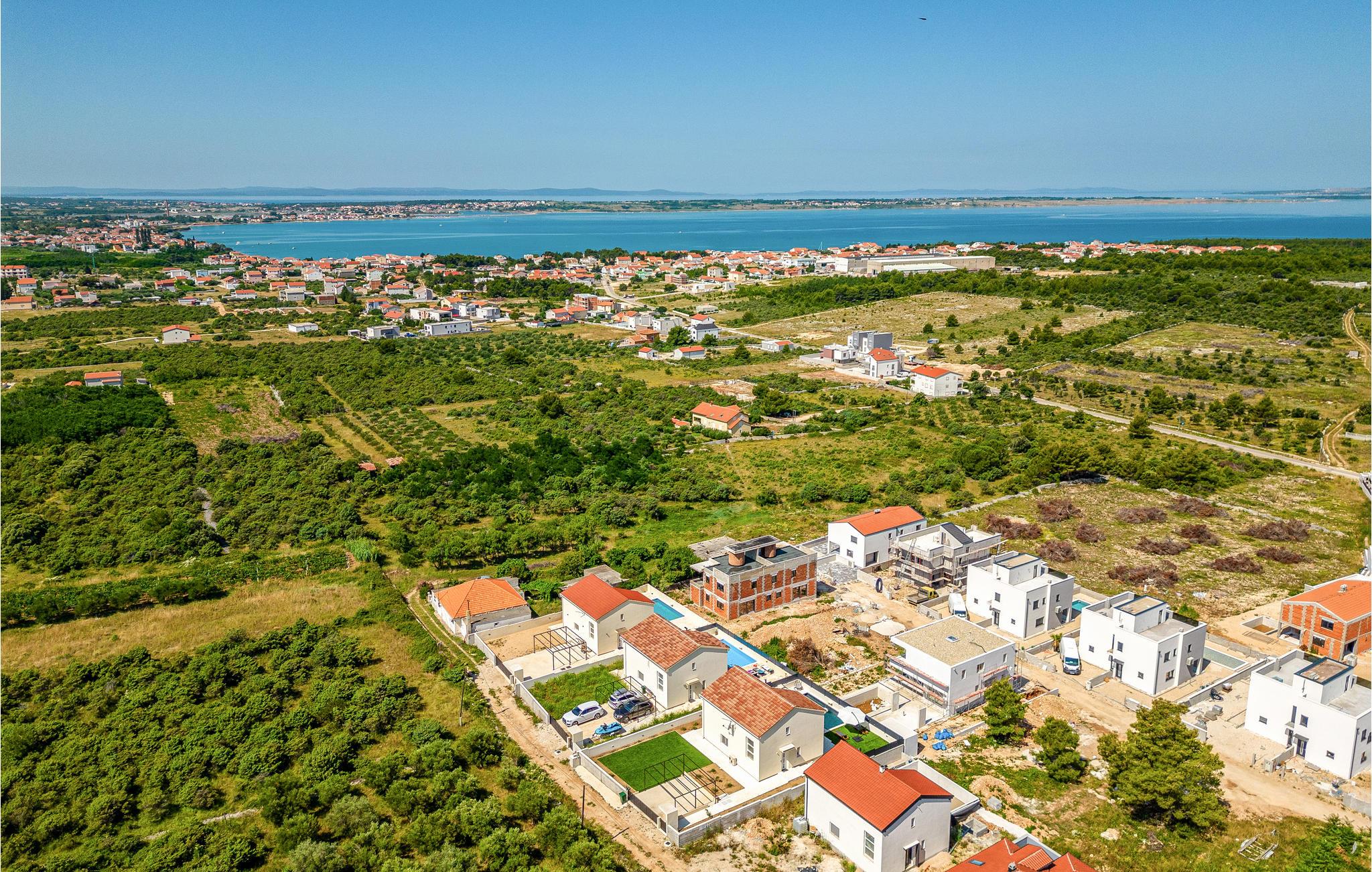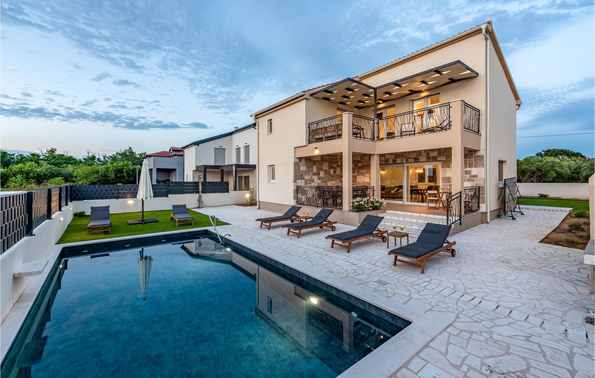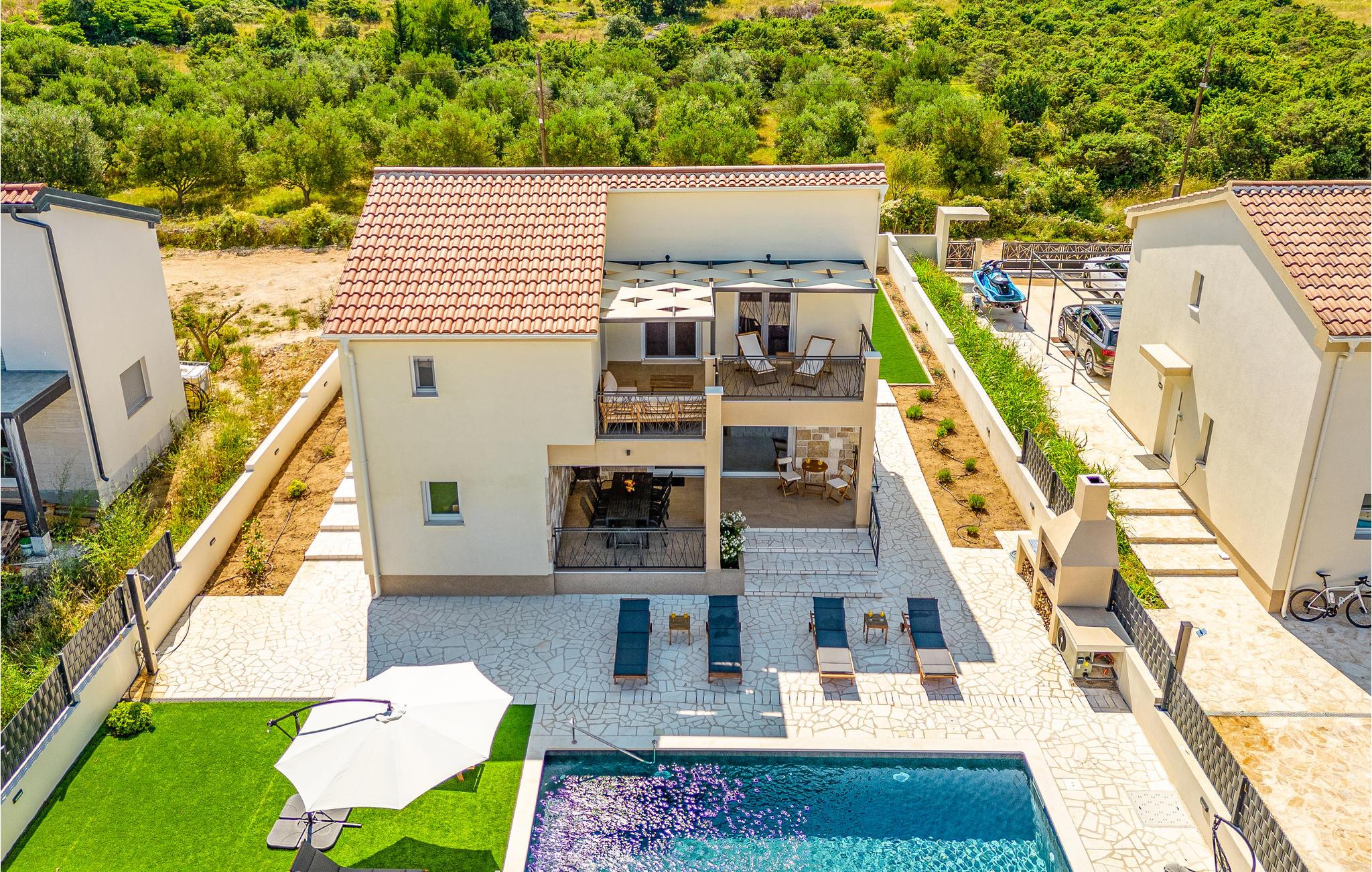 Välkommen till Vrsi och detta inbjudande hus på två våningar. Här kan du och din familj koppla av och njuta av hemmets alla bekvämligheter. Jordnära och ljusa färger samt bekväma möbler gör boendet till ditt andra hem och erbjuder dig stora möjligheter. Använd träskedarna i köket eller spela brädspel vid matbordet. På både första våningen och bottenvåningen kan du njuta av de rymliga terrasserna medan du äter eller kopplar av. Från den övre terrassen kan du inte bara se dina nära och kära i poolen, utan också få den första glimten av havet.