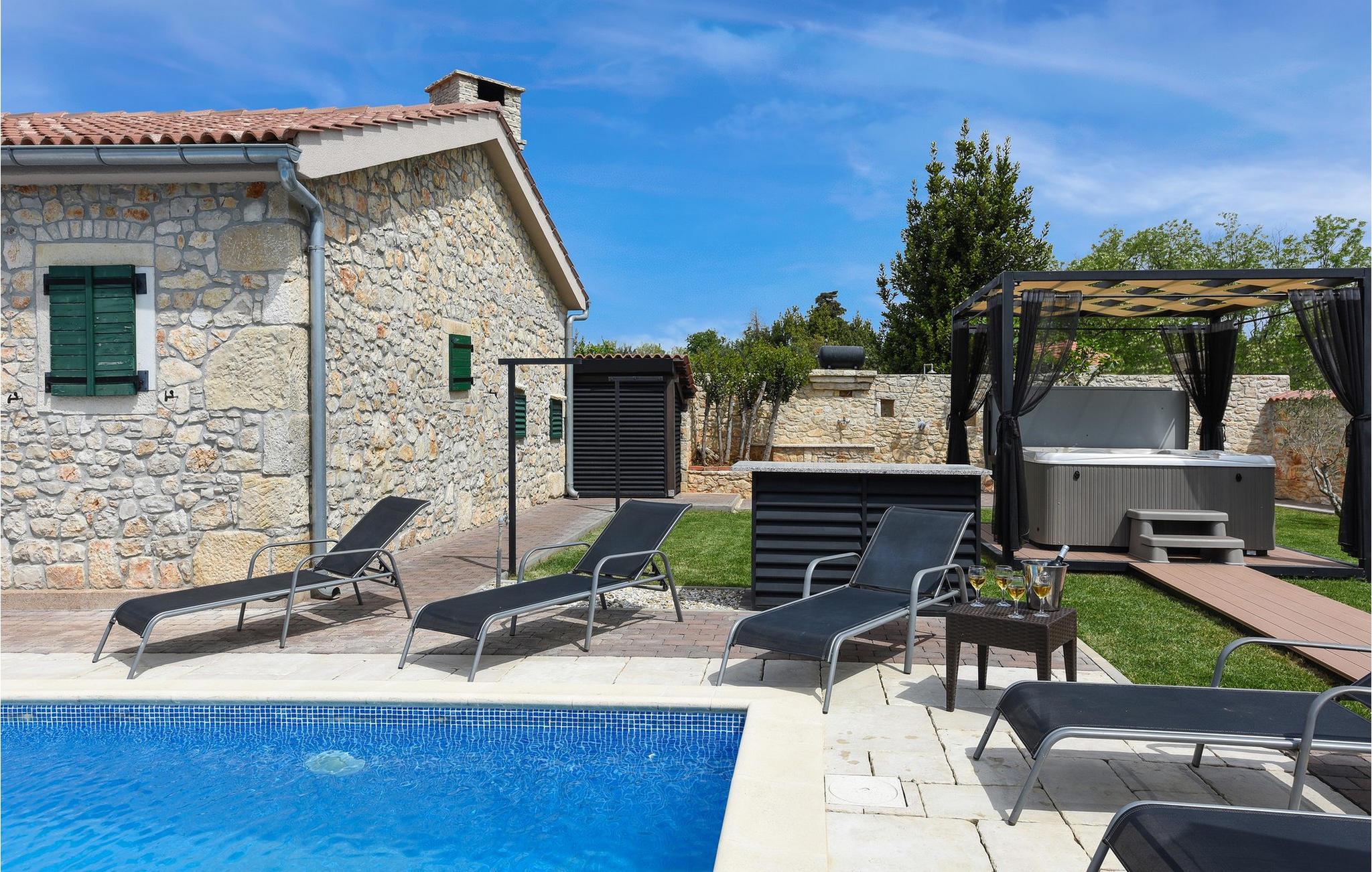 Det skyddade utomhusområdet är perfekt för att njuta av Kroatiens underbara klimat till fullo när som helst på dygnet. Ta ett dopp i poolen så fort du vaknar - dess belysning gör även nattbad till en oförglömlig upplevelse. Ladda batterierna på solstolen, unna er mysiga stunder i bubbelpoolen och skåla för er tid tillsammans med ett glas vin i solnedgången. I sommarköket kan du laga läckra tillbehör till dina grillkvällar och uppleva mysiga kvällar i gott sällskap.