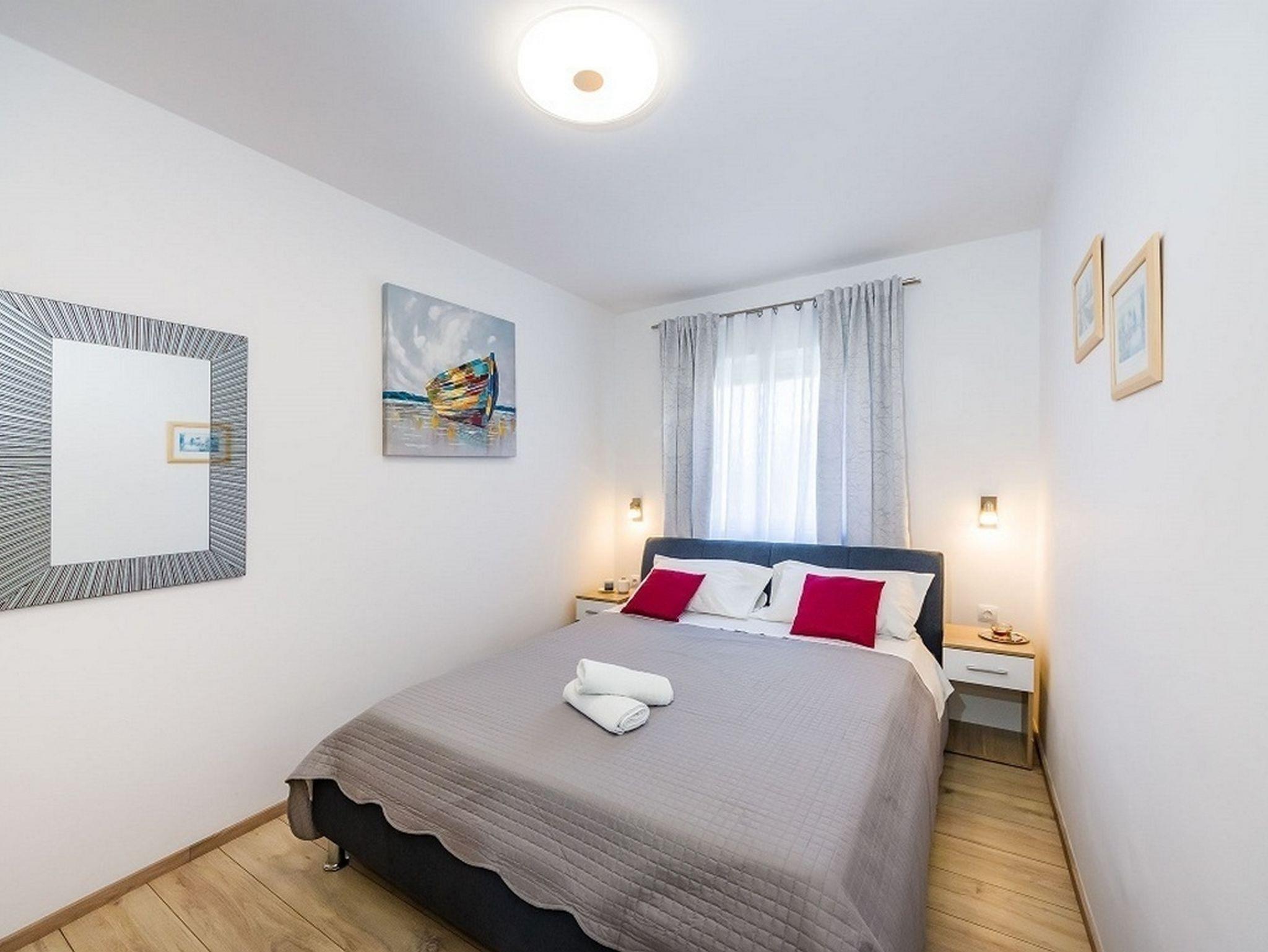 Ferienwohnung bietet Platz für 5 Gäste. Die Betten sind in Schlafzimmern, die es 2 gibt, und in Wohnzimmer, innerhalb einer Gesamtfläche von 41m2, angeordnet. Die Gäste haben eine eigene Terrasse zur Verfügung, auf der sie in warmen Sommernächten genießen können. Es ist erlaubt, Speisen auf dem Gemeinschafts-Grill vorzubereiten. IM PREIS INBEGRIFFEN: Kurtaxe, Endreinigung, Klimatisierung, Parkplatz, Internet, Kinderbett. VERBINDLICHE ZUSÄTZLICHE KOSTEN: Aufzahlung für Kurzaufenthalte (prozentualer Zuschlag pro Nächtigungsanzahl: 30% - 1, 20% - 2, 10% - 3). UNVERBINDLICHE ZUSÄTZLICHE KOSTEN: Wäschewaschen (3,00 € Waschen). Die Verfügbarkeit zusätzlicher Dienstleistungen in Ihrem reservierten Termin und die Preise derselben (falls nicht aufgeführt) müssen im Voraus überprüft werden. Zusätzliche Dienstleistungen die in der Zahlungsaufforderung nicht aufgeführt sind werden direkt beim Vermieter bezahlt, angenommen der Gast nutzt auch diese.