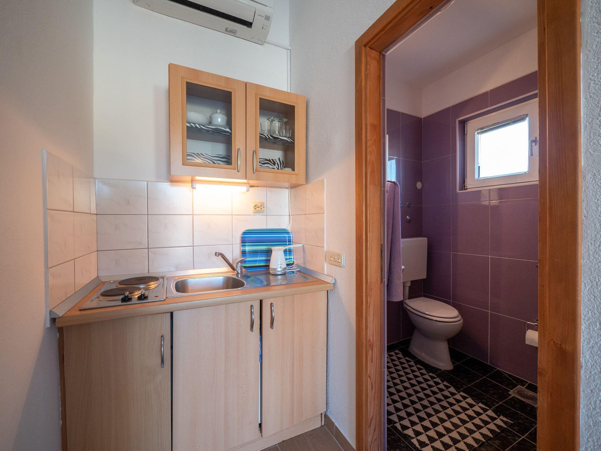 Studio bietet Platz für 2 Gäste. Die Betten sind in Schlafzimmern, die es 1 gibt, innerhalb einer Gesamtfläche von 16m2, angeordnet. Die Gäste haben eine eigene Terrasse zur Verfügung, auf der sie in warmen Sommernächten genießen können. Es ist erlaubt, Speisen auf dem Gemeinschafts-Grill vorzubereiten. In der Unterkunftseinheit besteht die Möglichkeit des Mitbringens von Haustieren gegen Aufpreis. IM PREIS INBEGRIFFEN: Kurtaxe, Endreinigung, Klimatisierung, Parkplatz, Internet. VERBINDLICHE ZUSÄTZLICHE KOSTEN: Aufzahlung für Kurzaufenthalte (prozentualer Zuschlag pro Nächtigungsanzahl: 30% - 1, 20% - 2, 10% - 3). UNVERBINDLICHE ZUSÄTZLICHE KOSTEN: Haustiere (10,00 € pro Nacht). Die Verfügbarkeit zusätzlicher Dienstleistungen in Ihrem reservierten Termin und die Preise derselben (falls nicht aufgeführt) müssen im Voraus überprüft werden. Zusätzliche Dienstleistungen die in der Zahlungsaufforderung nicht aufgeführt sind werden direkt beim Vermieter bezahlt, angenommen der Gast nutzt auch diese.