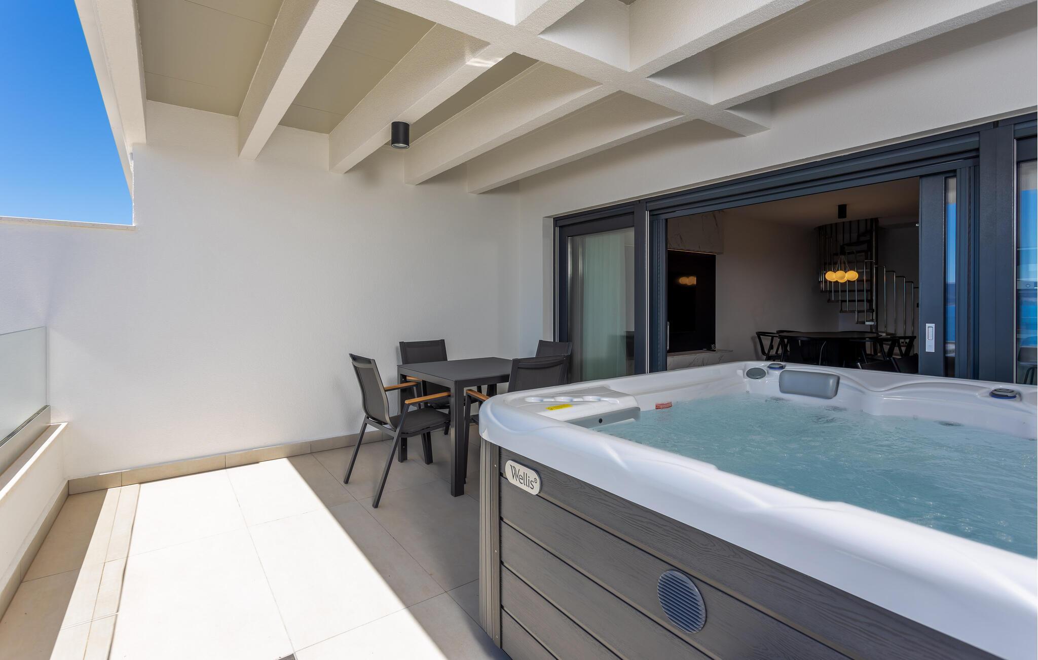 Den täckta terrassen med utomhuswhirlpool inbjuder till avkoppling och erbjuder en underbar utsikt över havet. Här kan du börja dagen med en utomhusfrukost eller avrunda kvällen med ett glas vin. Den smakfulla designen och den eleganta atmosfären gör att du omedelbart kommer att känna dig som hemma.
