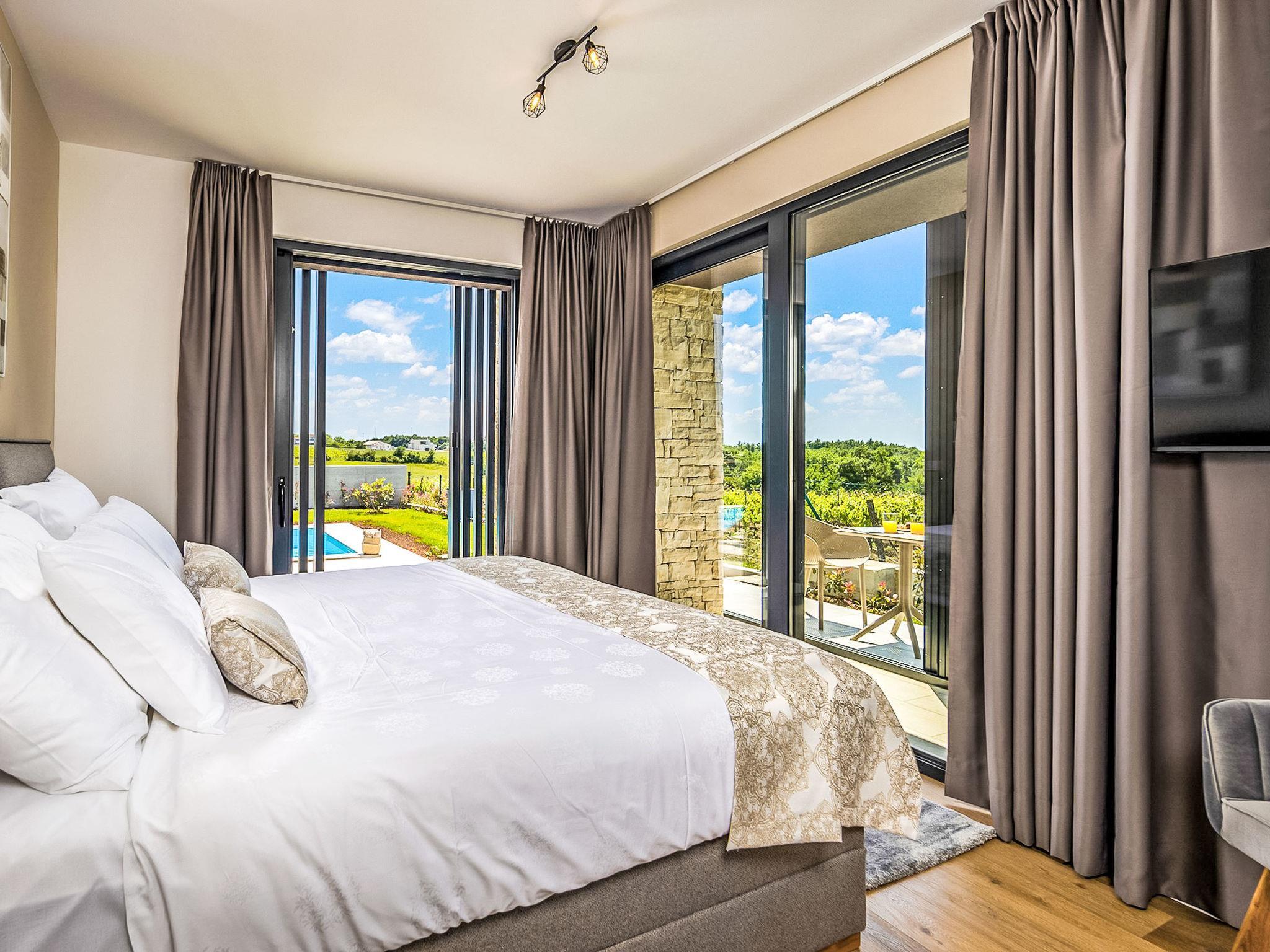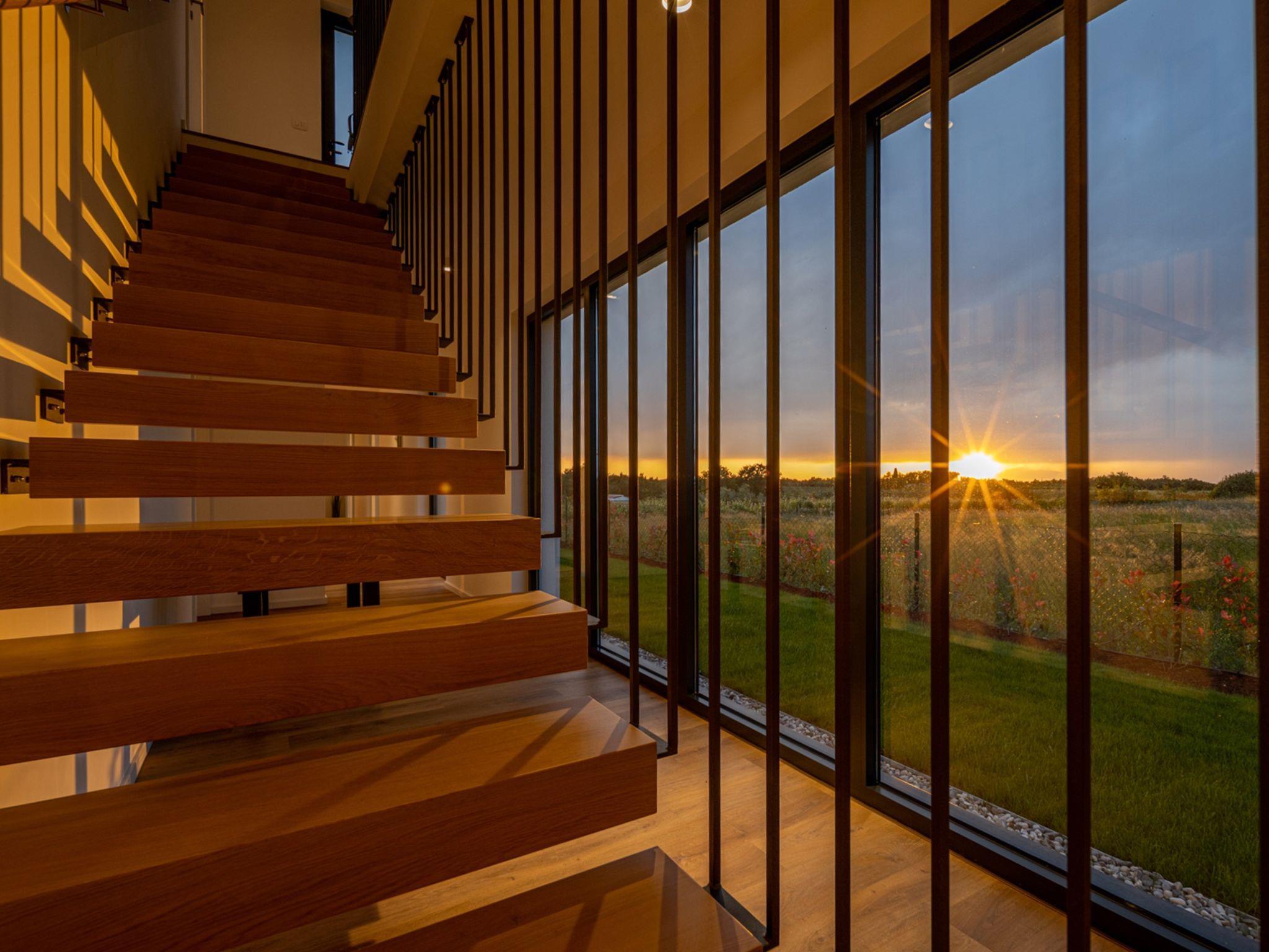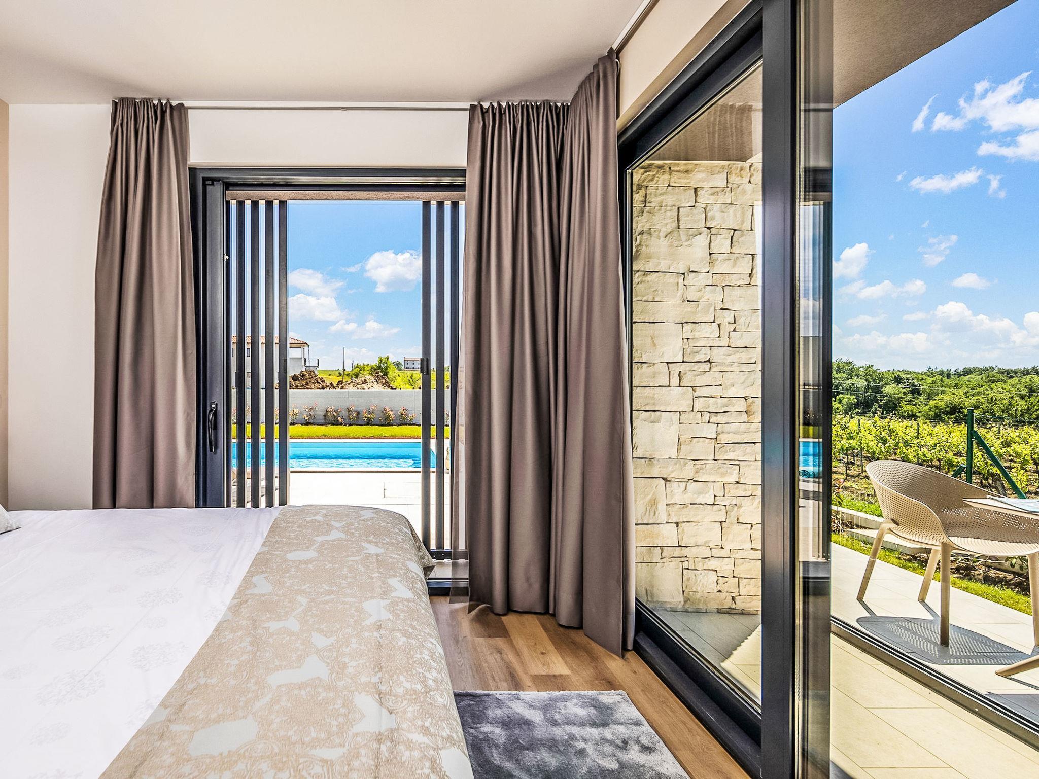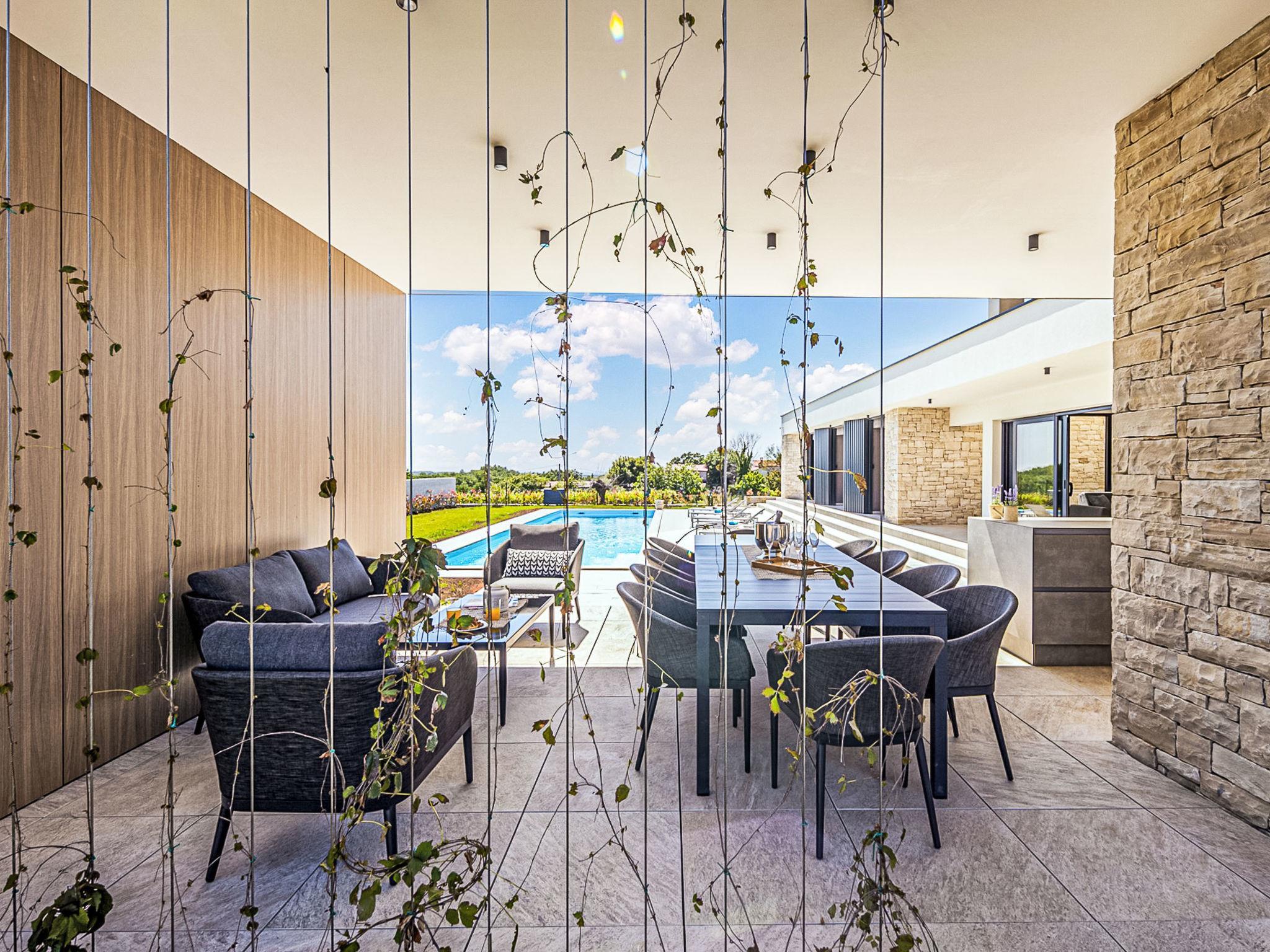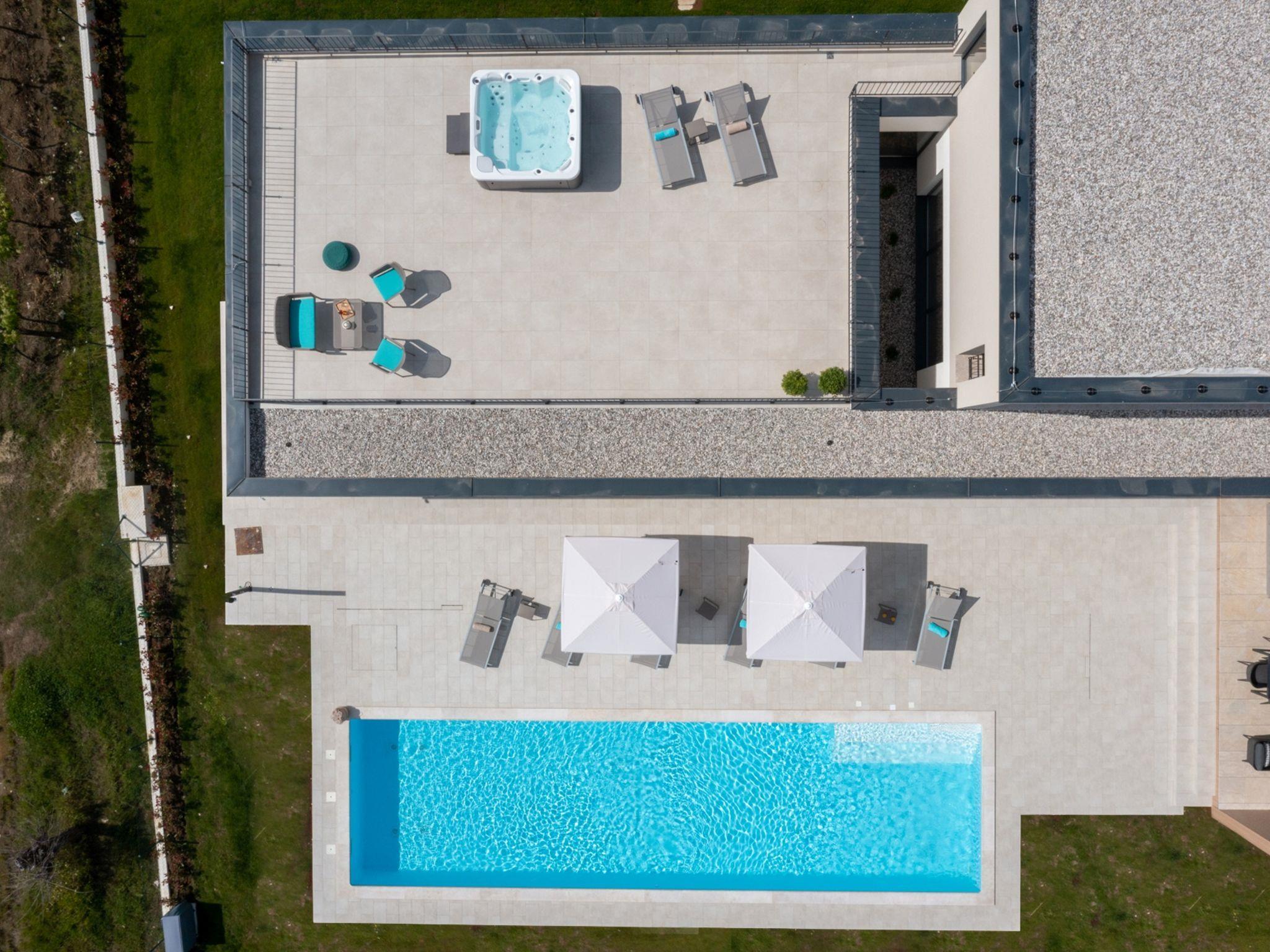 Modern, luxurious villa "La Perla", 2 storeys, built in 2021. 1 km from the centre of Nova Vas, 2 km from the centre of Brtonigla, 10 km from the centre of Novigrad, in a sunny position, 8.2 km from the sea. Private: property 900 m2 (fenced) with lawn, swimming pool angular, heated (60 m2, depth 135 cm, seasonal availability: 10.Apr. - 05.Nov.) with internal staircase. Outdoor shower, hot tub, badminton, terrace (10 m2), garden furniture, barbecue house. In the house: internet access, sauna, table football, trampoline, washing machine. Available: bicycles (2). Motor access (500 m via unmade road). Parking (for 4 cars) at the house on the premises. Shop 1.5 km, restaurant 650 m, bus stop 4 km, pebble beach 8.2 km. Walking paths from the house, cycle lane 100 m. Nearby attractions: Aquapark 2 km. Groups of teenagers on request only. Please note: airfield 20 km from the property. Swimming pool heated (extra). Video surveillance of the driveway and parking.