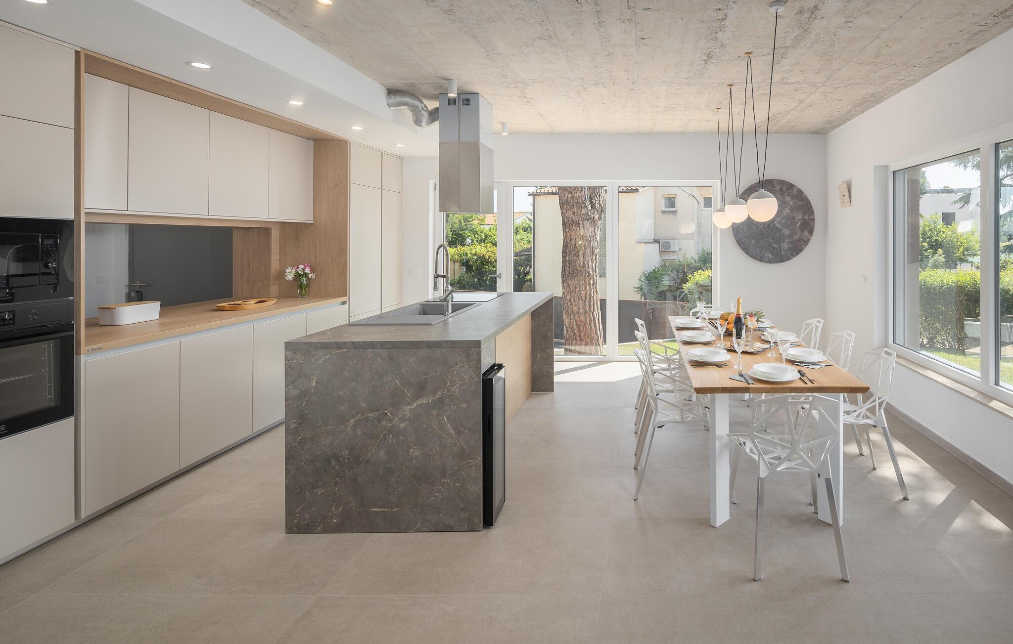 Detta unika semesterhus inbjuder dig att njuta av en underbar tid tillsammans med vänner eller familj. Se fram emot att laga mat tillsammans i det moderna köket och fira era måltider vid det eleganta matbordet. Njut av den ljusa atmosfären i det smakfullt inredda vardagsrummet tack vare de stora panoramafönstren och gör dig bekväm i soffområdet för mysiga filmkvällar.