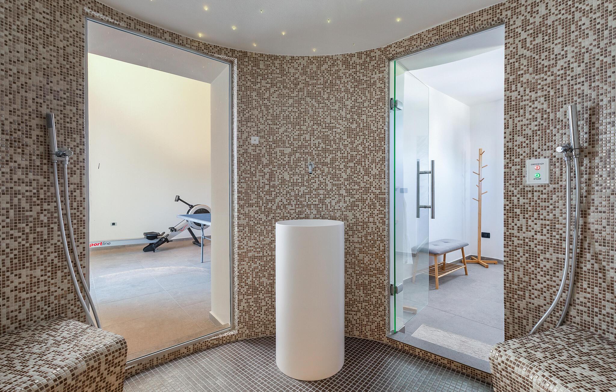 I detta exceptionellt stora och lyxiga semesterhus kan du förvänta dig ljusa, öppna ytor och högkvalitativa möbler som perfekt kombinerar avkoppling och elegans. Varje sovrum erbjuder maximal avskildhet med eget badrum. Fitness- och bordtennisrummet, ångbastun och de rymliga gemensamma utrymmena inbjuder till aktivitet och umgänge. Oavsett om du lagar mat i sommarköket eller kopplar av vid poolen på en av de många solstolarna, kommer du att uppleva ren avkoppling medan dina barn leker i trädgården.