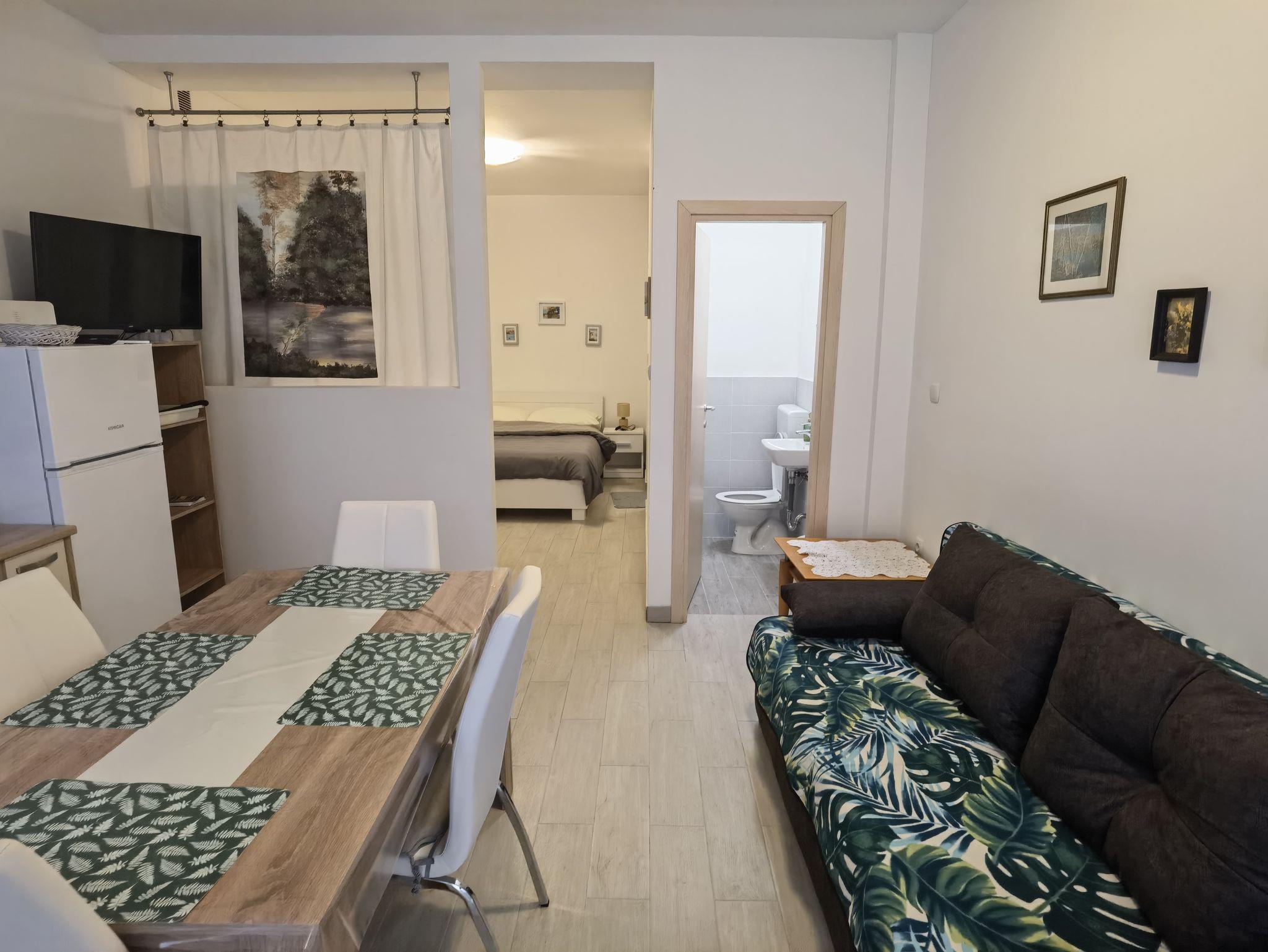 Studio bietet Platz für 3 Gäste. Die Betten sind in Schlafzimmern, die es 1 gibt, und in Wohnzimmer, innerhalb einer Gesamtfläche von 35m2, angeordnet. Die reservierte Unterkunftseinheit hat keinen Balkon und keine Terrasse. IM PREIS INBEGRIFFEN: Kurtaxe, Endreinigung, Klimatisierung, Parkplatz, Internet, Bügeleisen, Bügelbrett, Föhn. Die Verfügbarkeit zusätzlicher Dienstleistungen in Ihrem reservierten Termin und die Preise derselben (falls nicht aufgeführt) müssen im Voraus überprüft werden. Zusätzliche Dienstleistungen die in der Zahlungsaufforderung nicht aufgeführt sind werden direkt beim Vermieter bezahlt, angenommen der Gast nutzt auch diese. Ermäßigung auf den Grundpreis: Gratistag 14=13 (bei einem Aufenthalt von 14 Tagen oder mehr erhalten Sie einen Gratistag für den Aufenthalt bis 31.12.26).