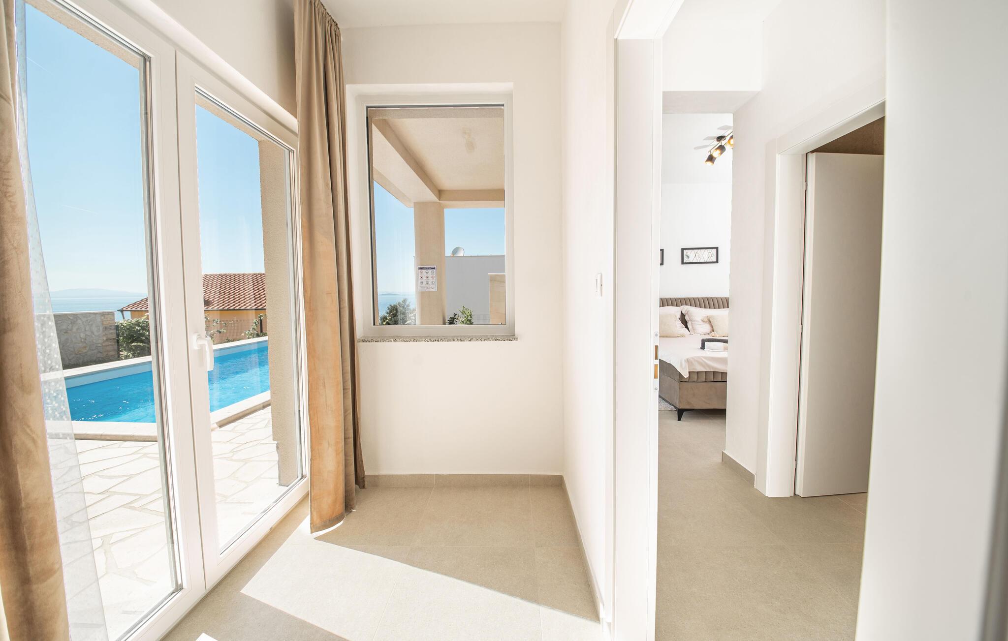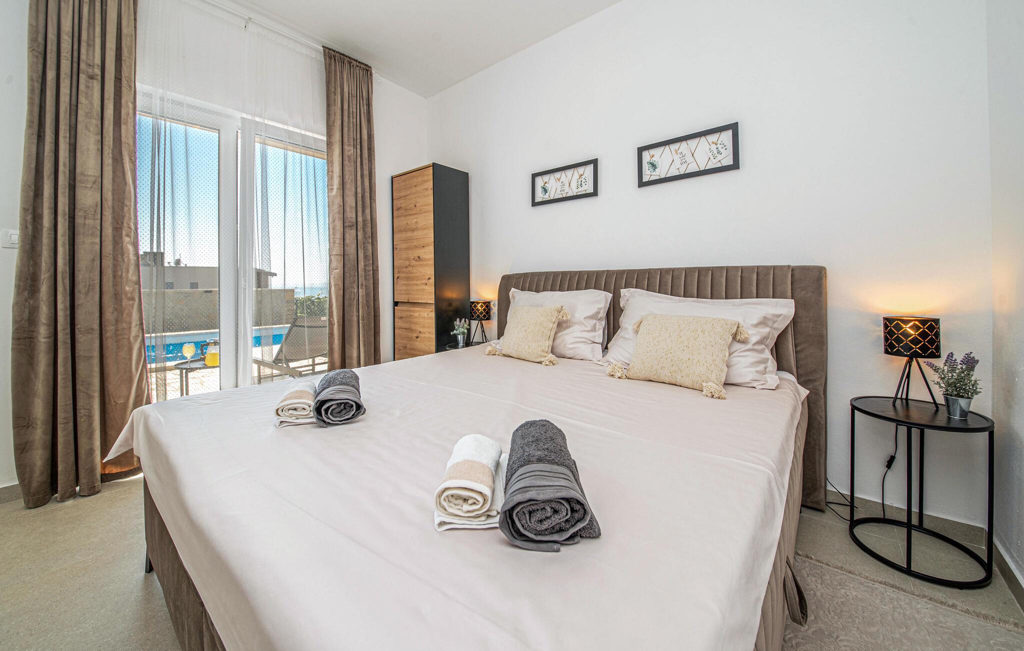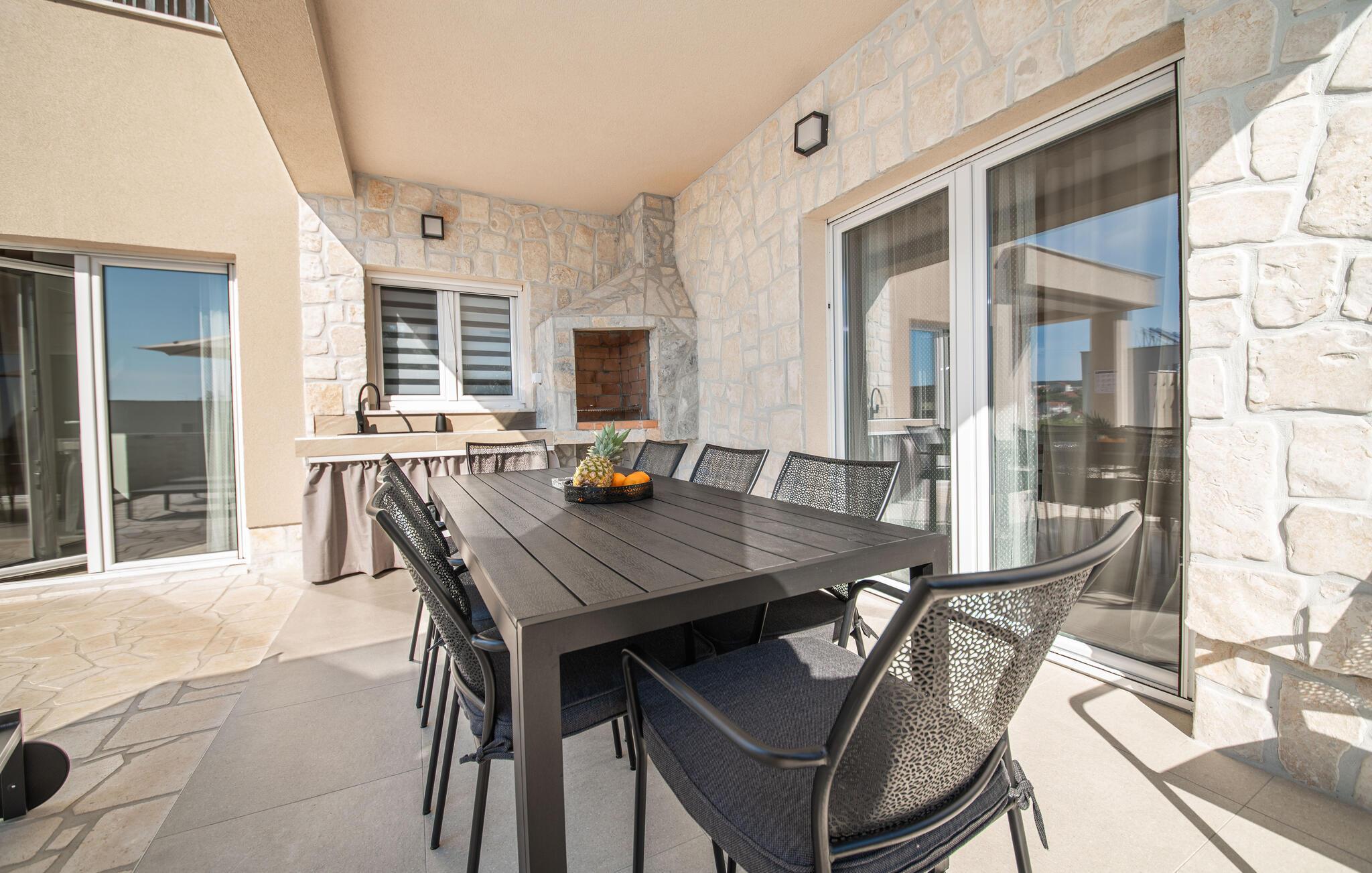 Detta moderna semesterhus ligger i Jakisnica på ön Pag och välkomnar dig med allt du behöver för en avkopplande vistelse. Husets höjdpunkt är den uppvärmda utomhuspoolen, som ger förfriskningar under varma sommardagar. Koppla av på de bekväma solstolarna vid poolen och njut av den underbara utsikten över havet från den rymliga terrassen.