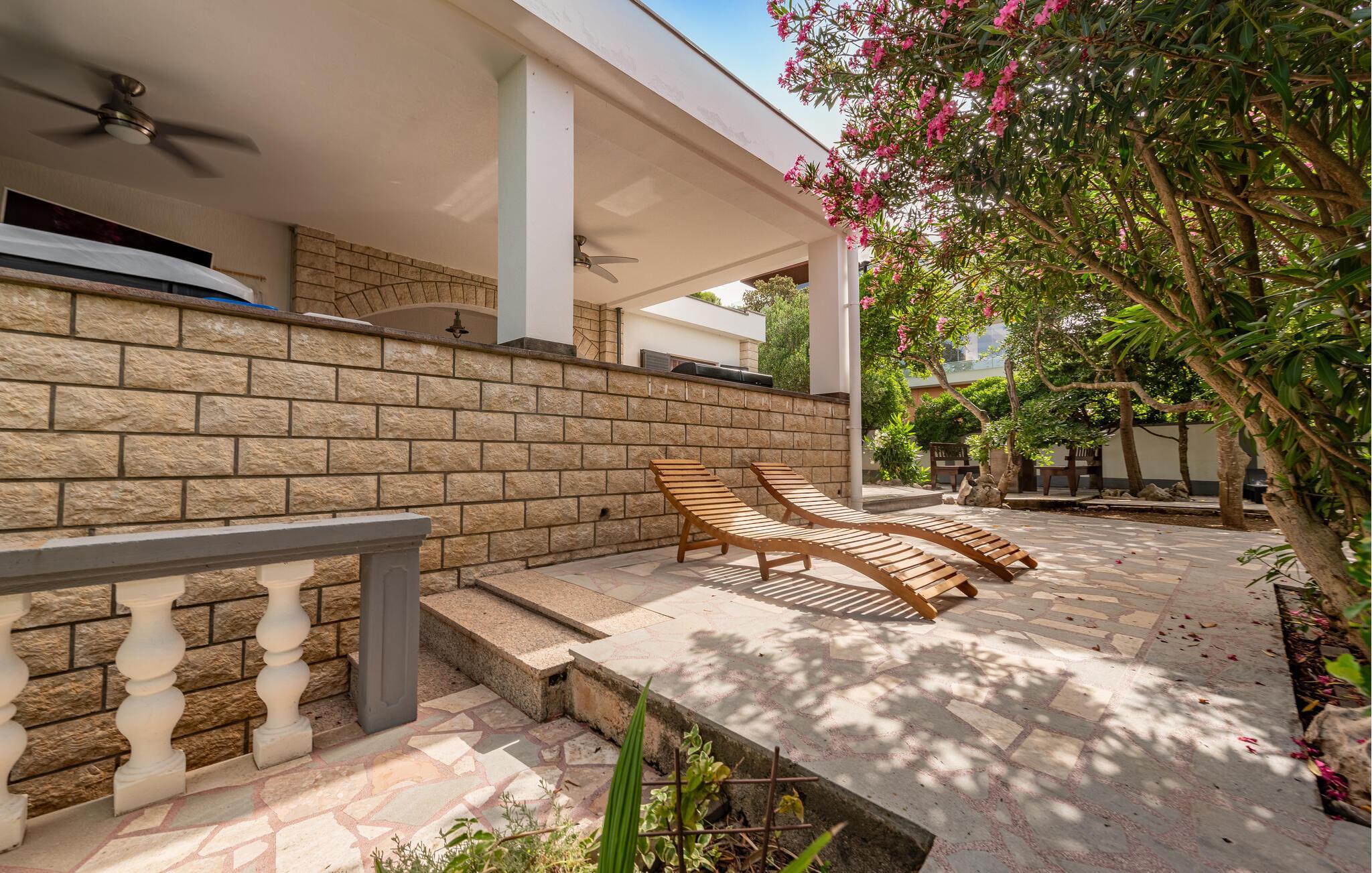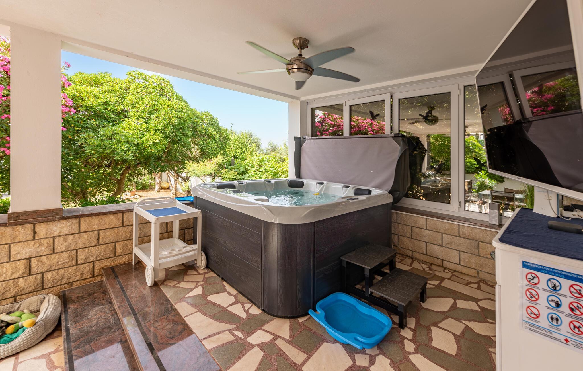 En höjdpunkt är den täckta och rymliga terrassen med bubbelpool, omgiven av solstolar som inbjuder dig att koppla av. Det finns också en stor terrass med en grill, perfekt för mysiga kvällar.