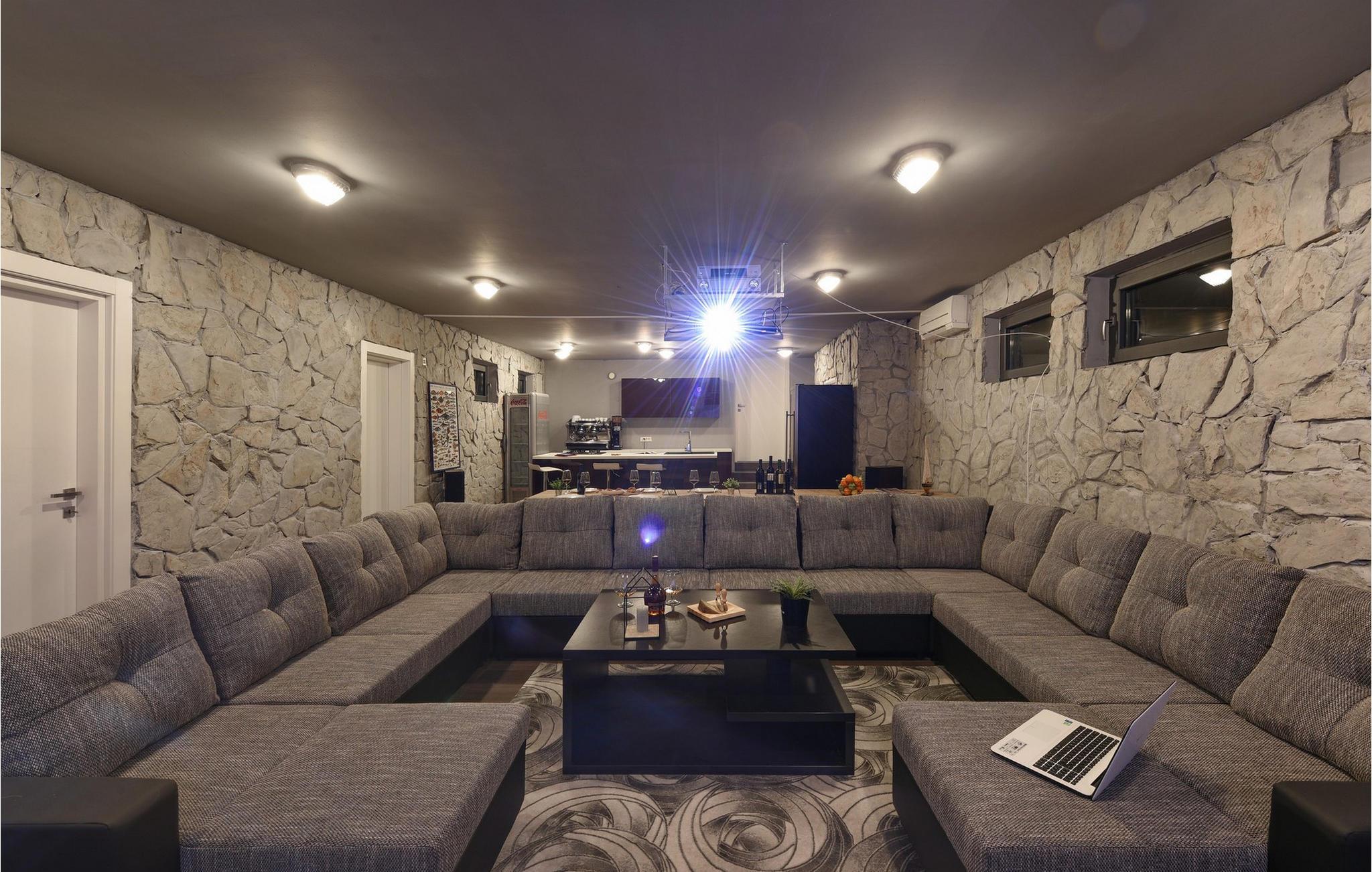 Den moderna och ljusa villan erbjuder ett perfekt utrustat kök, ett elegant vardagsrum och en bekväm matsal. Samlas här med dina nära och kära och njut av atmosfären med havsutsikt. Den mysiga tavernan med filmprojektor är särskilt charmig och perfekt för filmkvällar tillsammans på soffområdet.