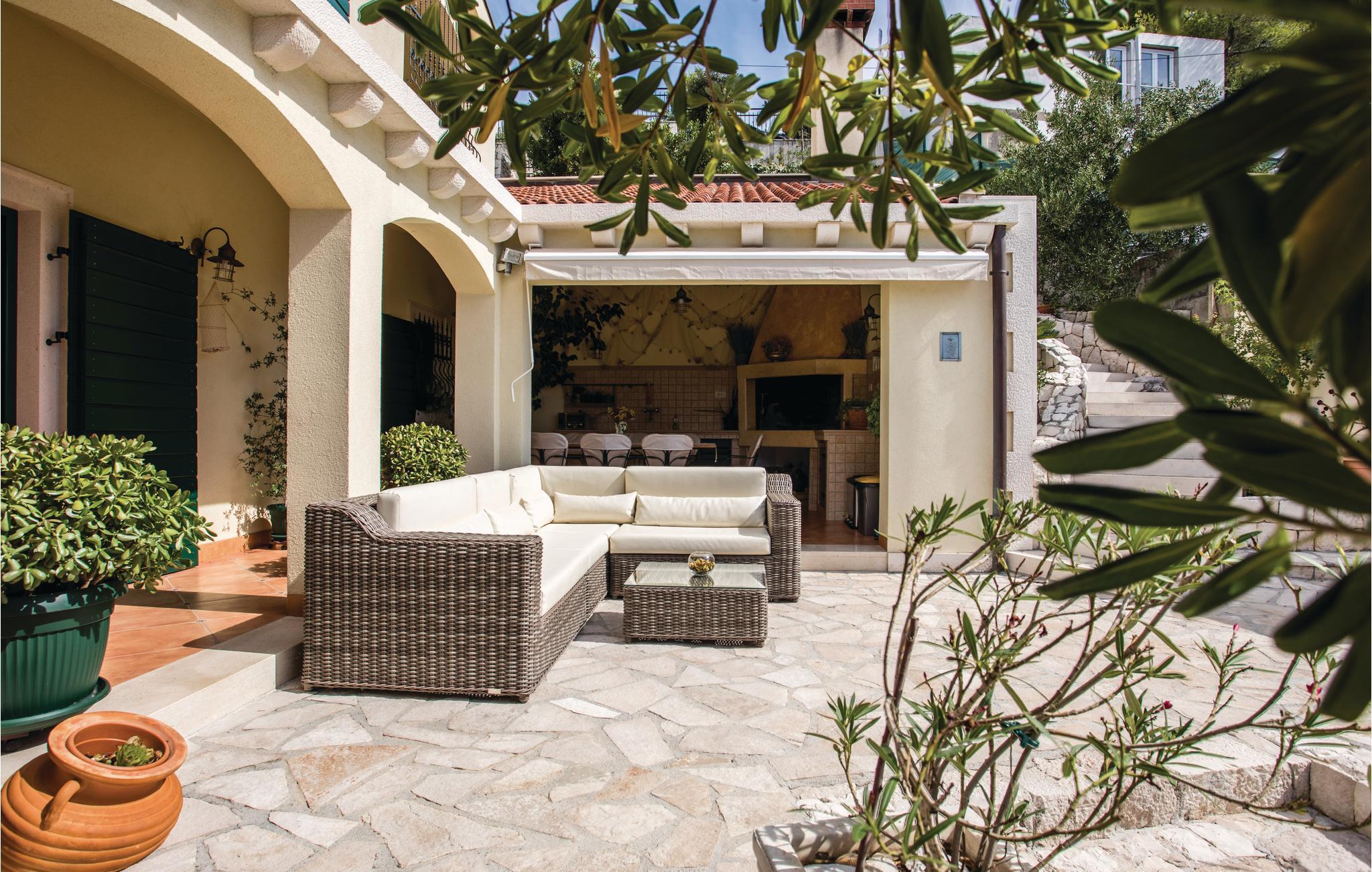 Detta lyxiga semesterhus ligger i den lilla byn Klek, precis vid havet och är en idealisk plats för en familj eller vänner som vill njuta av panoramautsikten över havet. Husets interiör är mysigt möblerad, medan den vackraste delen av huset är terrassen, där du säkert kommer att tillbringa större delen av din tid. Det består av en bottenvåning med vardagsrum, kök, matsal och badrum, medan det på första våningen finns 4 sovrum och ett badrum med bastu. Blommor och medelhavsbuskar ger huset en speciell charm. Betongstranden ligger bara ca 2 meter från huset, medan stenstranden ligger ca 100 meter bort. Gör utflykter till Dubrovnik, Korula, Mostar eller Medjugorje, som erbjuder många kulturella och historiska sevärdheter.