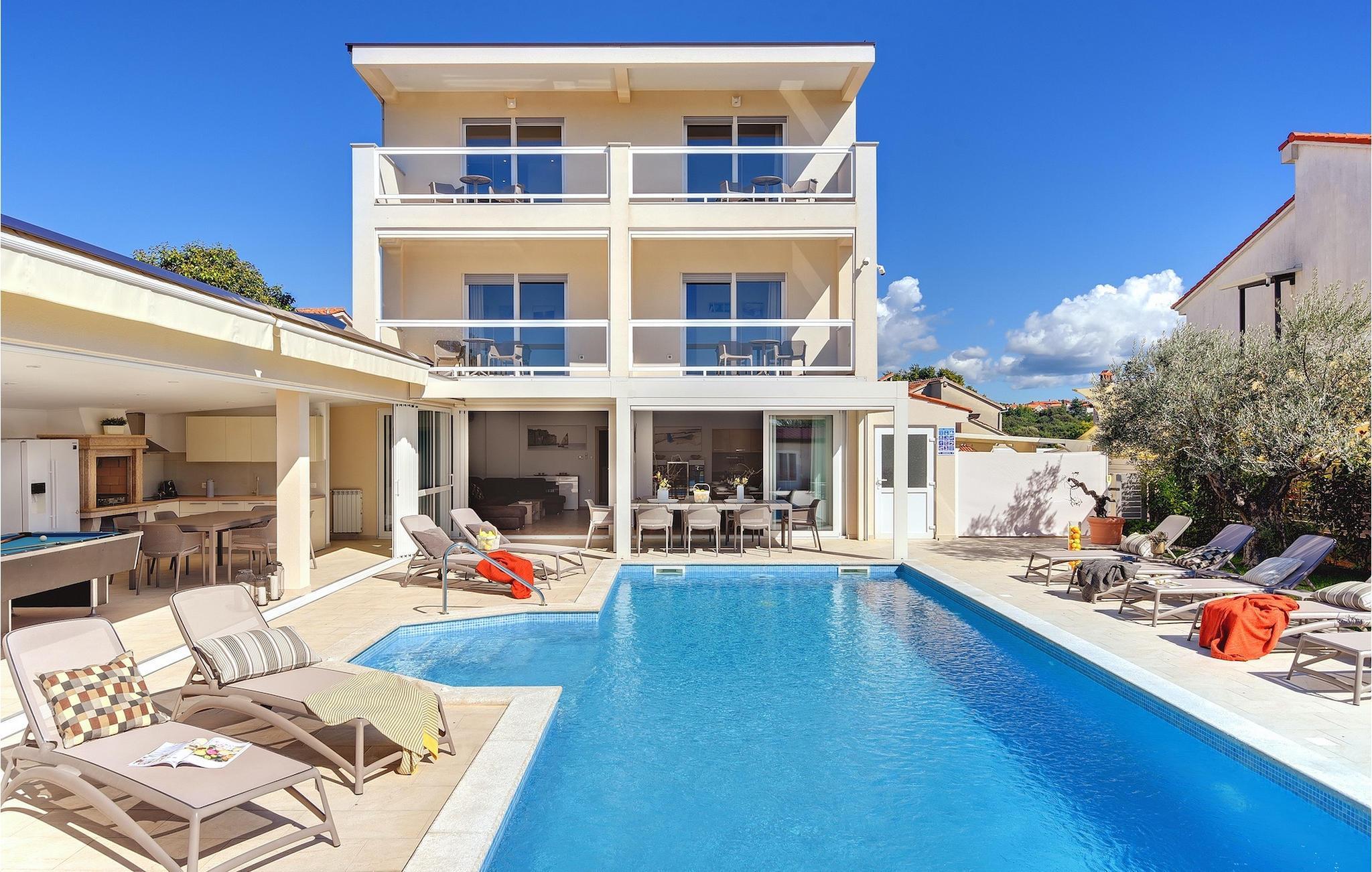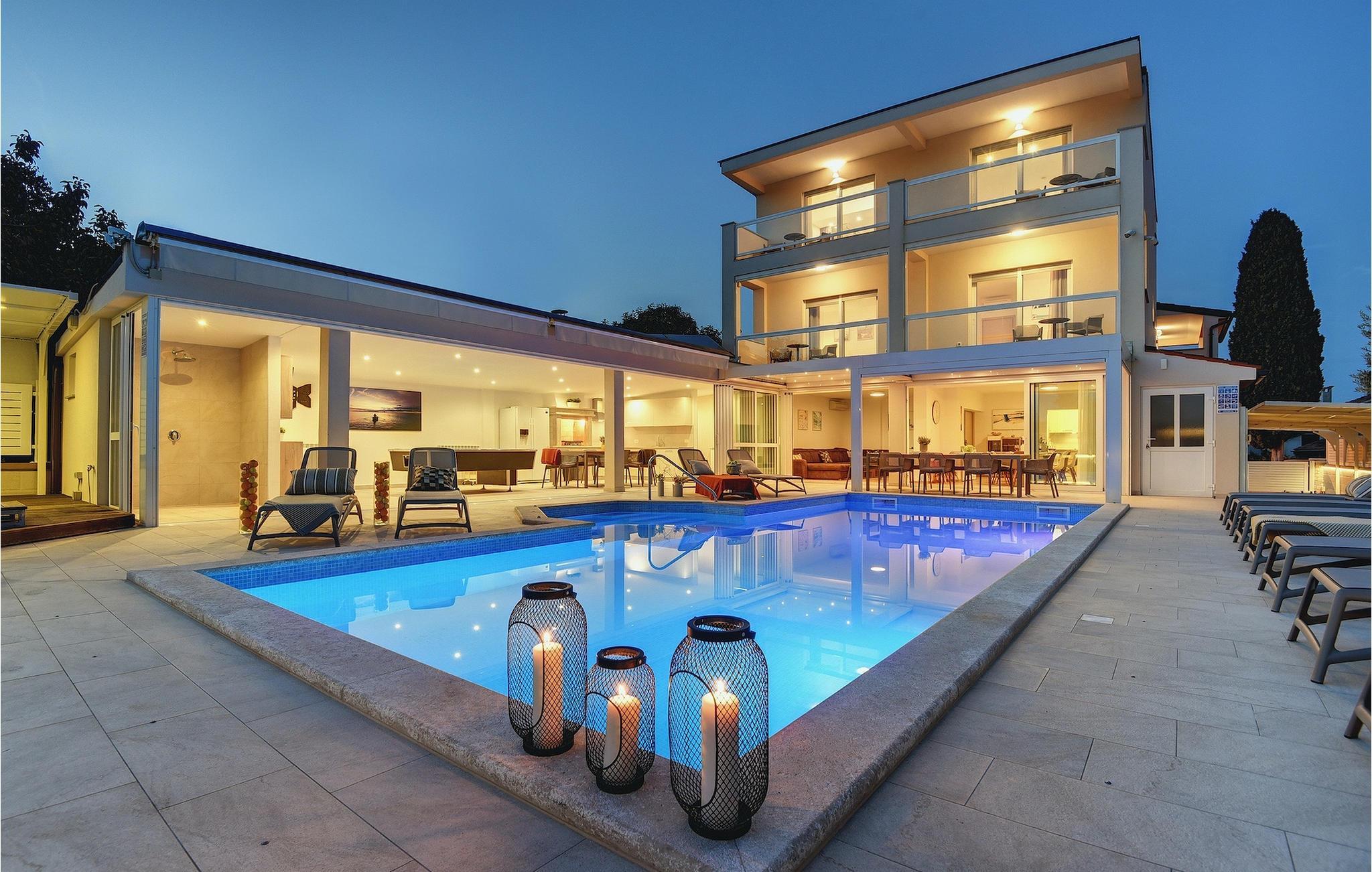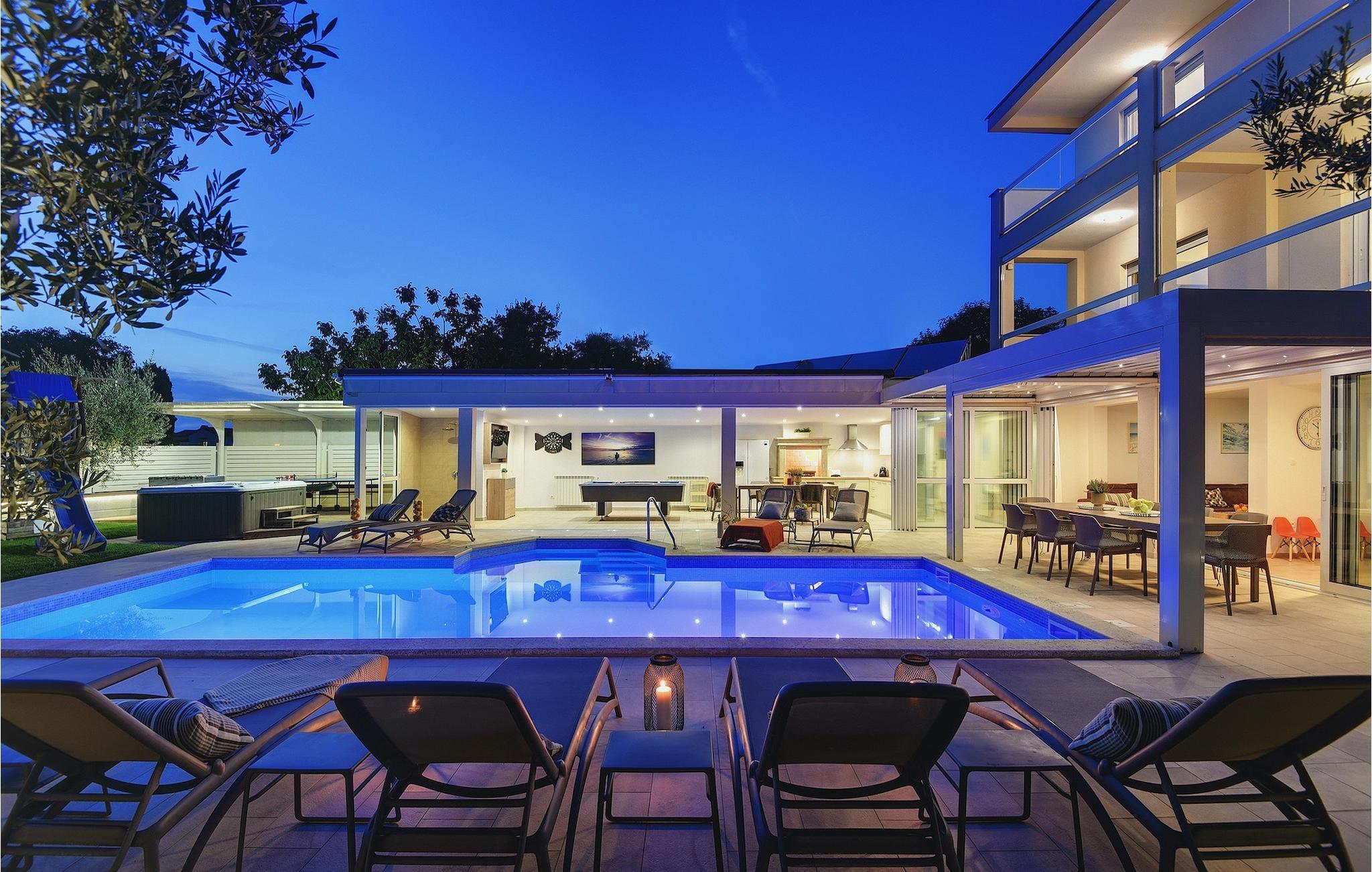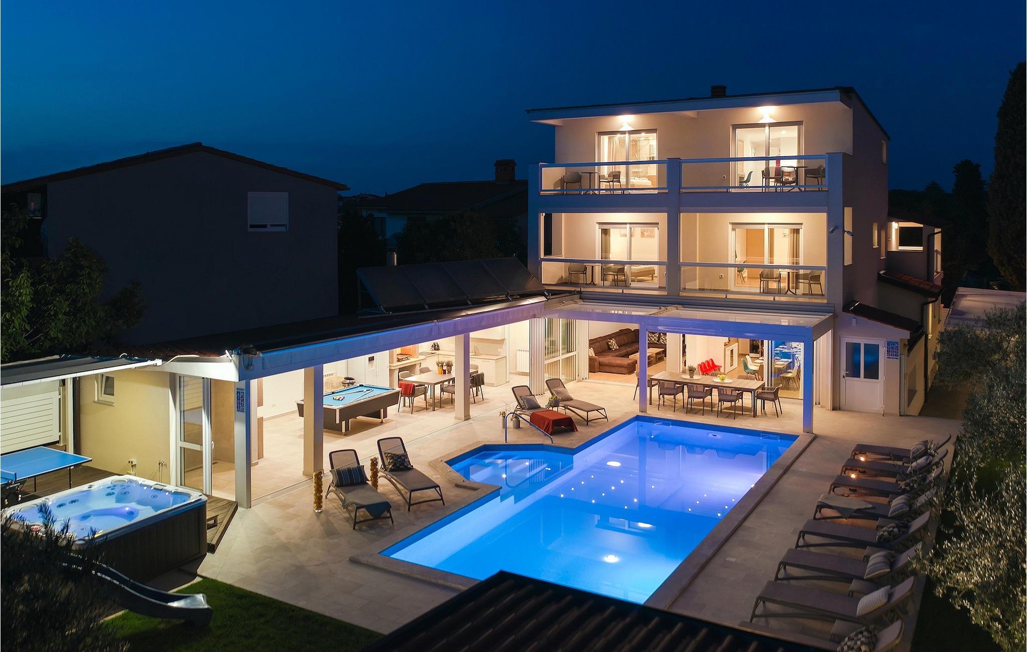 Lyxvillan Klen ligger i Pula, en stad i Istrien som främst är känd för sitt rika kulturarv. Villan har totalt 7 sovrum, alla med eget badrum, och kan rymma upp till 15 personer. Den öppna planlösningen på bottenvåningen är verkligen hisnande. Här finns ett sovrum, det stora vardagsrummet med SAT-TV och stereoanläggning, det fullt utrustade köket som erbjuder allt du kan tänkas behöva på semestern. På bottenvåningen hittar du också matplatsen och ett extra badrum. Bottenvåningen har direkt tillgång till poolen, där du kan njuta av den varma istriska solen hela dagen lång. Bredvid poolen finns sommarköket med biljardbord, bordtennis, dart och, naturligtvis, en grill. Övriga sovrum är fördelade på första och andra våningen, alla med en dubbelsäng och en privat balkong med en lounge och utsikt över omgivningen och poolen. På första våningen finns 4 stora sovrum. På andra våningen finns 2 sovrum. Ett av dem är det stora sovrummet med en dubbelsäng och en bäddsoffa. Här kommer du att kunna njuta av den fantastiska utsikten över havet. Alla sovrum är luftkonditionerade och har SAT-TV. En speciell egenskap hos Villa Klen är att den har en laddningsstation för elfordon.