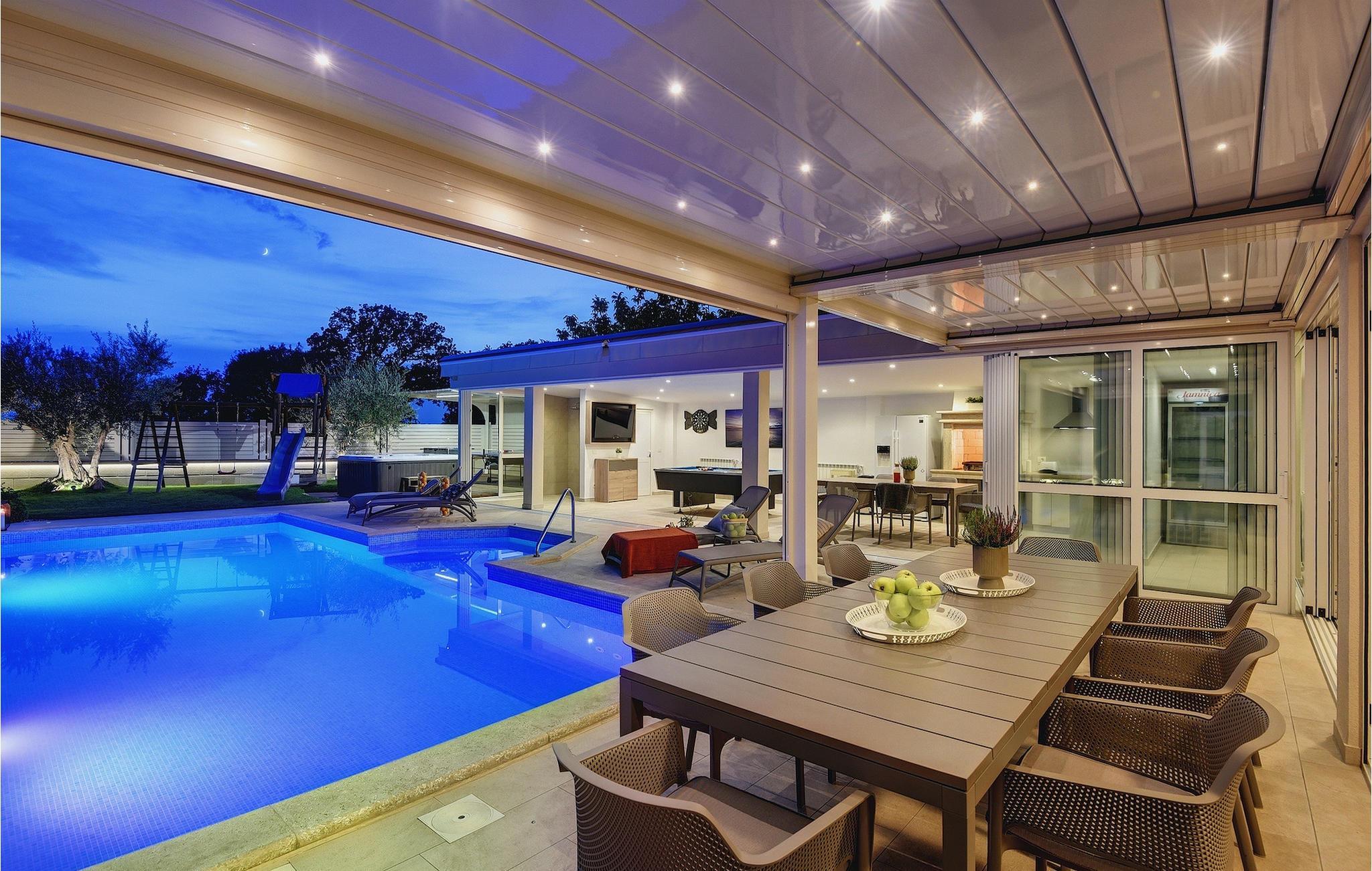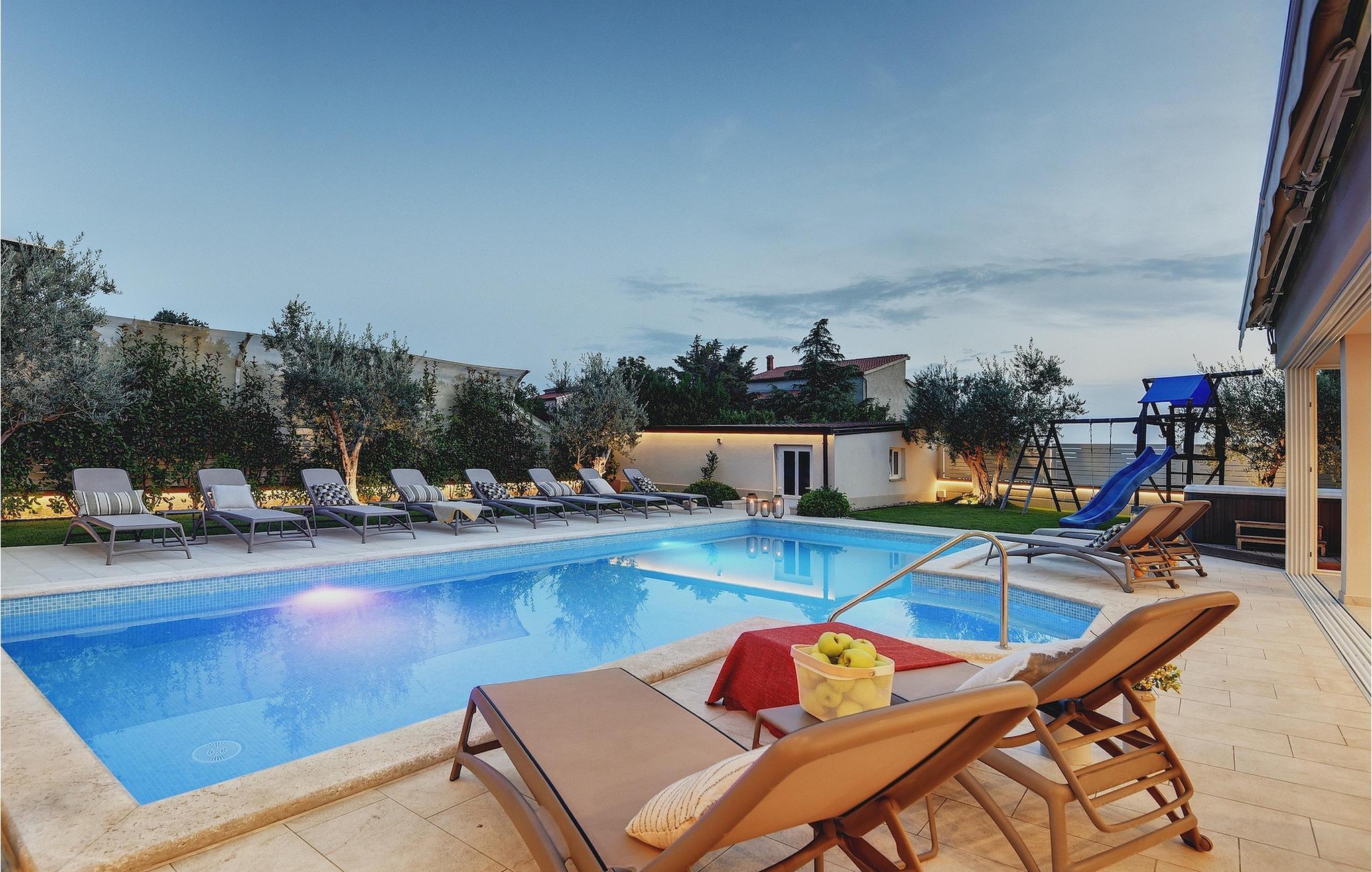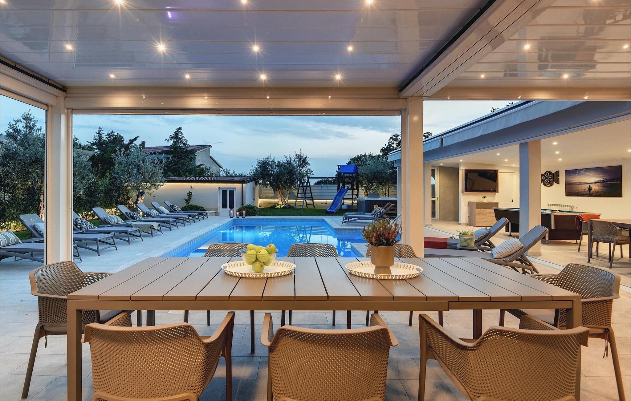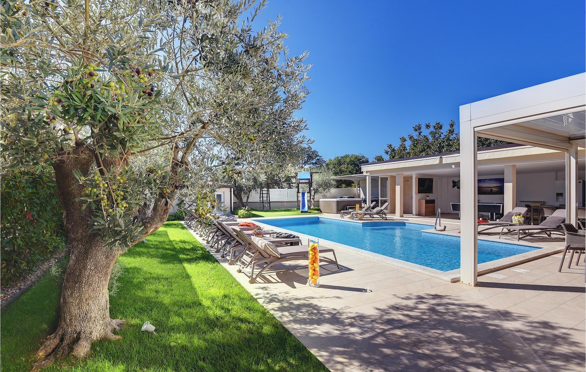 Lyxvillan Klen ligger i Pula, en stad i Istrien som främst är känd för sitt rika kulturarv. Villan har totalt 7 sovrum, alla med eget badrum, och kan rymma upp till 15 personer. Den öppna planlösningen på bottenvåningen är verkligen hisnande. Här finns ett sovrum, det stora vardagsrummet med SAT-TV och stereoanläggning, det fullt utrustade köket som erbjuder allt du kan tänkas behöva på semestern. På bottenvåningen hittar du också matplatsen och ett extra badrum. Bottenvåningen har direkt tillgång till poolen, där du kan njuta av den varma istriska solen hela dagen lång. Bredvid poolen finns sommarköket med biljardbord, bordtennis, dart och, naturligtvis, en grill. Övriga sovrum är fördelade på första och andra våningen, alla med en dubbelsäng och en privat balkong med en lounge och utsikt över omgivningen och poolen. På första våningen finns 4 stora sovrum. På andra våningen finns 2 sovrum. Ett av dem är det stora sovrummet med en dubbelsäng och en bäddsoffa. Här kommer du att kunna njuta av den fantastiska utsikten över havet. Alla sovrum är luftkonditionerade och har SAT-TV. En speciell egenskap hos Villa Klen är att den har en laddningsstation för elfordon.