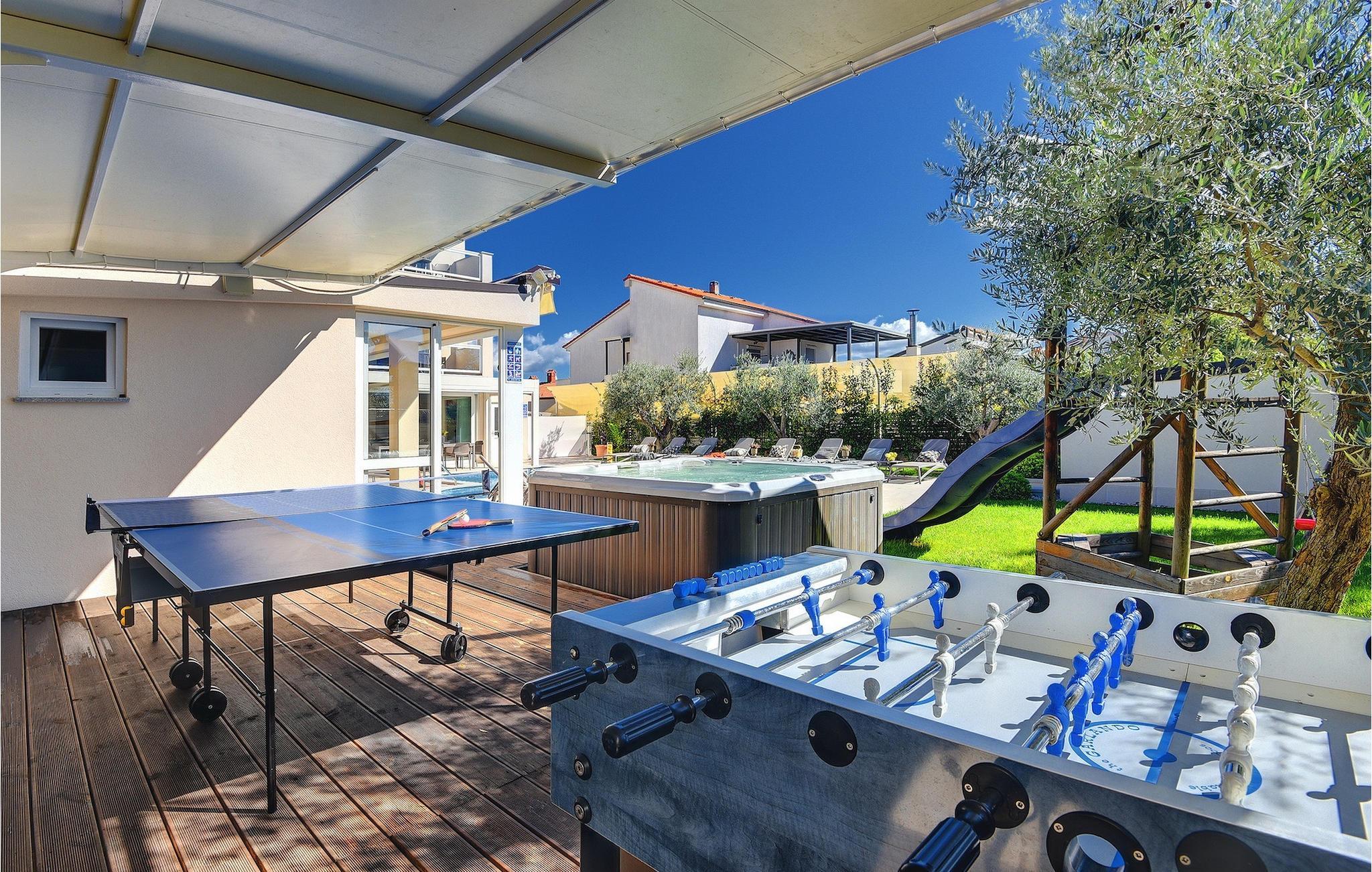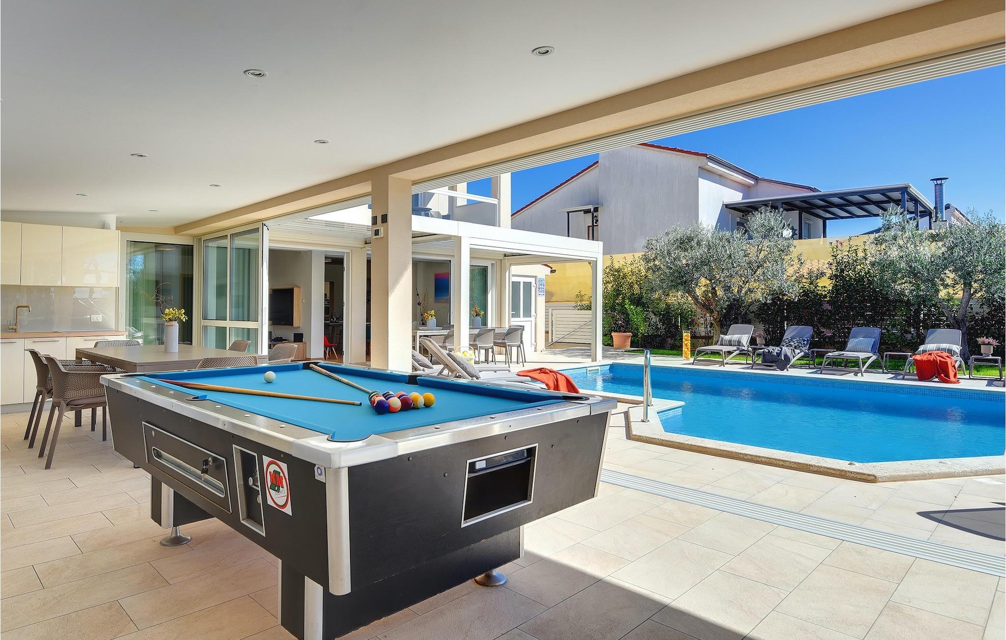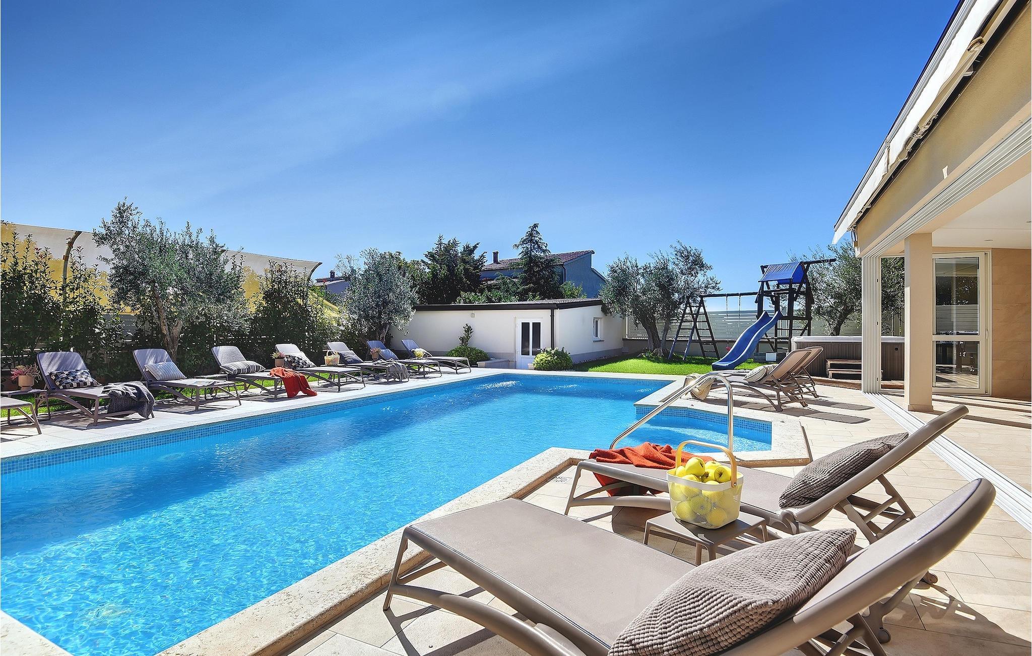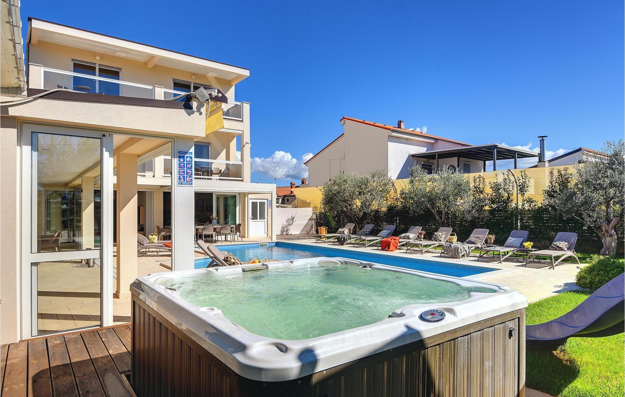 Lyxvillan Klen ligger i Pula, en stad i Istrien som främst är känd för sitt rika kulturarv. Villan har totalt 7 sovrum, alla med eget badrum, och kan rymma upp till 15 personer. Den öppna planlösningen på bottenvåningen är verkligen hisnande. Här finns ett sovrum, det stora vardagsrummet med SAT-TV och stereoanläggning, det fullt utrustade köket som erbjuder allt du kan tänkas behöva på semestern. På bottenvåningen hittar du också matplatsen och ett extra badrum. Bottenvåningen har direkt tillgång till poolen, där du kan njuta av den varma istriska solen hela dagen lång. Bredvid poolen finns sommarköket med biljardbord, bordtennis, dart och, naturligtvis, en grill. Övriga sovrum är fördelade på första och andra våningen, alla med en dubbelsäng och en privat balkong med en lounge och utsikt över omgivningen och poolen. På första våningen finns 4 stora sovrum. På andra våningen finns 2 sovrum. Ett av dem är det stora sovrummet med en dubbelsäng och en bäddsoffa. Här kommer du att kunna njuta av den fantastiska utsikten över havet. Alla sovrum är luftkonditionerade och har SAT-TV. En speciell egenskap hos Villa Klen är att den har en laddningsstation för elfordon.