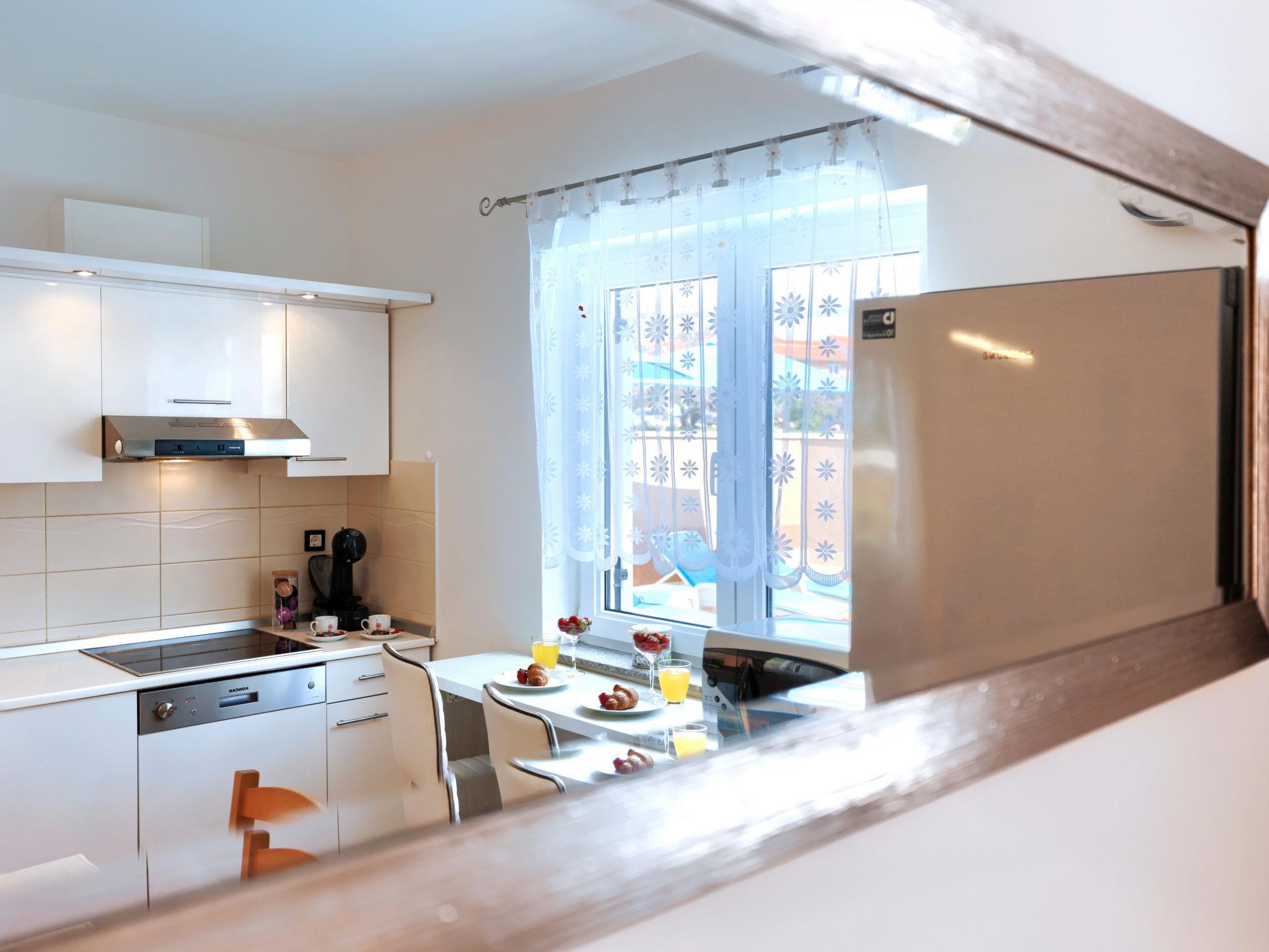 4-room house 145 m2 on 2 levels. Beautiful furnishings: living/dining room with satellite TV (flat screen), air conditioning. Exit to the terrace. Open kitchen (oven, dishwasher, 4 ceramic glass hob hotplates, kettle, microwave, freezer, electric coffee machine). Sep. WC. Upper floor: entrance hall with air conditioning. 1 room with 1 french bed (160 cm, length 200 cm). 1 room with 2 beds (90 cm, length 200 cm). 1 room with 1 french bed (180 cm, length 200 cm), shower/WC. Exit to the terrace. Bath/bidet/WC. No heating option. Terrace 10 m2, roofed, terrace 20 m2 partly roofed. Terrace furniture, deck chairs. View of the garden. Facilities: safe, children's high chair, hair dryer. Internet (WiFi, free). Maximum 1 pet/ dog allowed.