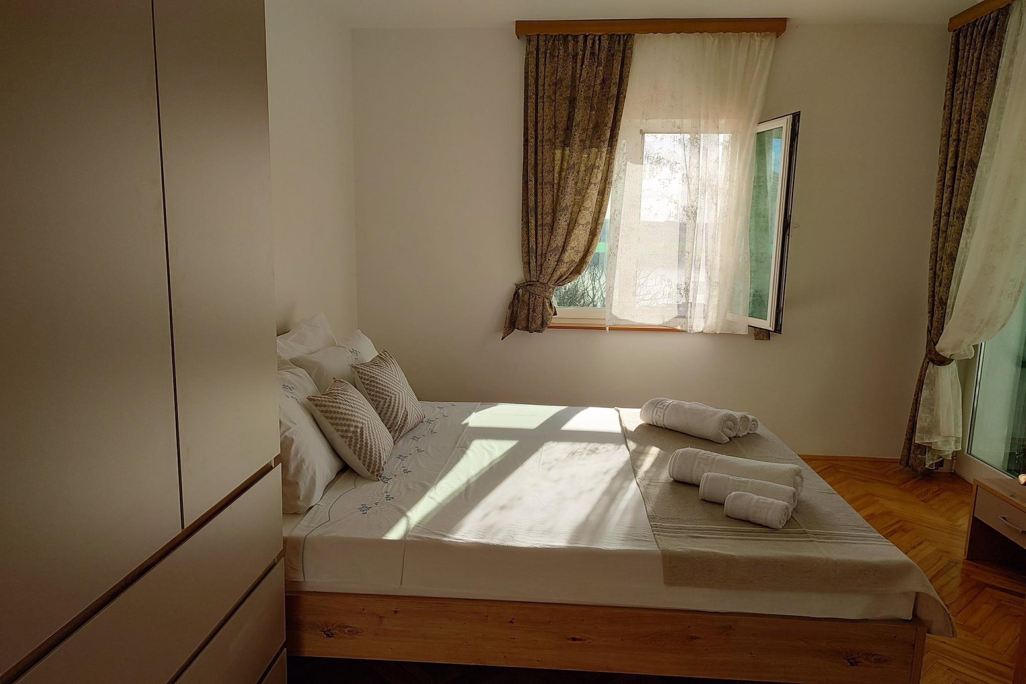 Denna rymliga semesterbostad på 87 m² ligger vid vattnet i Ražanac och har tre bekväma sovrum med plats för upp till sju gäster, vilket gör den till ett idealiskt val för familjer eller små grupper. Beläget i ett lugnt, familjevänligt område, erbjuder den en balkong med fridfull utsikt, en privat trädgård med utemöbler och grillmöjligheter. Lägenheten har luftkonditionering, satellit-TV, Wi-Fi och en tvättmaskin för att garantera en avkopplande och välutrustad vistelse. Fastigheten har ett utmärkt läge bara några steg från stadens centrum och bara 270 meter från både sandiga och steniga delar av stranden Rtina – perfekt för solbad eller ett uppfriskande dopp. En stormarknad ligger bekvämt 280 meter bort, medan lokala restauranger kan avnjutas på restaurang Taraca Grill, bara en kort 450 meters promenad bort. Gästerna kan enkelt utforska närliggande naturattraktioner som Paklenica nationalpark, bara 35 km bort. Zadars flygplats ligger bara 38 km från fastigheten, vilket gör reseförbindelserna smidiga. Det separata gaseldade köket är välutrustat med kylskåp, mikrovågsugn, ugn, frys, kaffebryggare, brödrost och vattenkokare, samt alla nödvändiga köksredskap och bestick. Ytterligare bekvämligheter inkluderar strykjärn, hårtork och utomhusparkering på området. Denna lägenhet kombinerar generöst inomhusutrymme med kustnära charm och erbjuder allt som behövs för en bekväm semester med självhushåll vid havet.
