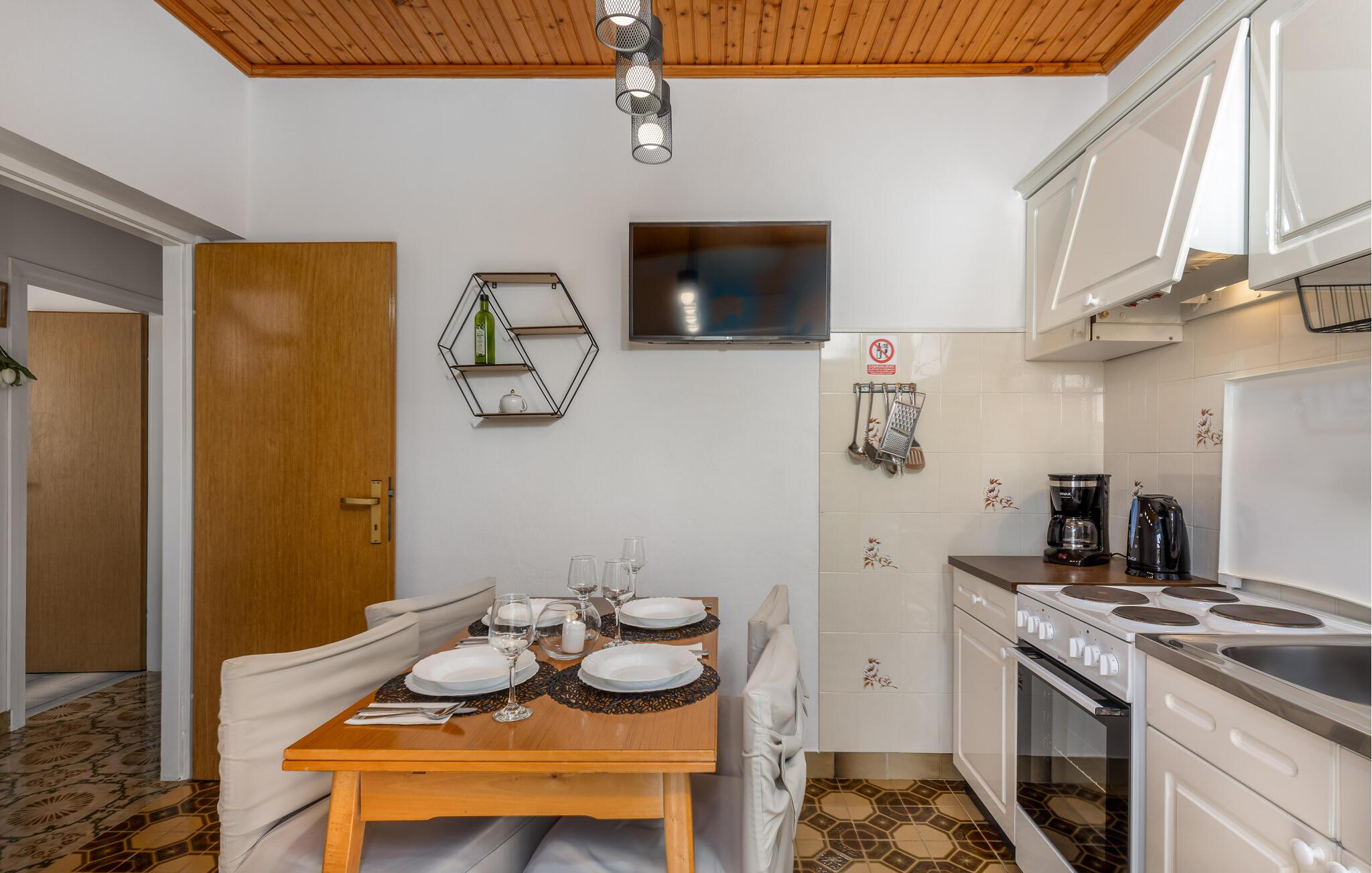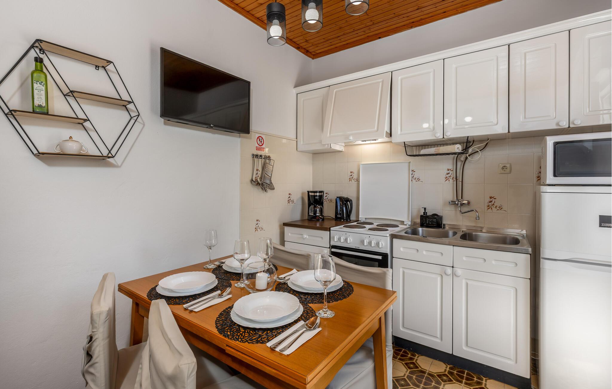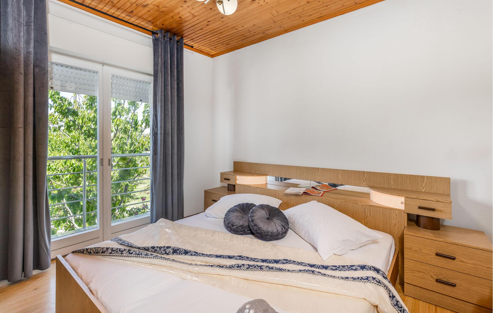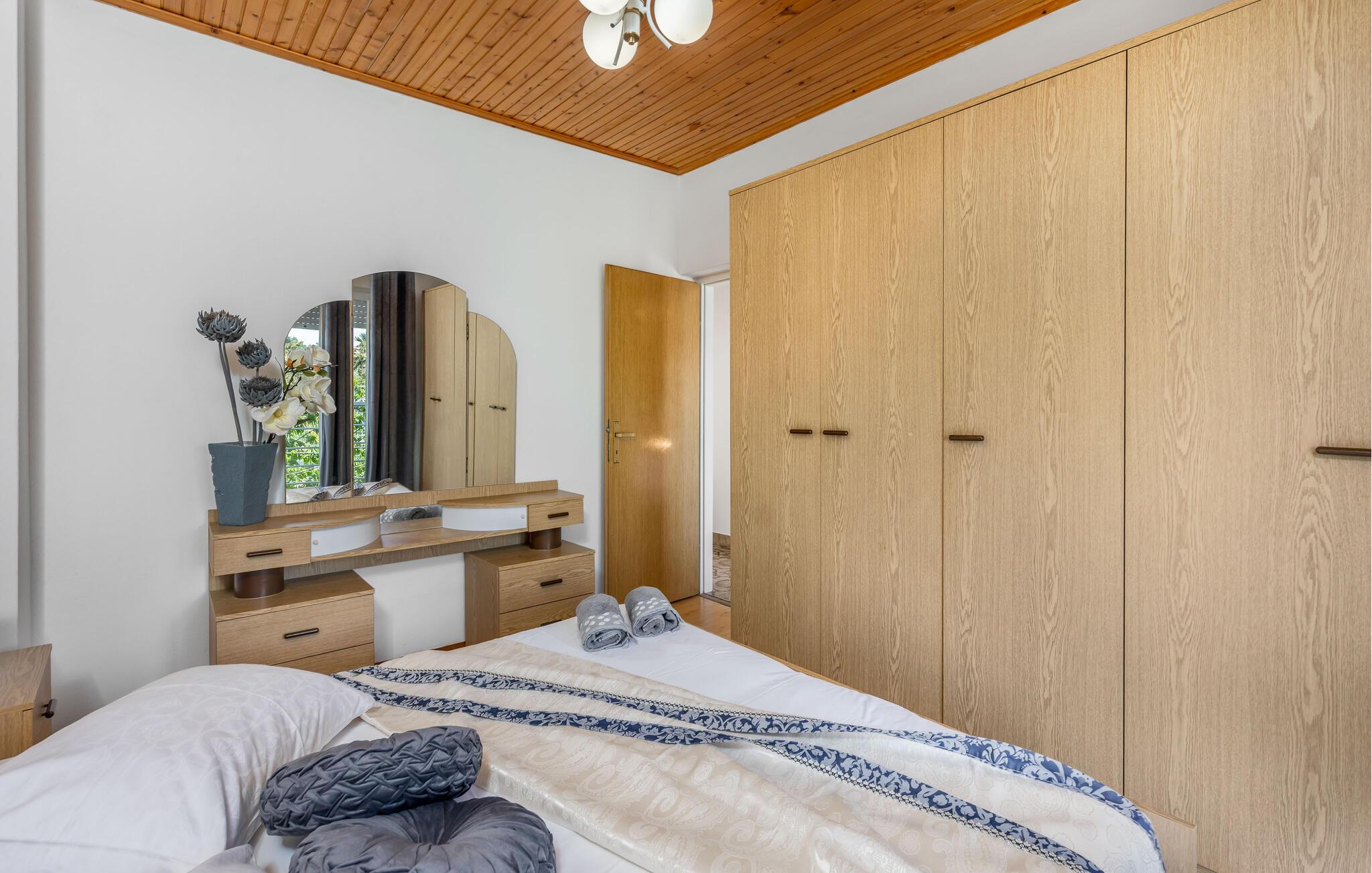 Denna semesterlägenhet ligger bredvid huvudbyggnaden i ett mindre hus, ovanför garaget. Långt bort från stadens buller och trängsel hittar du här den nödvändiga lugnet och avkopplingen. Du kommer förmodligen att tillbringa det mesta av din tid på den öppna terrassen med grillmöjligheter. Ön Rab är rik på sand-, sten- och klippstränder med många nöjes- och sportmöjligheter. Cykelvägar genom naturreservaten och längs strandpromenaden vid havet och klostret och kyrkan St Eufemia till staden Rab kommer att glädja dig.