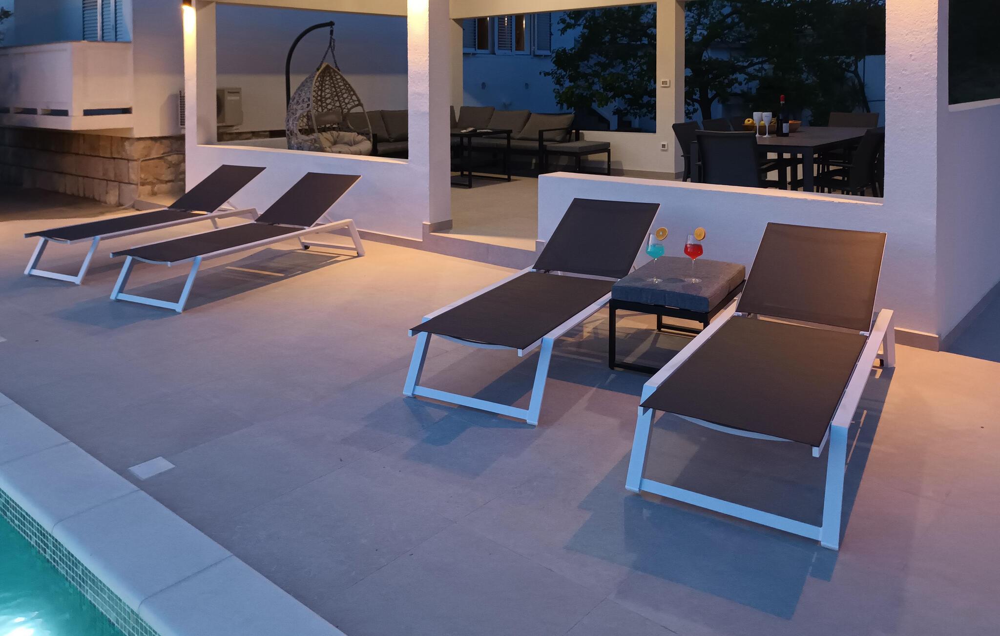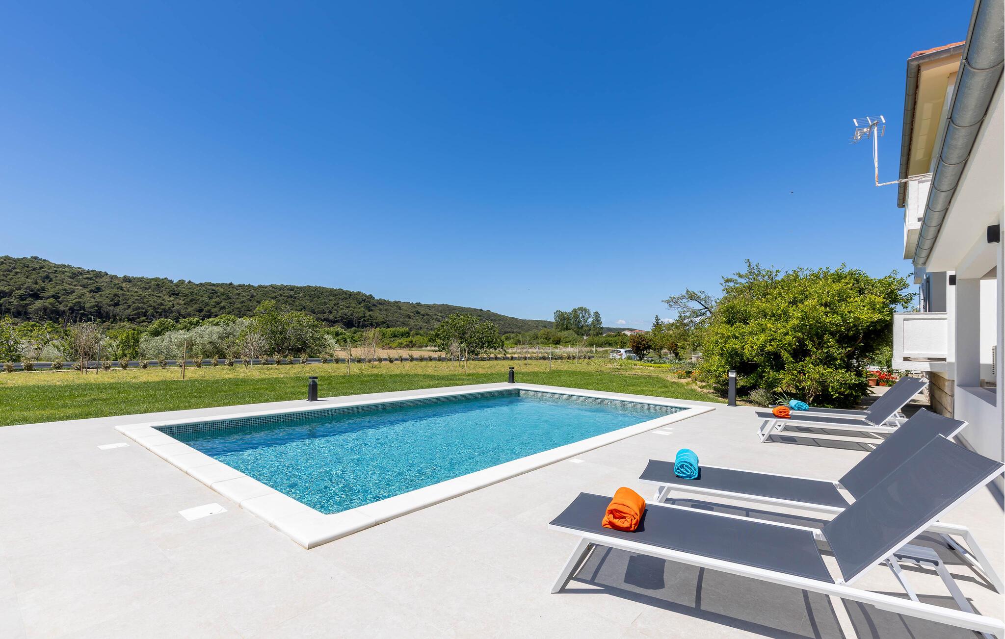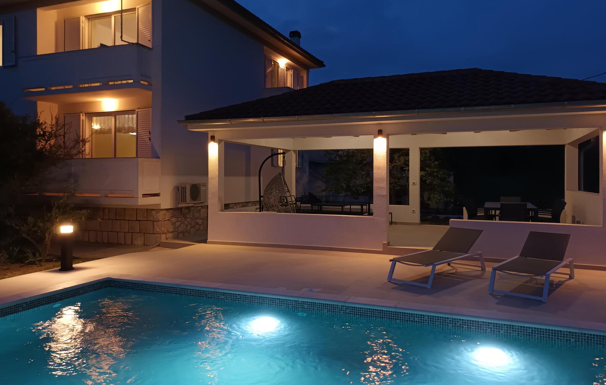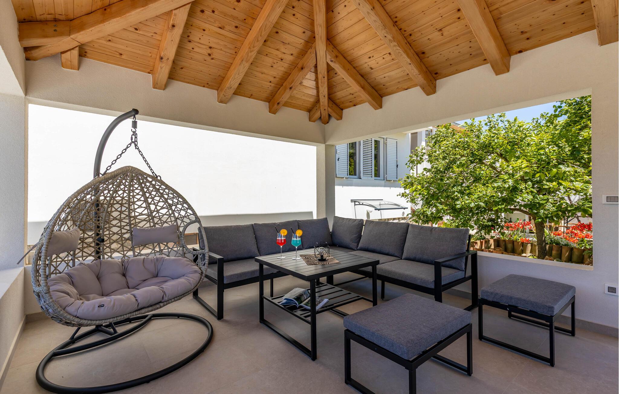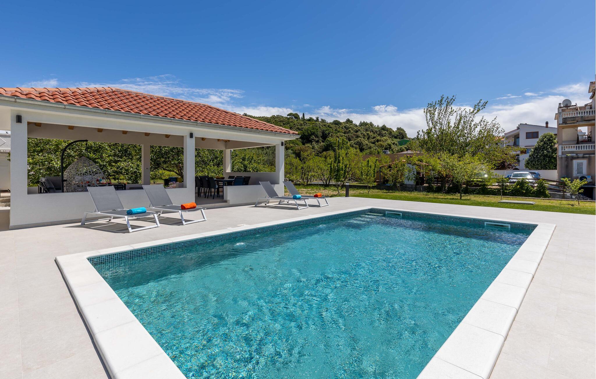 Denna semesterlägenhet ligger bredvid huvudbyggnaden i ett mindre hus, ovanför garaget. Långt bort från stadens buller och trängsel hittar du här den nödvändiga lugnet och avkopplingen. Du kommer förmodligen att tillbringa det mesta av din tid på den öppna terrassen med grillmöjligheter. Ön Rab är rik på sand-, sten- och klippstränder med många nöjes- och sportmöjligheter. Cykelvägar genom naturreservaten och längs strandpromenaden vid havet och klostret och kyrkan St Eufemia till staden Rab kommer att glädja dig.