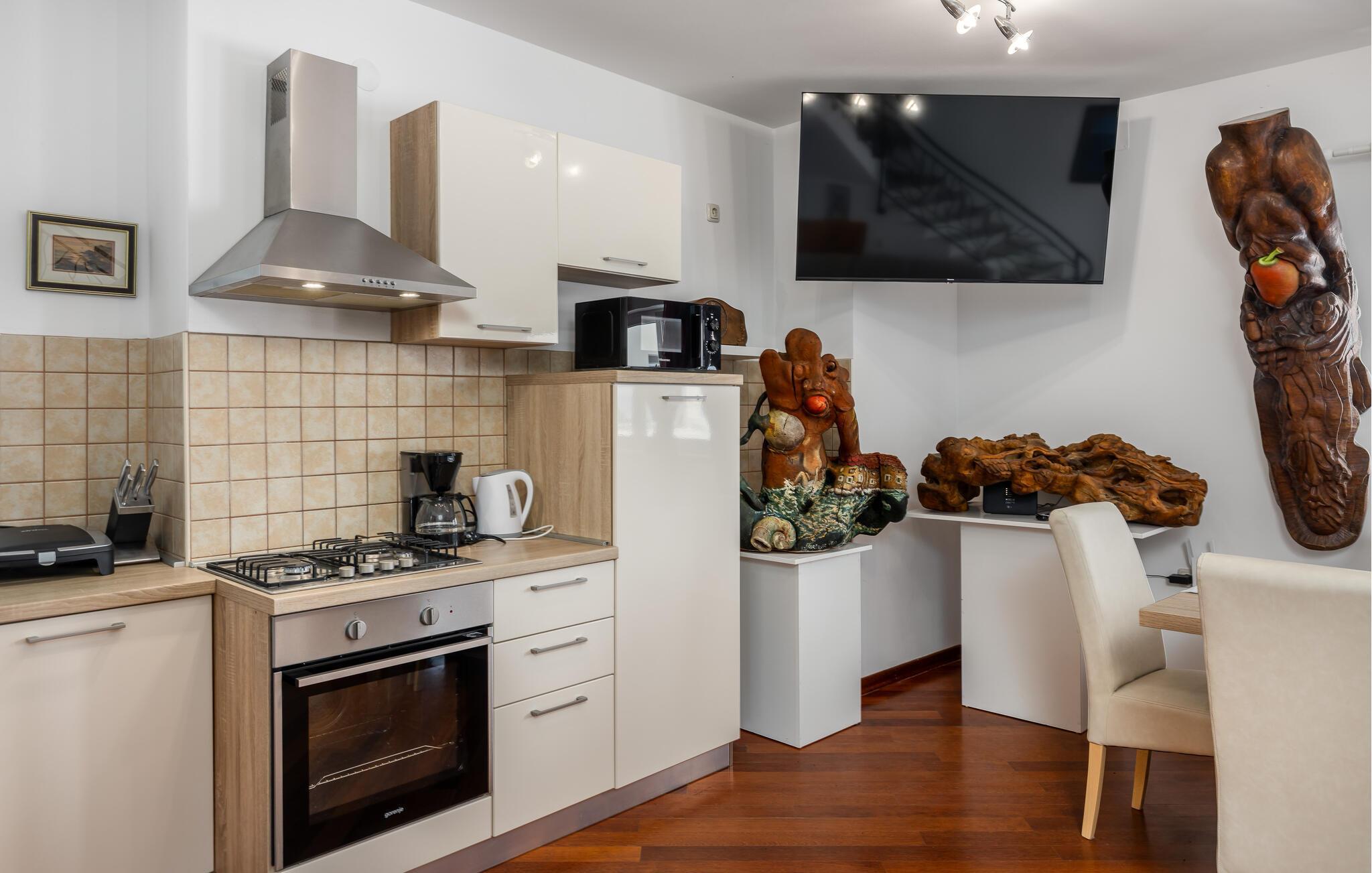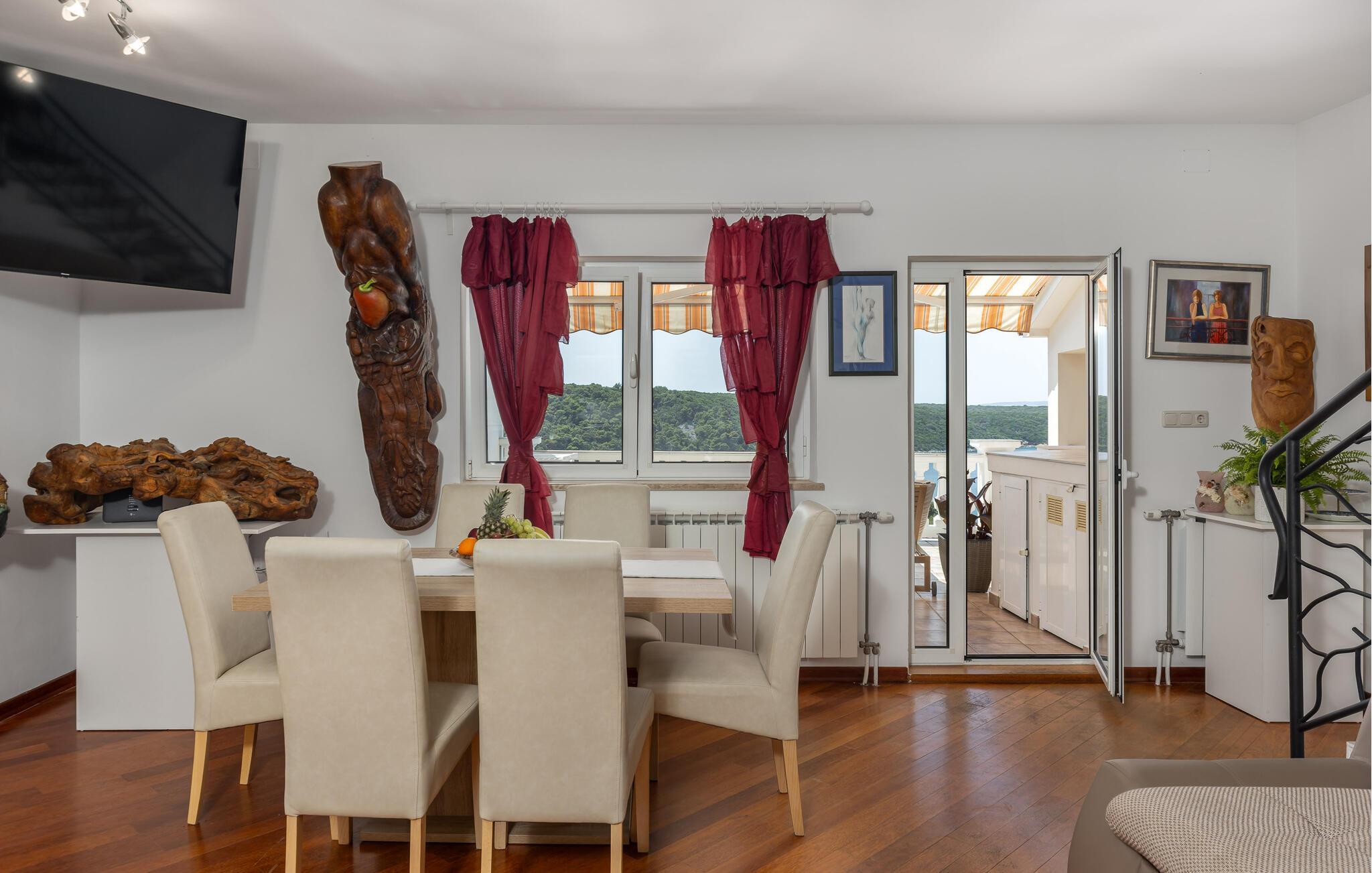 I denna vackra semesterlägenhet på ön Rab kombineras modernitet och komfort för att skapa en elegant helhet. Ljusa, rymliga rum, varmt trä och konstnärliga detaljer skapar en harmonisk atmosfär där du kan ladda batterierna. Gör det bekvämt för dig i soffan med en god bok, gå på filmkväll eller laga dina favoriträtter i det moderna köket.