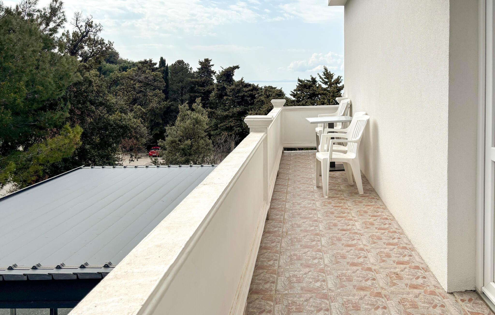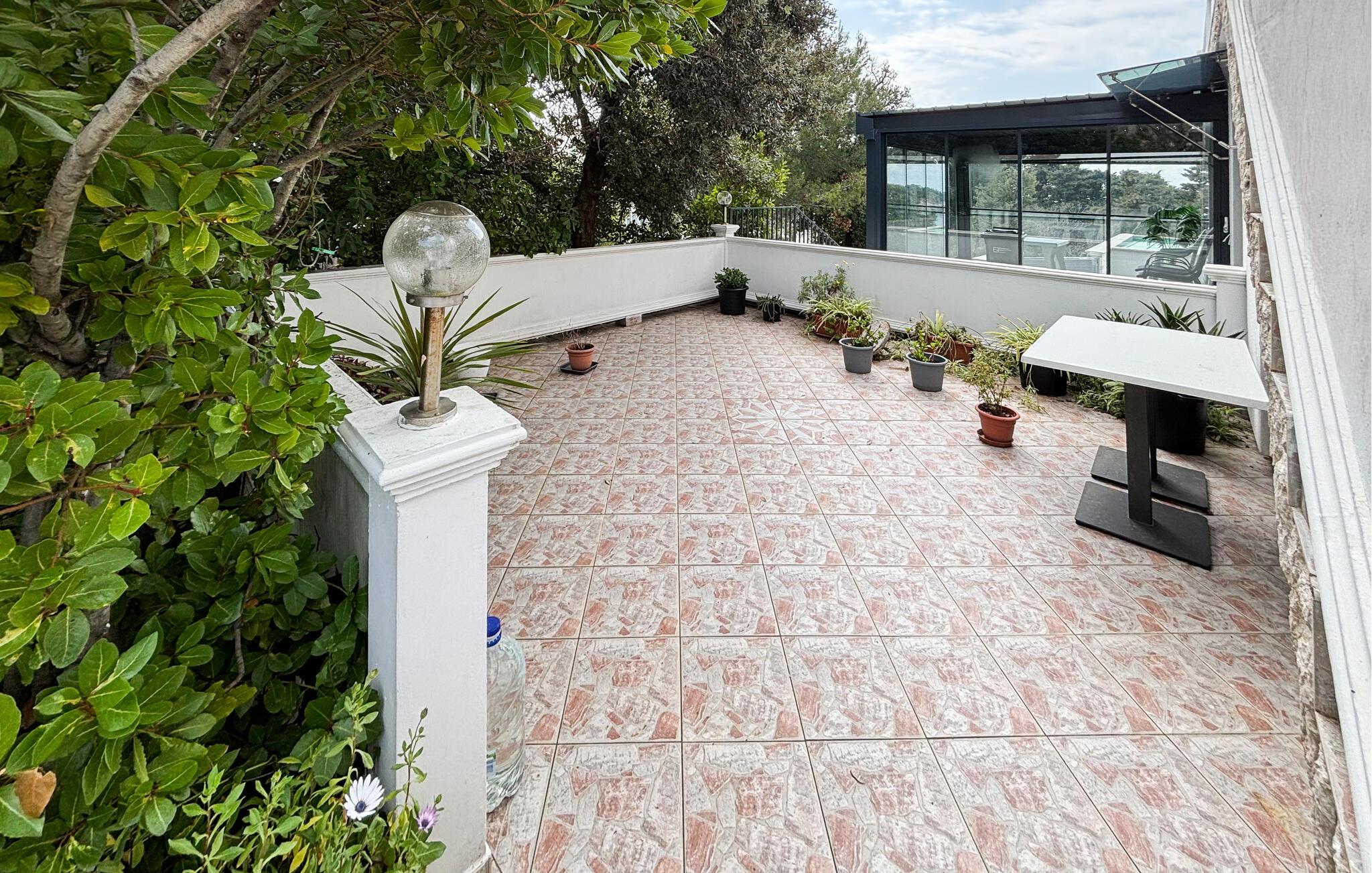 Kliv ut på den rymliga terrassen med sina karakteristiska plattor. Från toppen kan du njuta av en vidsträckt utsikt över havet och de omgivande pinje- och olivträden. Dra nytta av husets lugna läge för avkopplande timmar i den friska luften och avrunda dagen i medelhavsomgivningar.