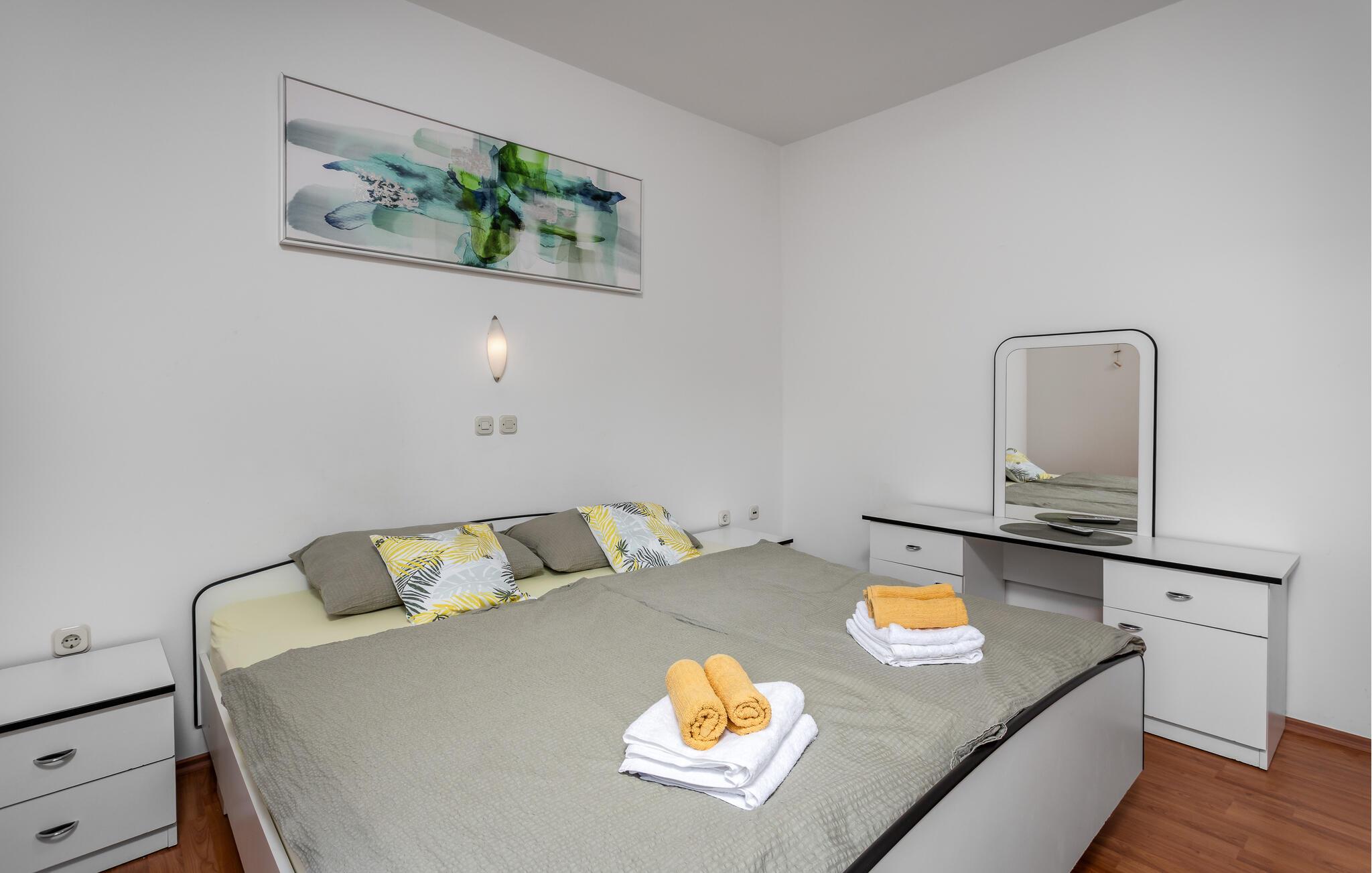Denna välskötta semesterlägenhet inbjuder dig att njuta av en avkopplande semester på Adriatiska kusten precis vid stranden. Förbered dina måltider i det öppna köket och njut av dem vid det eleganta matbordet. Låt den friska havsbrisen flöda genom rummen och planera dina äventyr över ett glas vin.