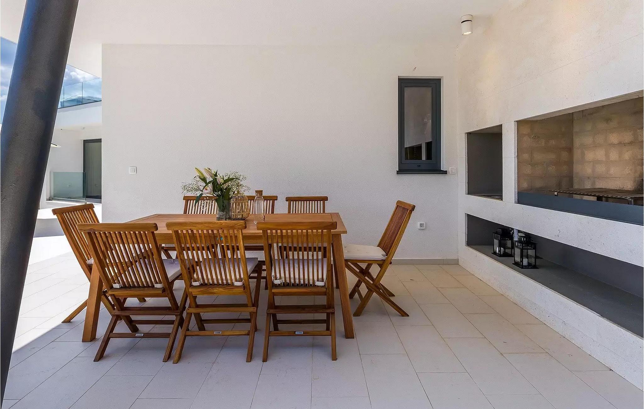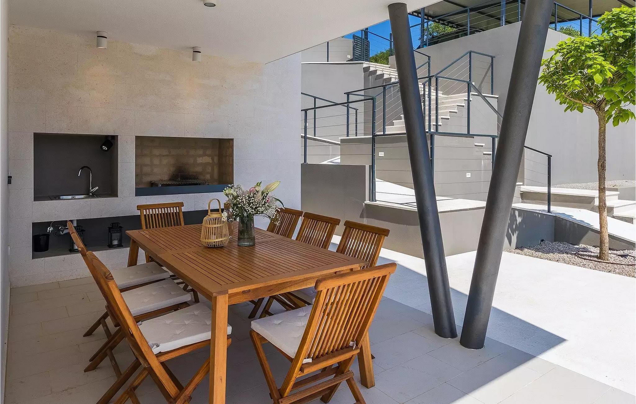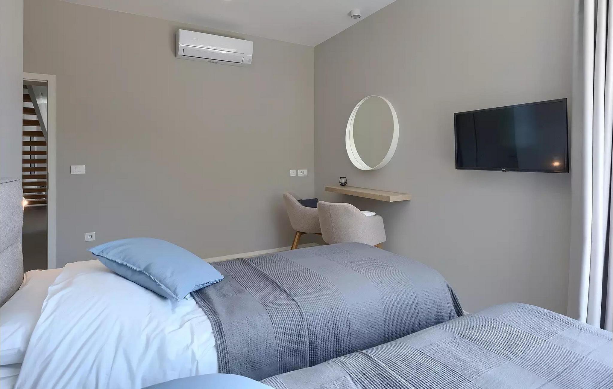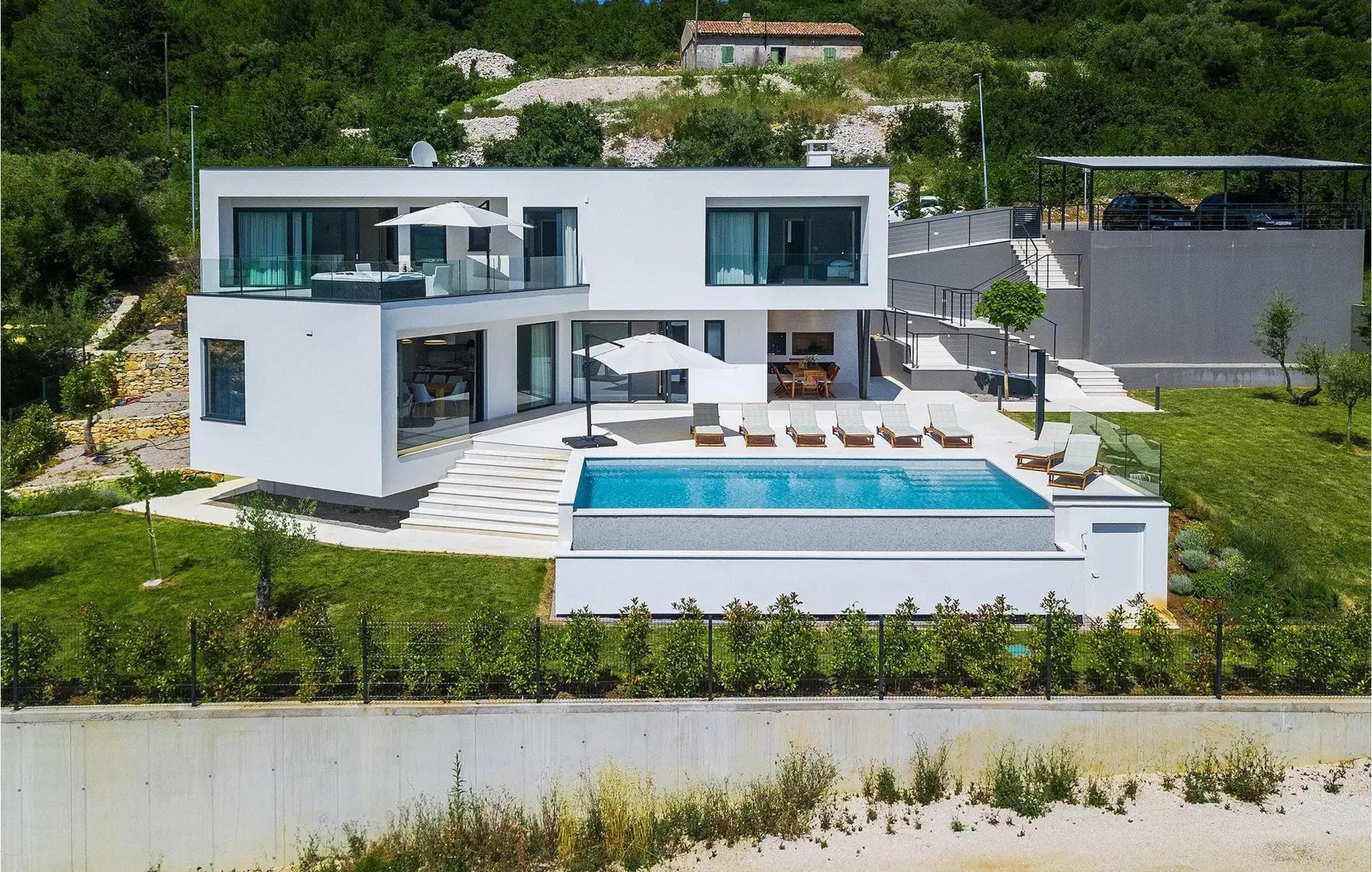 Denna moderna villa är uppdelad i tre rymliga våningar. I villans källare hittar du ett gym med träningsutrustning som du kan använda om du är ett fan av aktiviteter och fitness. Bredvid fitnessrummet finns ett massagebord för dem som gillar wellness och avkoppling. Villans bottenvåning är rymlig med glasväggar som erbjuder en fantastisk panoramautsikt över havet och det omgivande området. Här finns ett utrustat kök med matplats, vardagsrum med direkt tillgång till terrassen med pool, gästtoalett, fullt utrustad tvättstuga och ett dubbelrum med två enkelsängar, TV och luftkonditionering och eget badrum. På första våningen finns tre dubbelrum med dubbelsängar, TV och luftkonditionering och eget badrum. Rummen har en terrass med utsikt över staden, havet och öarna där du kan njuta av ditt morgonkaffe.