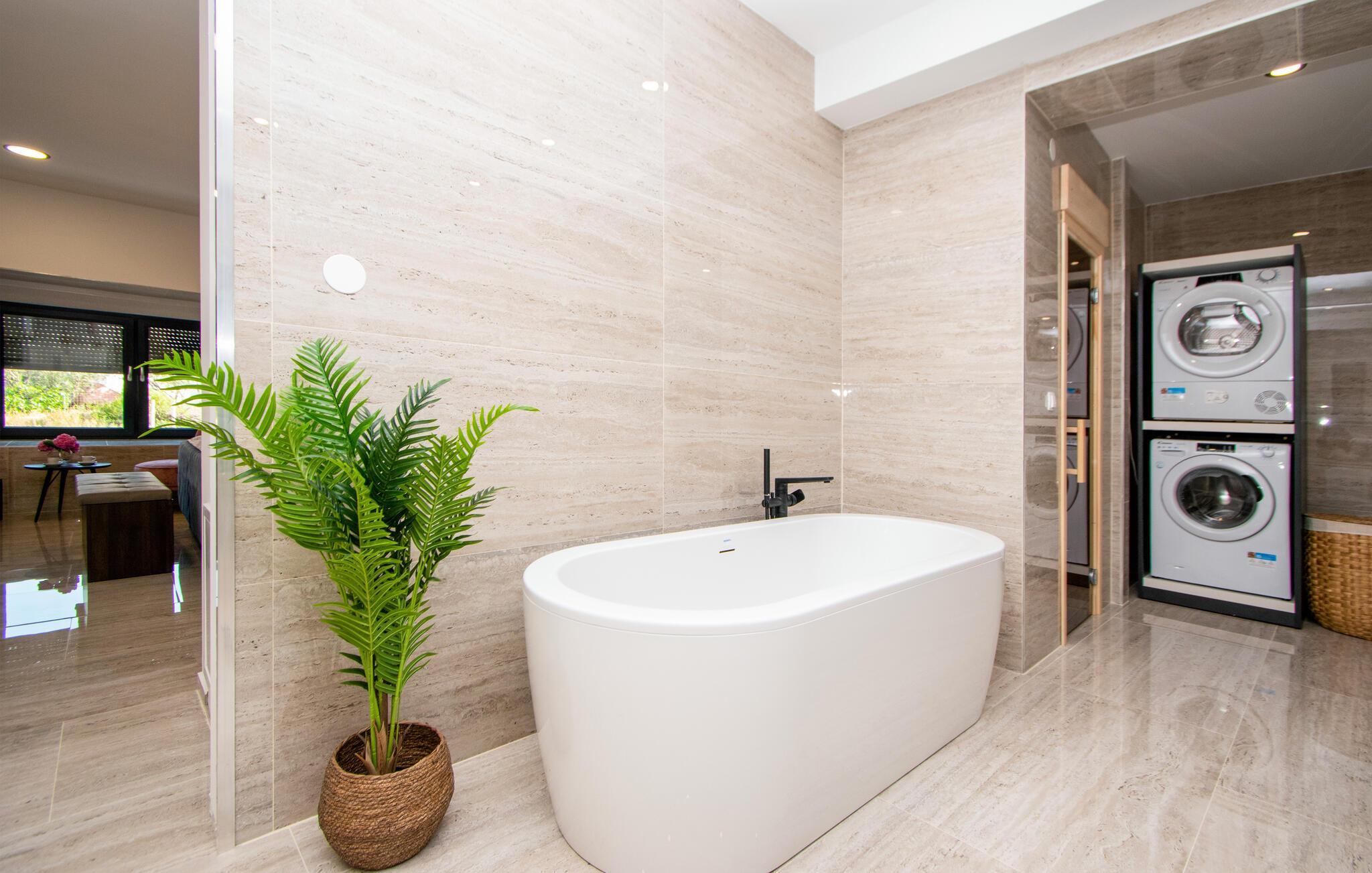 Din privata bastu i badrummet ger avkopplande stunder, medan den gemensamma poolen och bubbelpoolen i trädgården erbjuder ytterligare förfriskningar och avkoppling. Den gemensamma utomhusterrassen med grillplats inbjuder till umgänge i det fria.