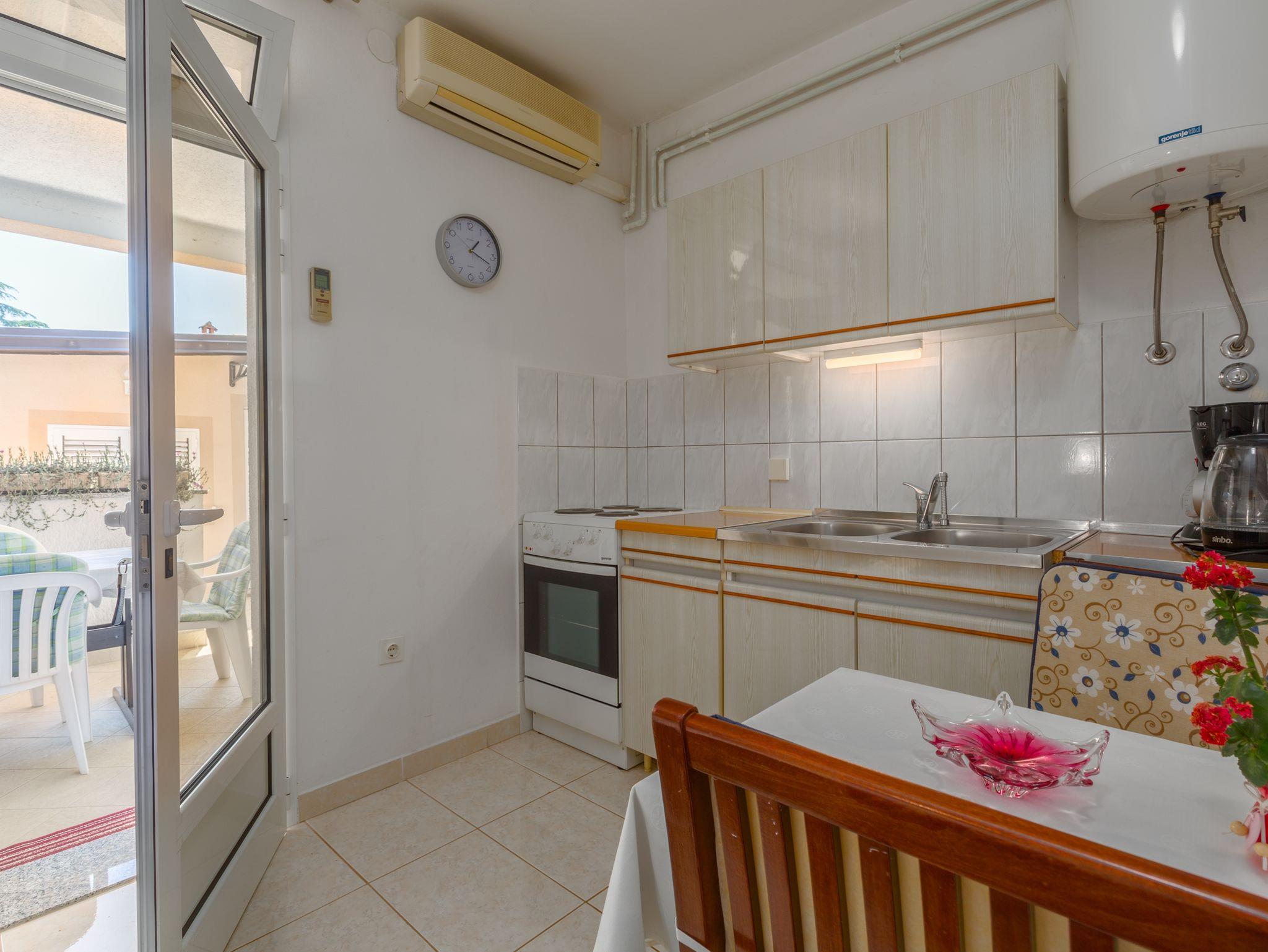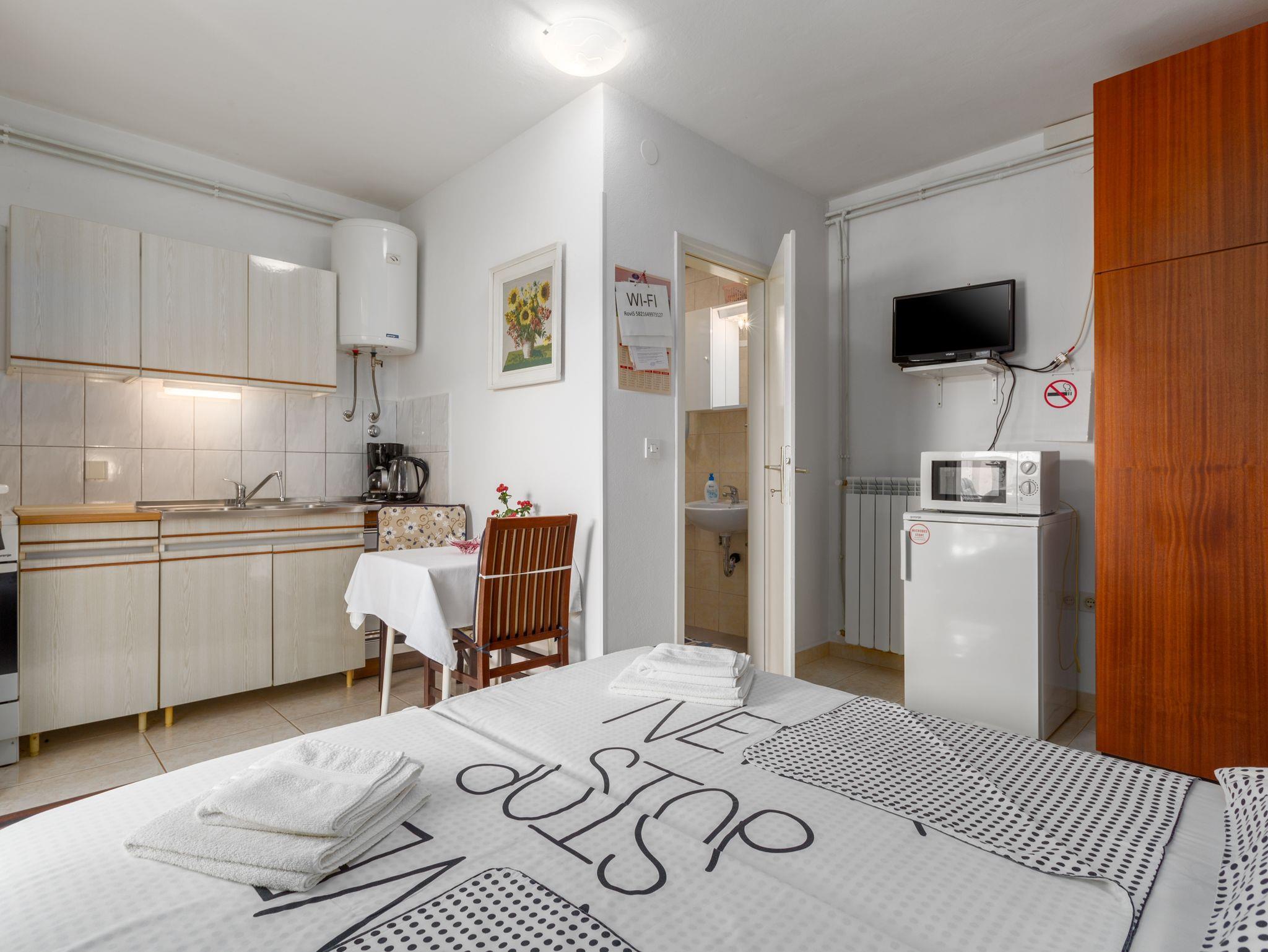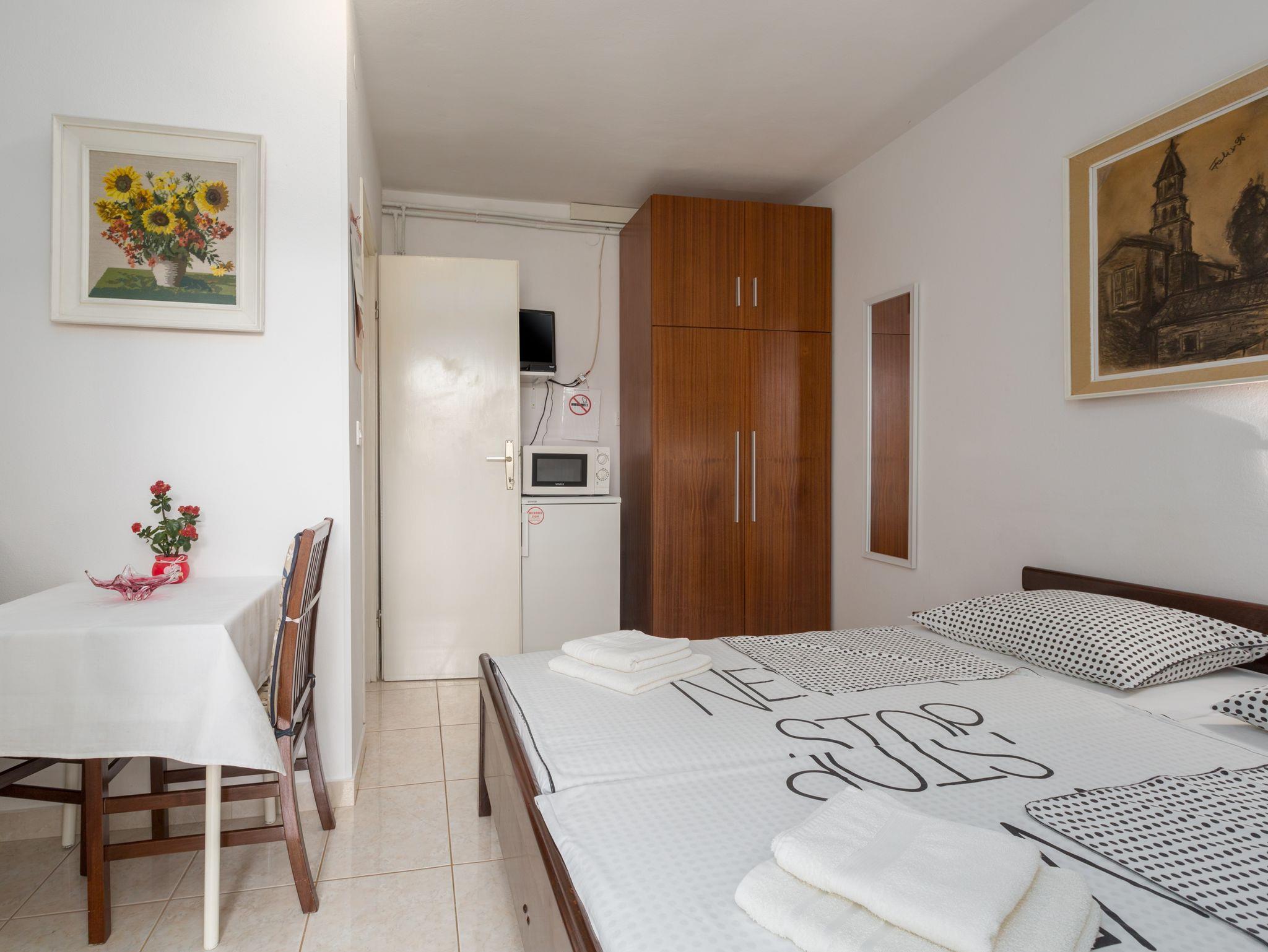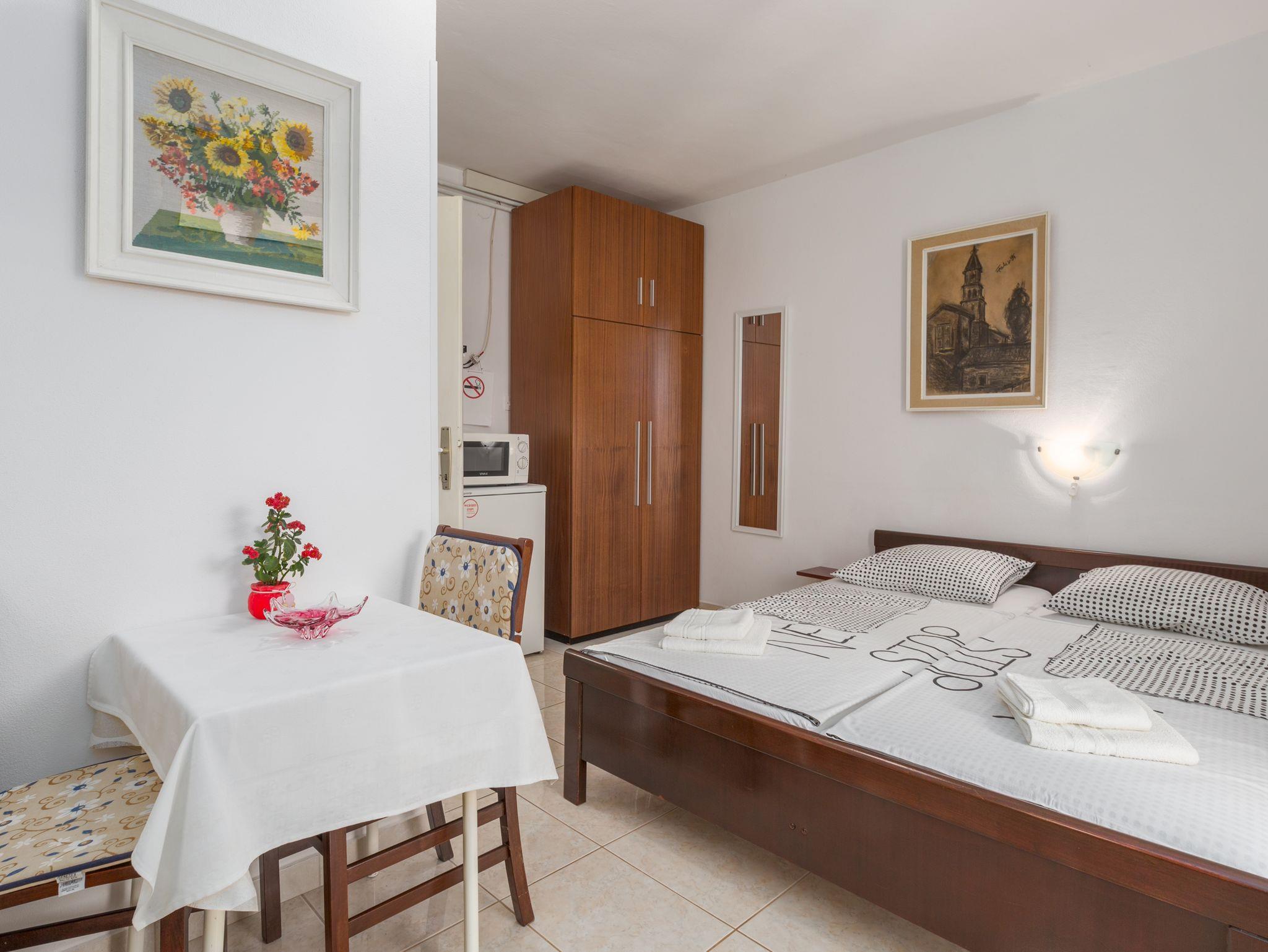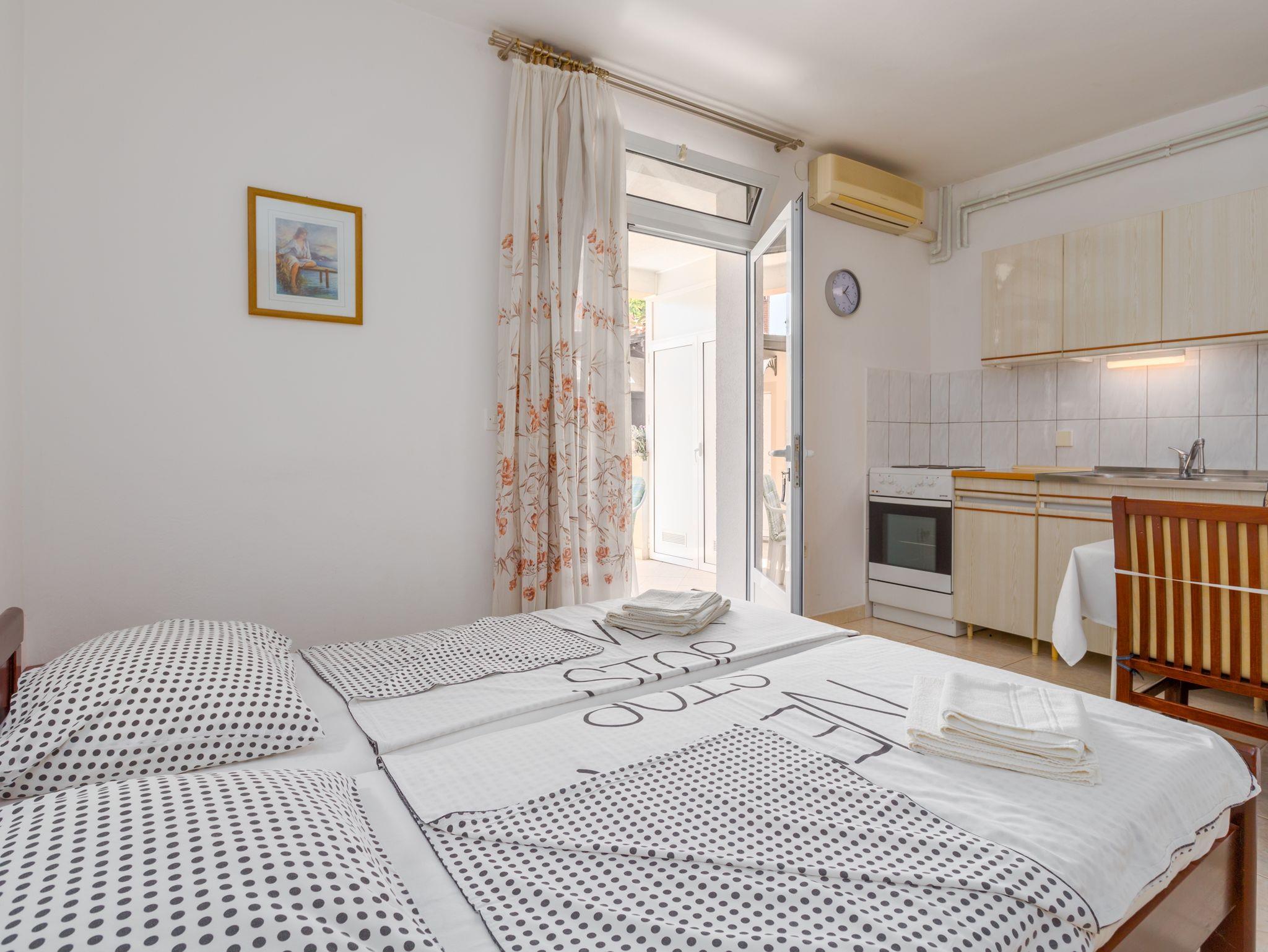 Studio bietet Platz für 2 Gäste. Die Betten sind in Schlafzimmern, die es 1 gibt, innerhalb einer Gesamtfläche von 12m2, angeordnet. Die Gäste haben eine eigene Terrasse zur Verfügung, auf der sie in warmen Sommernächten genießen können. Es ist erlaubt, Speisen auf dem Gemeinschafts-Grill vorzubereiten. In der Unterkunftseinheit besteht die Möglichkeit des Mitbringens von Haustieren gegen Aufpreis. IM PREIS INBEGRIFFEN: Kurtaxe, Endreinigung, Klimatisierung, Parkplatz, Internet, Kinderbett, Bügeleisen, Bügelbrett, Föhn. VERBINDLICHE ZUSÄTZLICHE KOSTEN: Aufzahlung für Kurzaufenthalte (prozentualer Zuschlag pro Nächtigungsanzahl: 30% - 1, 20% - 2, 10% - 3). UNVERBINDLICHE ZUSÄTZLICHE KOSTEN: Haustiere (7,00 € pro Nacht). Die Verfügbarkeit zusätzlicher Dienstleistungen in Ihrem reservierten Termin und die Preise derselben (falls nicht aufgeführt) müssen im Voraus überprüft werden. Zusätzliche Dienstleistungen die in der Zahlungsaufforderung nicht aufgeführt sind werden direkt beim Vermieter bezahlt, angenommen der Gast nutzt auch diese. Ermäßigung auf den Grundpreis: Gratistag 14=13 (bei einem Aufenthalt von 14 Tagen oder mehr erhalten Sie einen Gratistag für den Aufenthalt bis 31.12.26).