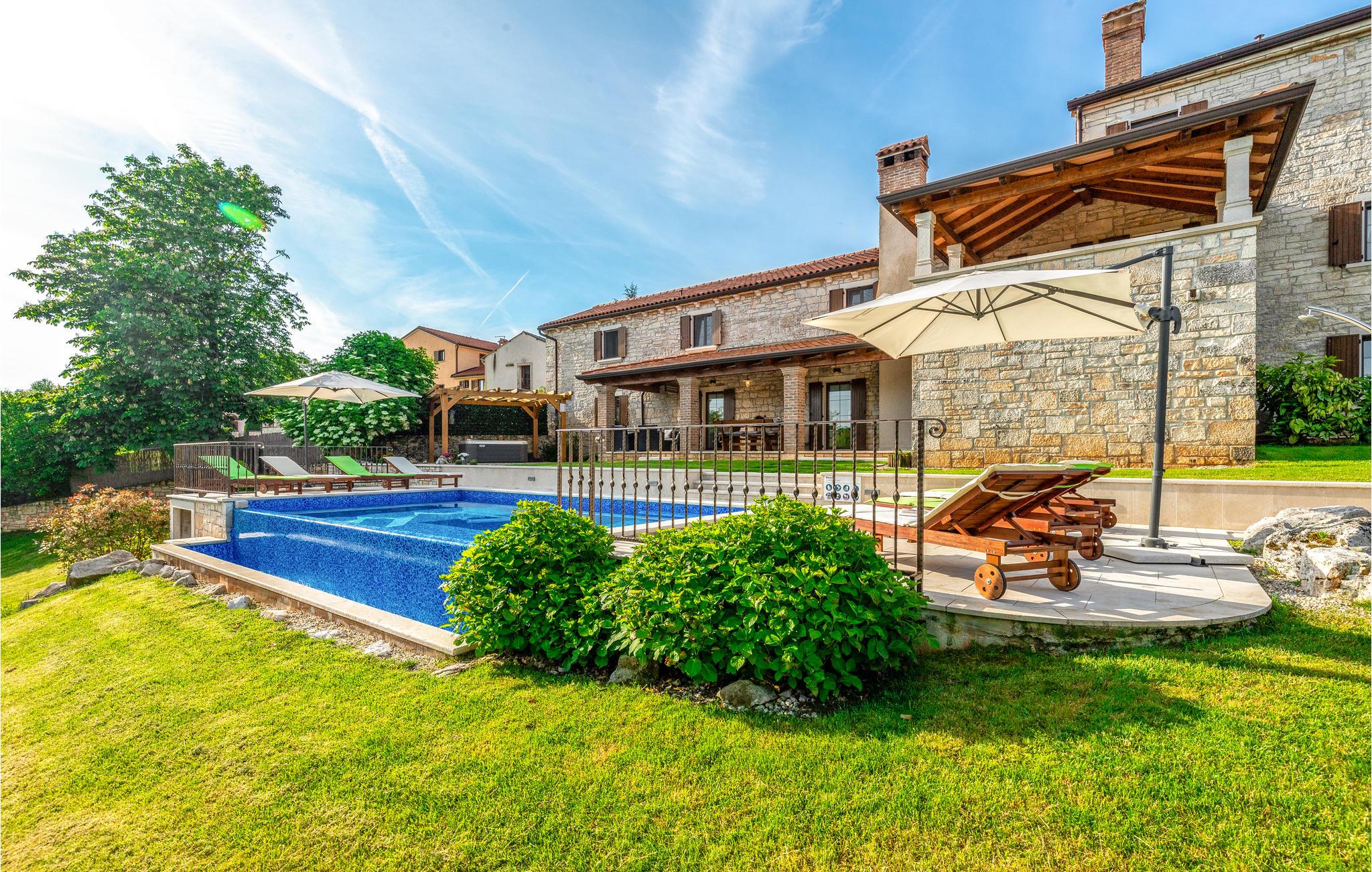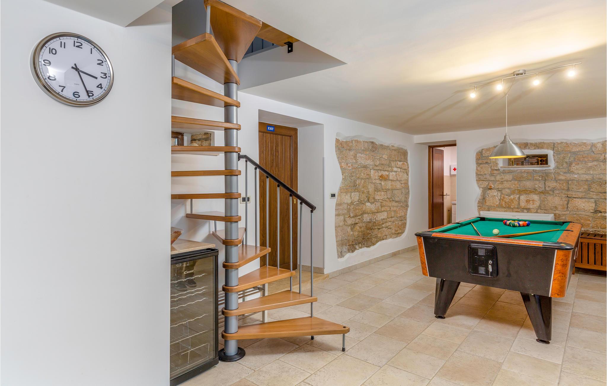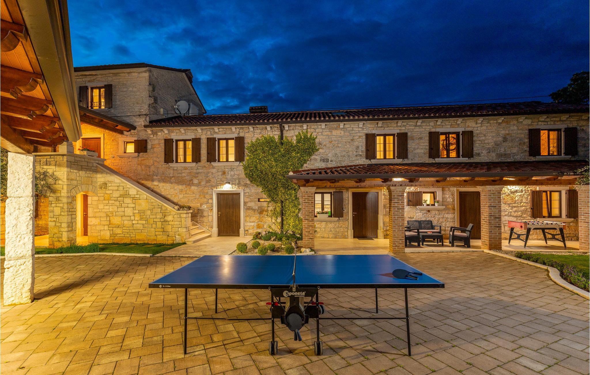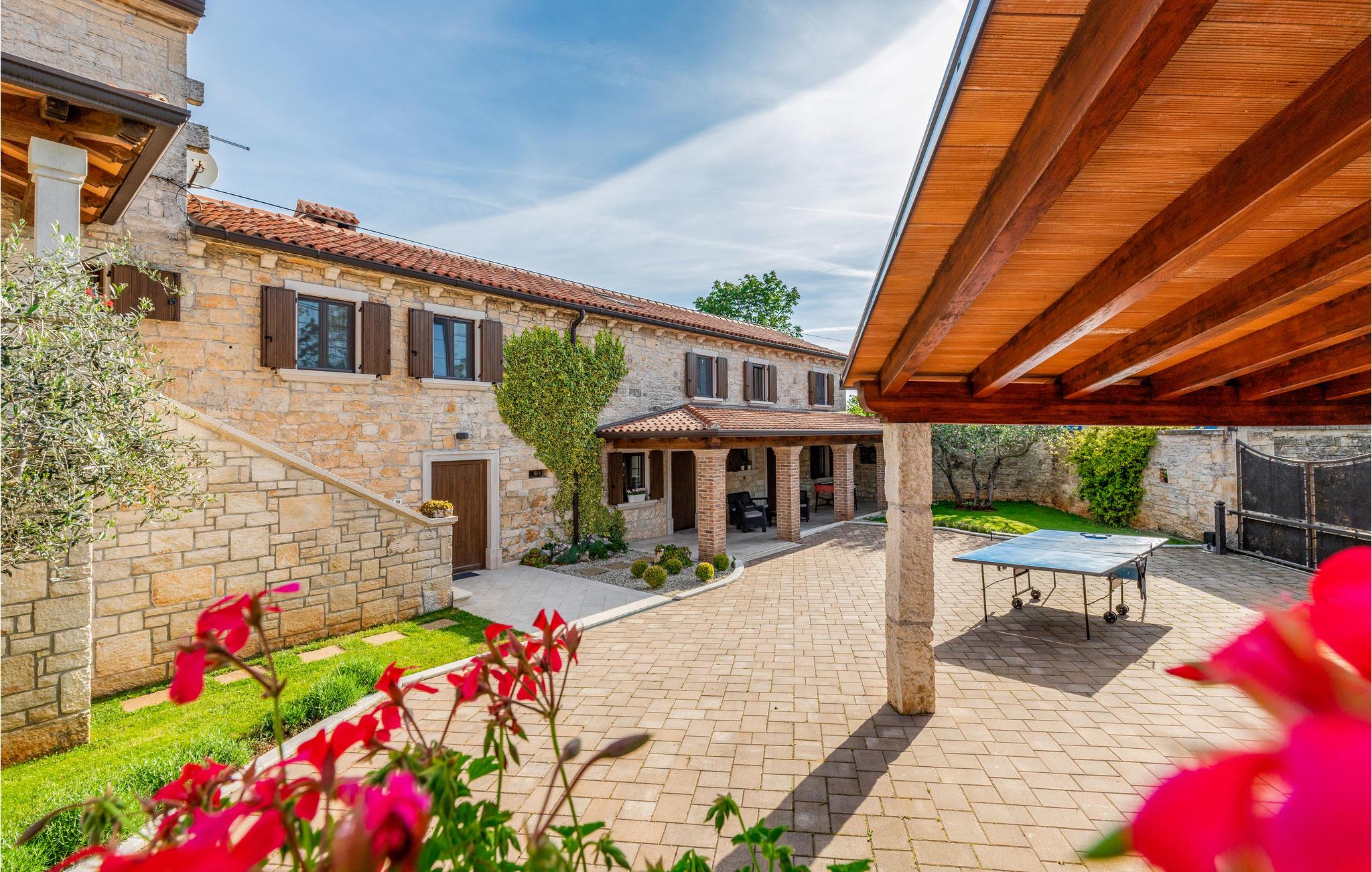 Det här vackra semesterhuset renoverades 2014 i traditionell stil. Det erbjuder mycket komfort och en vacker atmosfär. På bottenvåningen hittar du köket med matplats samt ett spelrum med biljardbord och ett stort vardagsrum med öppen spis ger mysighet. Interna trappor leder till första våningen med sovrummen och ett lekrum med PlayStation. Fastigheten är uppdelad i två delar. Den mindre delen fungerar som en täckt parkeringsplats, medan den stora delen, terrasserad i kaskader, innehåller poolen och en täckt terrass. Tillgång till denna del finns från vardagsrummet. Porec ligger 15 minuters bilresa bort.