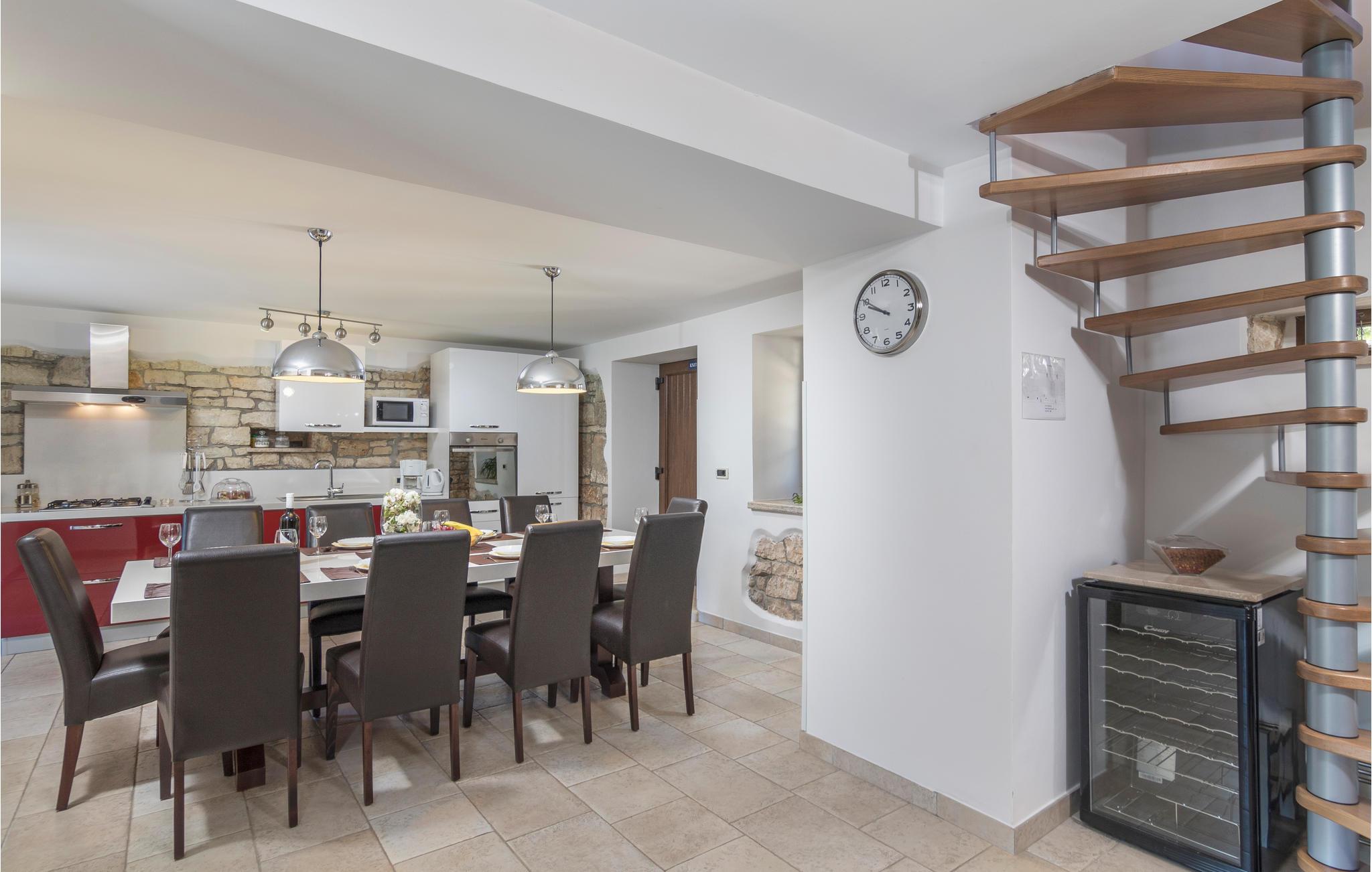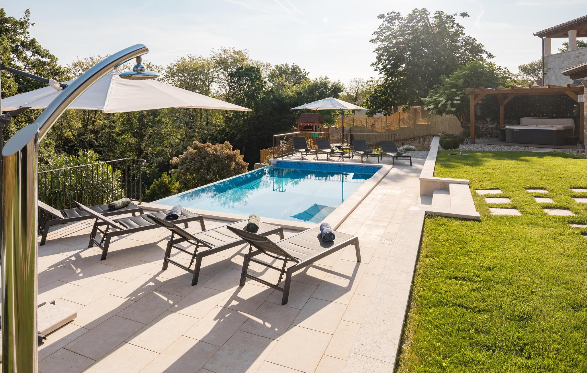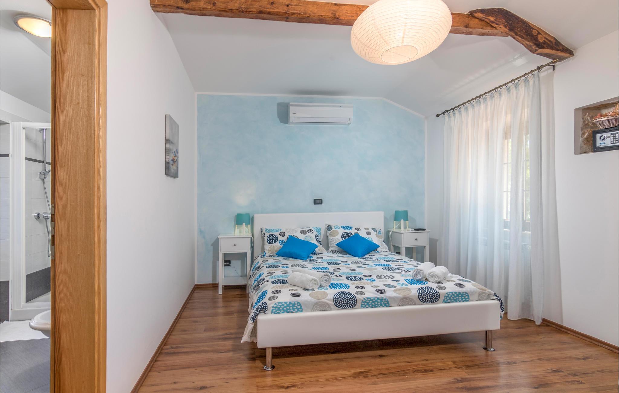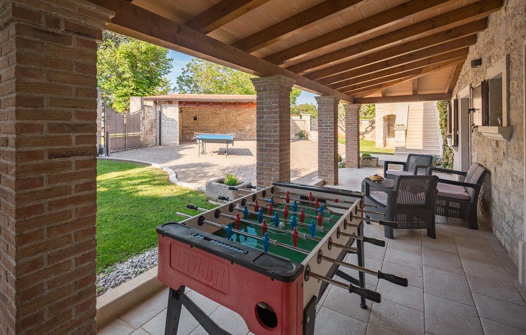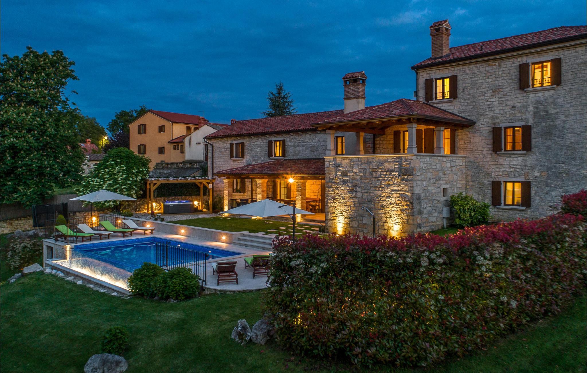 Det här vackra semesterhuset renoverades 2014 i traditionell stil. Det erbjuder mycket komfort och en vacker atmosfär. På bottenvåningen hittar du köket med matplats samt ett spelrum med biljardbord och ett stort vardagsrum med öppen spis ger mysighet. Interna trappor leder till första våningen med sovrummen och ett lekrum med PlayStation. Fastigheten är uppdelad i två delar. Den mindre delen fungerar som en täckt parkeringsplats, medan den stora delen, terrasserad i kaskader, innehåller poolen och en täckt terrass. Tillgång till denna del finns från vardagsrummet. Porec ligger 15 minuters bilresa bort.