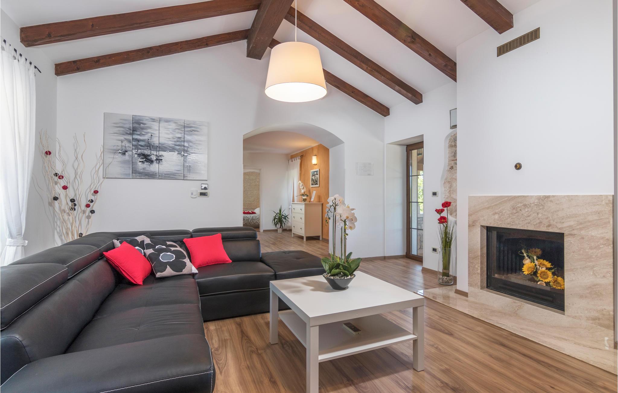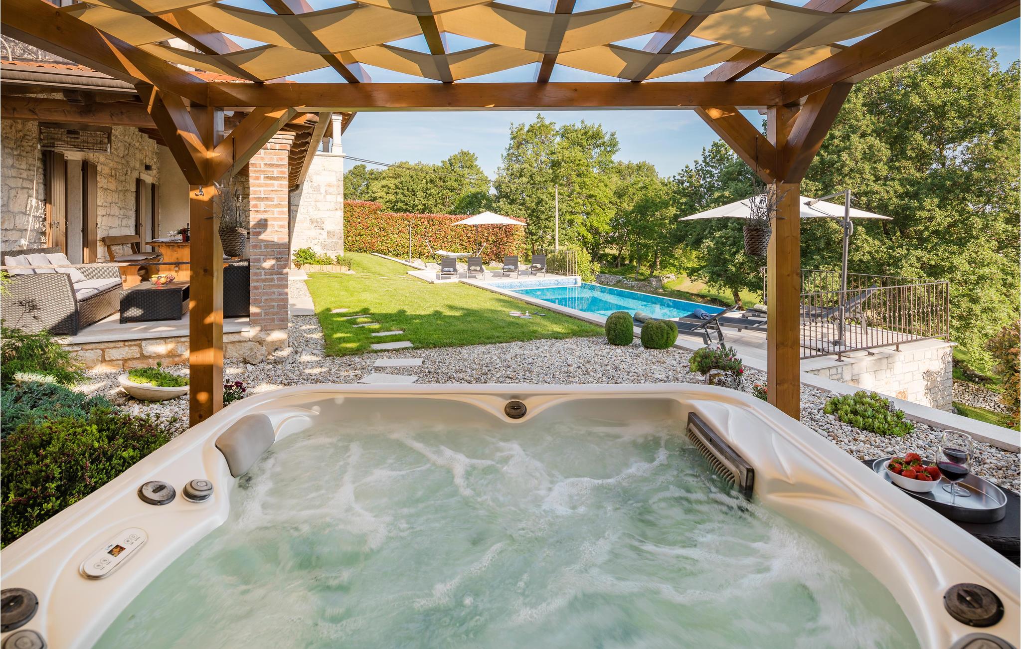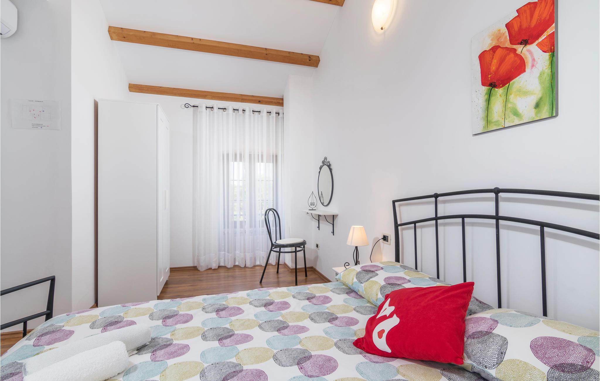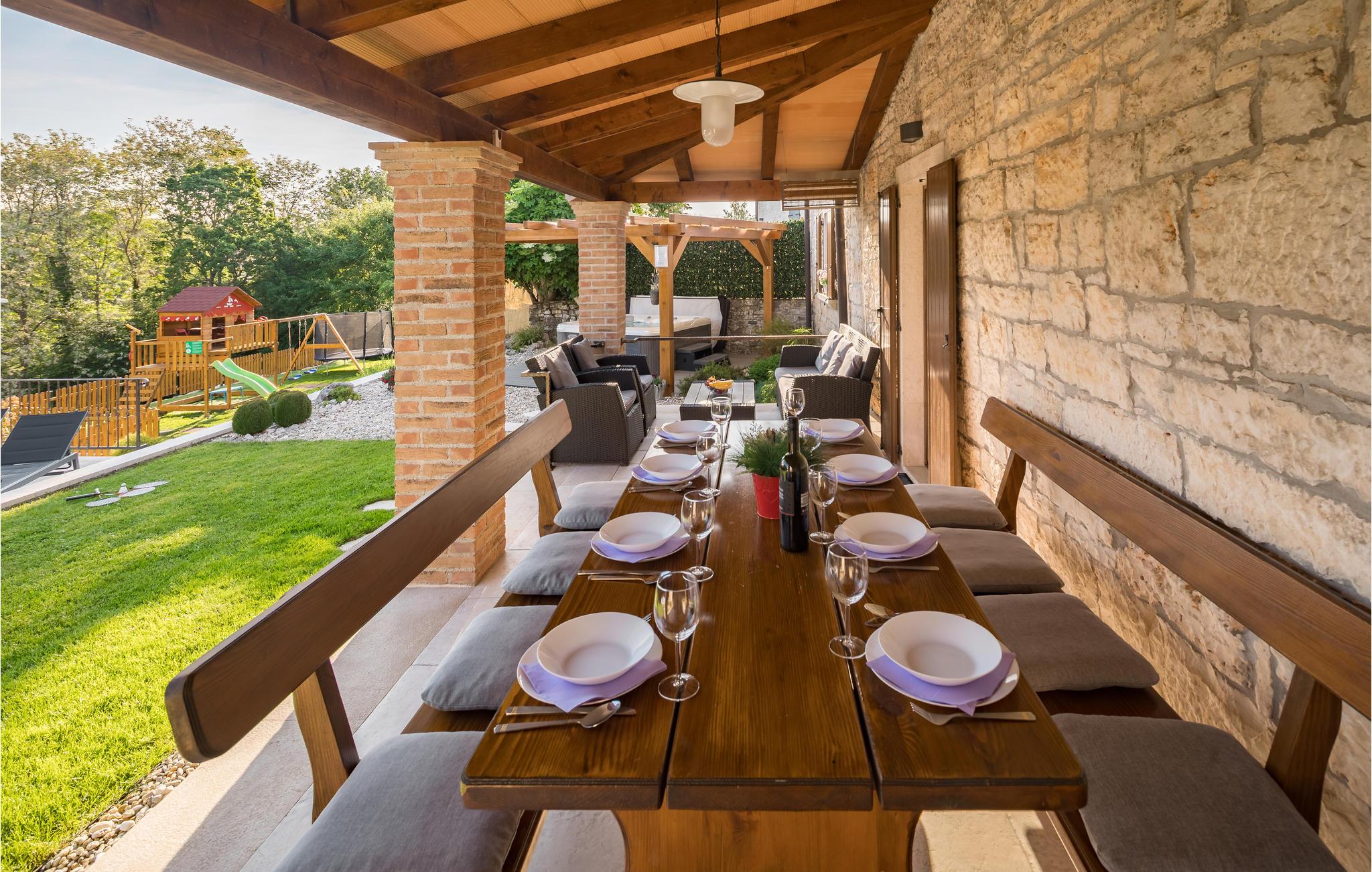 Det här vackra semesterhuset renoverades 2014 i traditionell stil. Det erbjuder mycket komfort och en vacker atmosfär. På bottenvåningen hittar du köket med matplats samt ett spelrum med biljardbord och ett stort vardagsrum med öppen spis ger mysighet. Interna trappor leder till första våningen med sovrummen och ett lekrum med PlayStation. Fastigheten är uppdelad i två delar. Den mindre delen fungerar som en täckt parkeringsplats, medan den stora delen, terrasserad i kaskader, innehåller poolen och en täckt terrass. Tillgång till denna del finns från vardagsrummet. Porec ligger 15 minuters bilresa bort.
