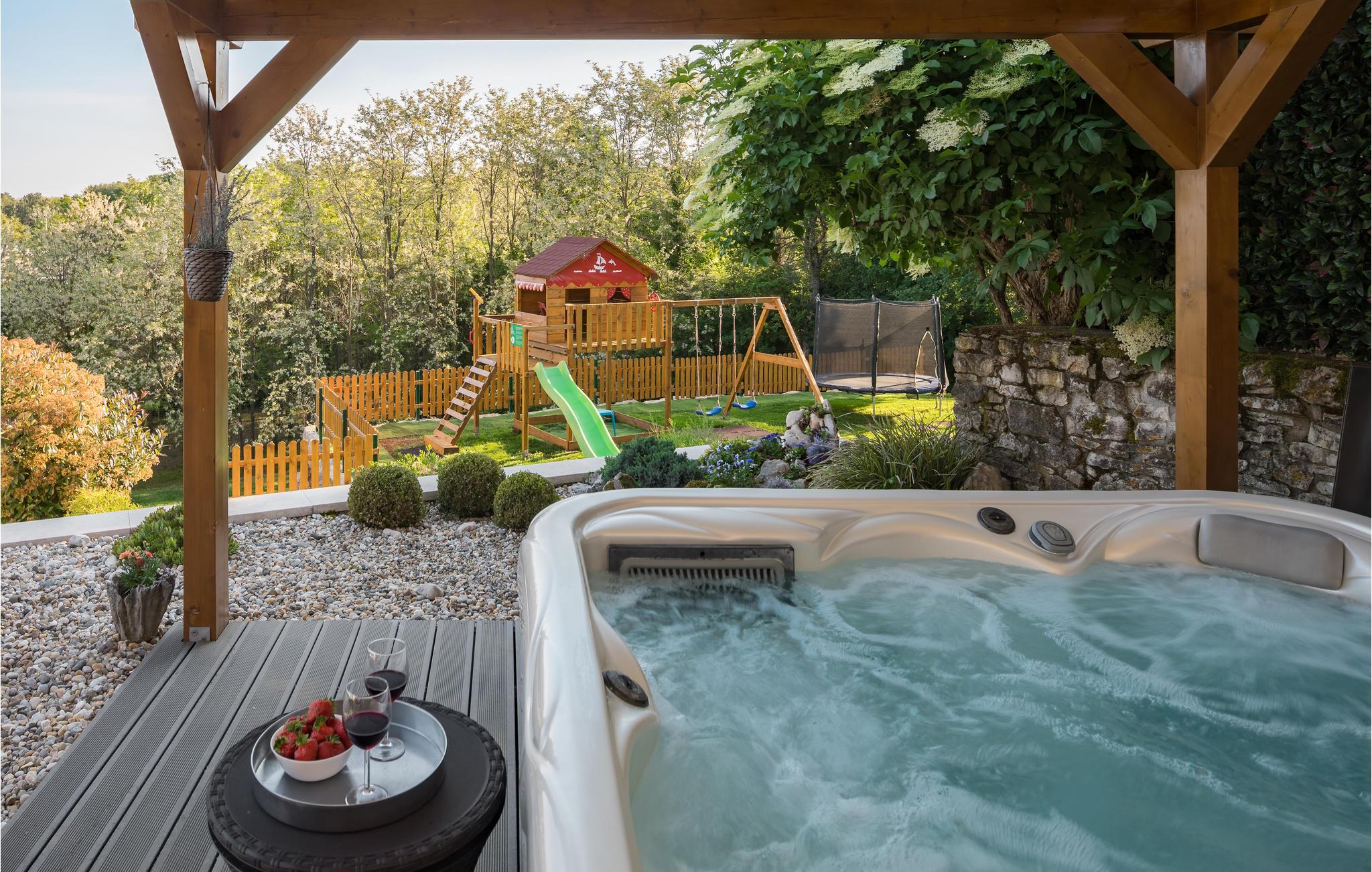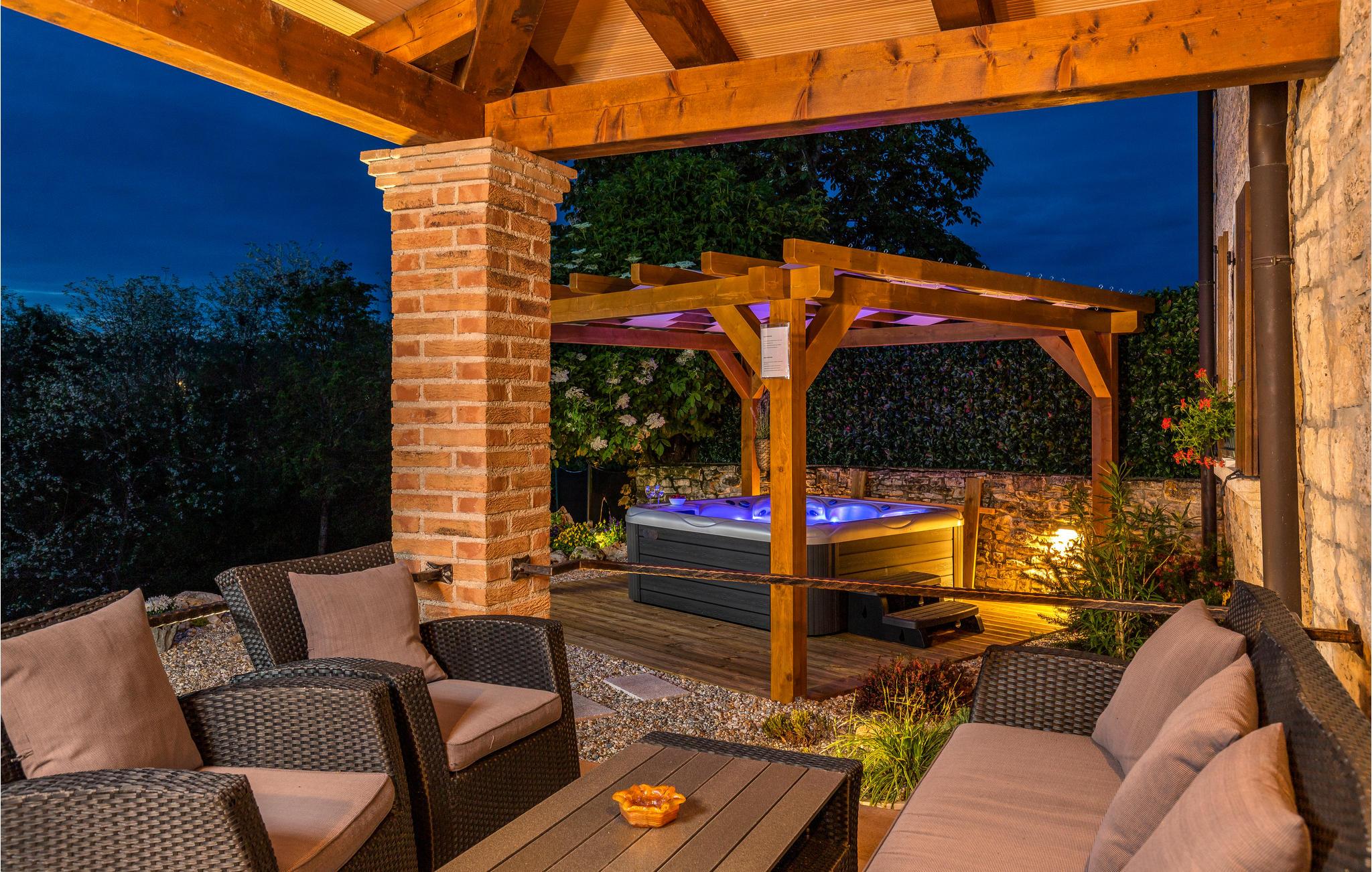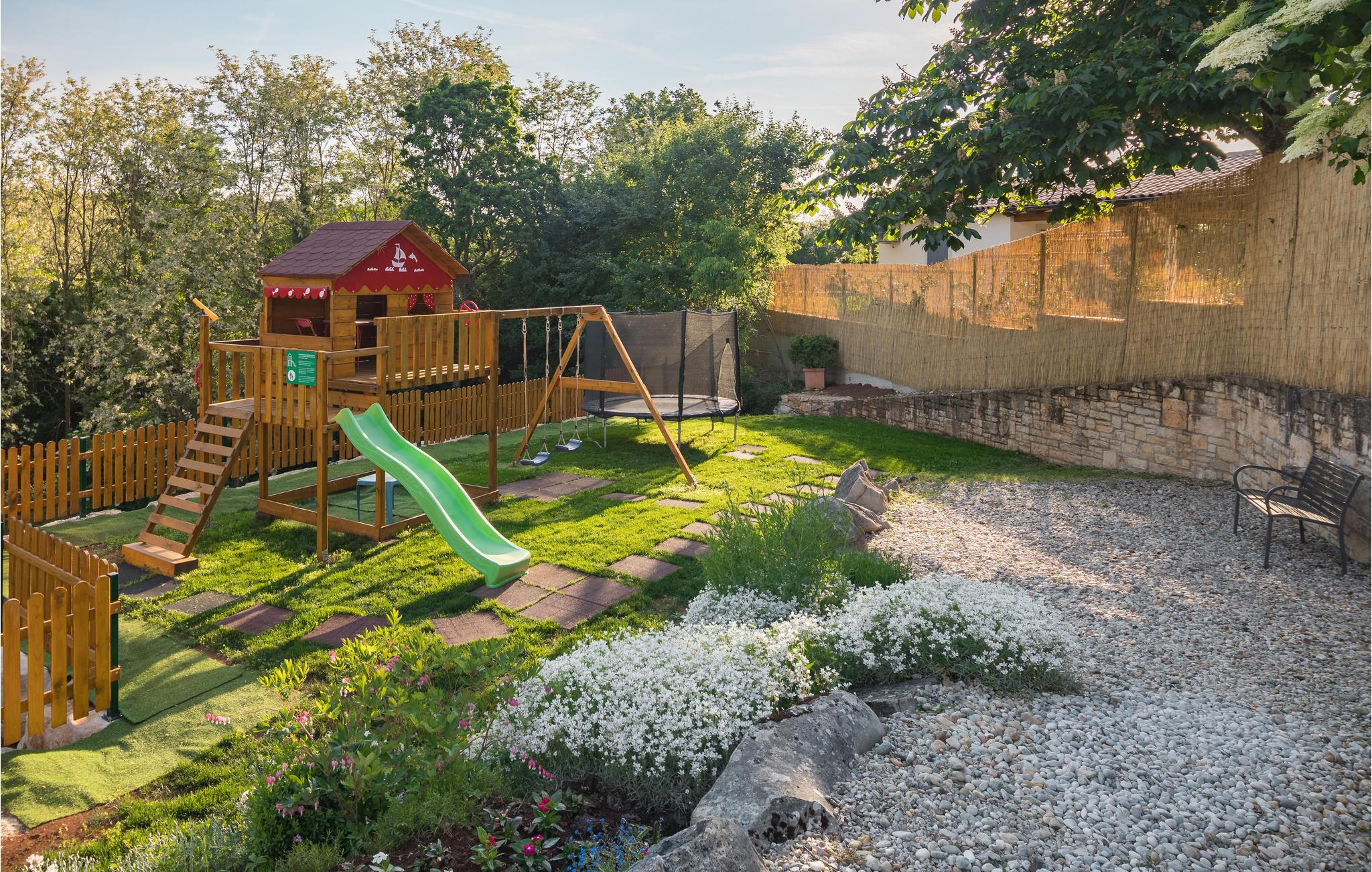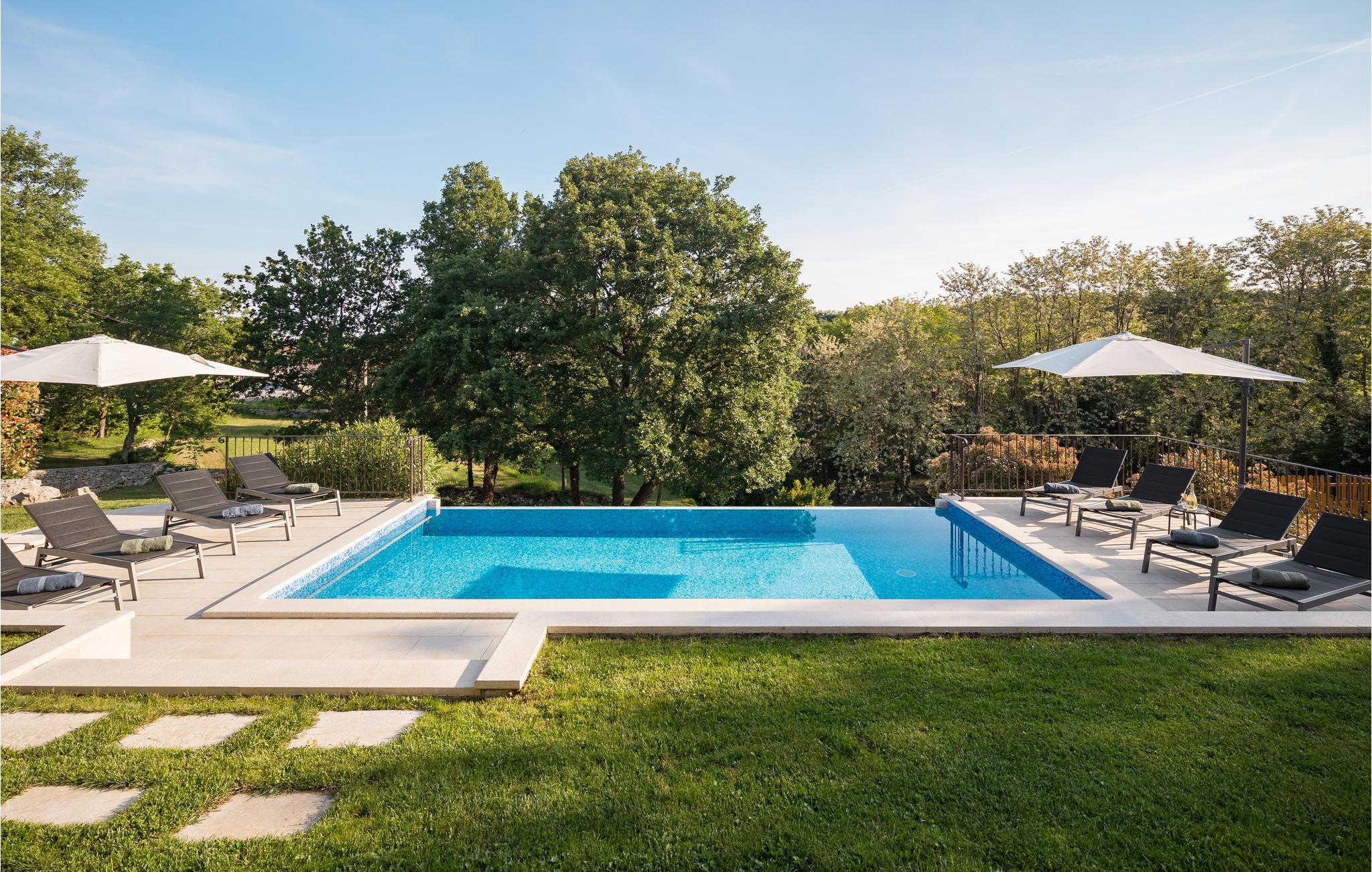 Det här vackra semesterhuset renoverades 2014 i traditionell stil. Det erbjuder mycket komfort och en vacker atmosfär. På bottenvåningen hittar du köket med matplats samt ett spelrum med biljardbord och ett stort vardagsrum med öppen spis ger mysighet. Interna trappor leder till första våningen med sovrummen och ett lekrum med PlayStation. Fastigheten är uppdelad i två delar. Den mindre delen fungerar som en täckt parkeringsplats, medan den stora delen, terrasserad i kaskader, innehåller poolen och en täckt terrass. Tillgång till denna del finns från vardagsrummet. Porec ligger 15 minuters bilresa bort.